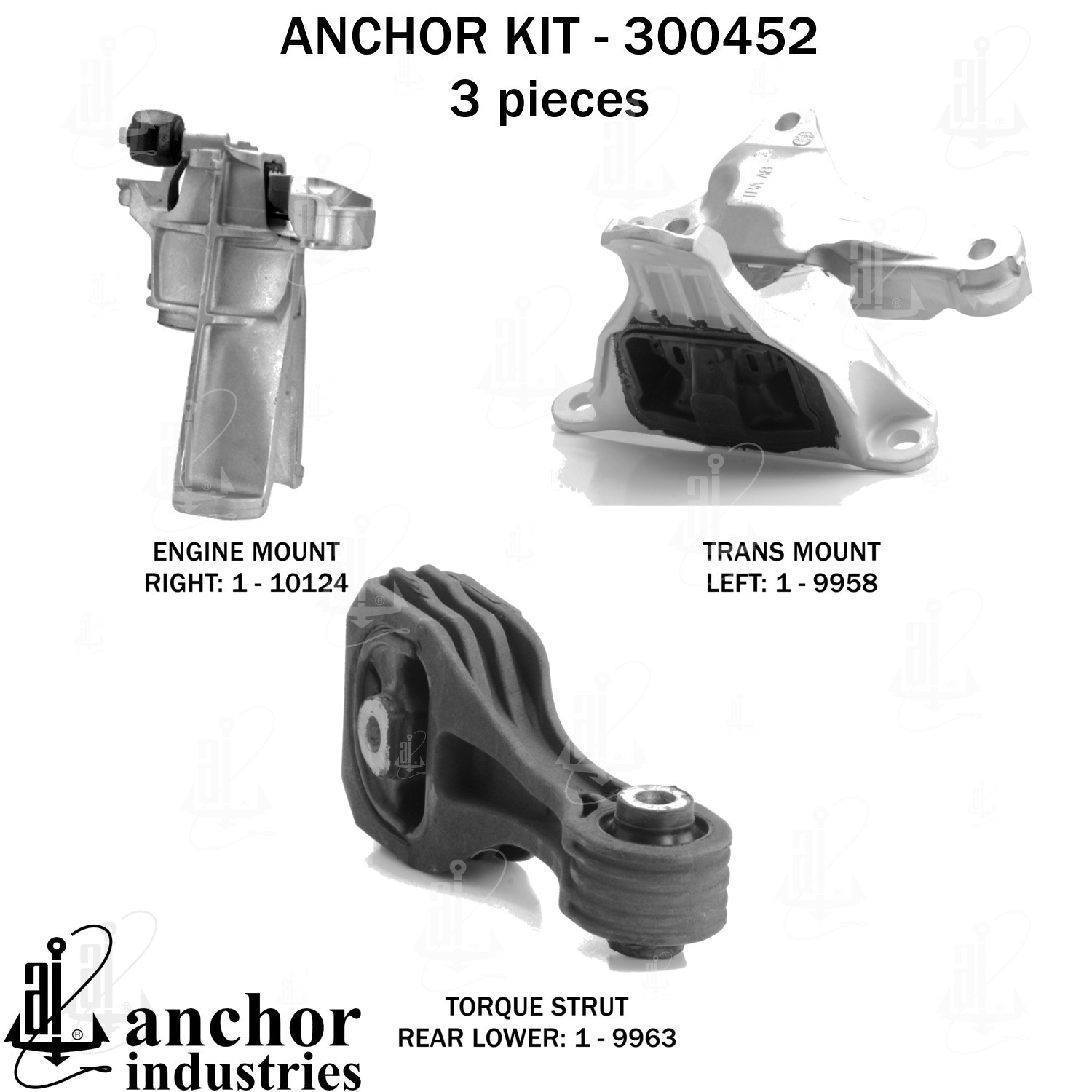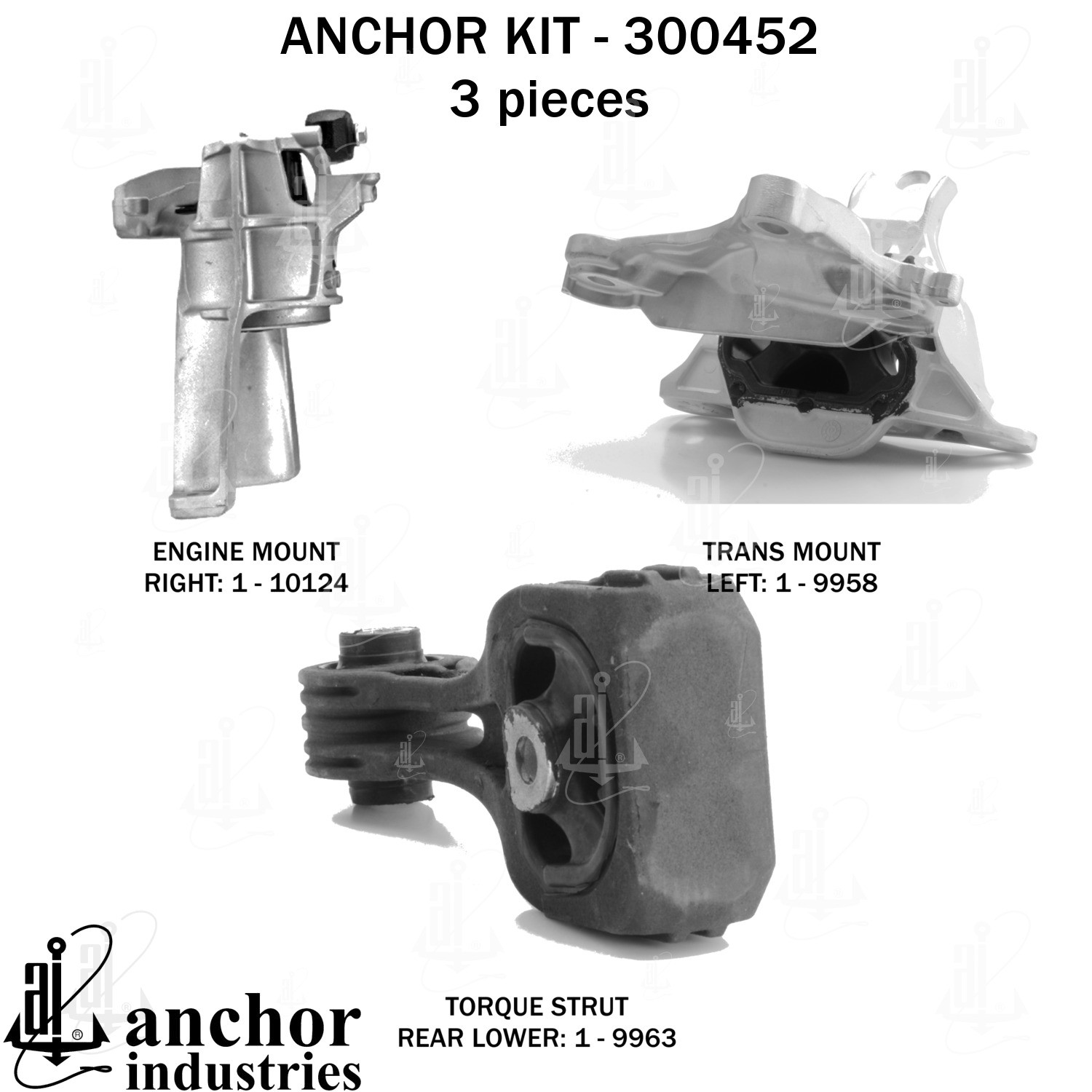 - Anchor 300452; ENGINE MNT KIT ; Each part of this kit is specifically engineered and manufactured to meet or exceed OE standards to ensure perfect fit and function. Natural and SBR rubber provide maximum life and performance. Steel fasteners are heat treated grade 5 bolts. A special bonding agent is used to ensure a rubber to metal bond. Rubber material is mixed to specific Durometer, hardness. 12 Month Warranty.