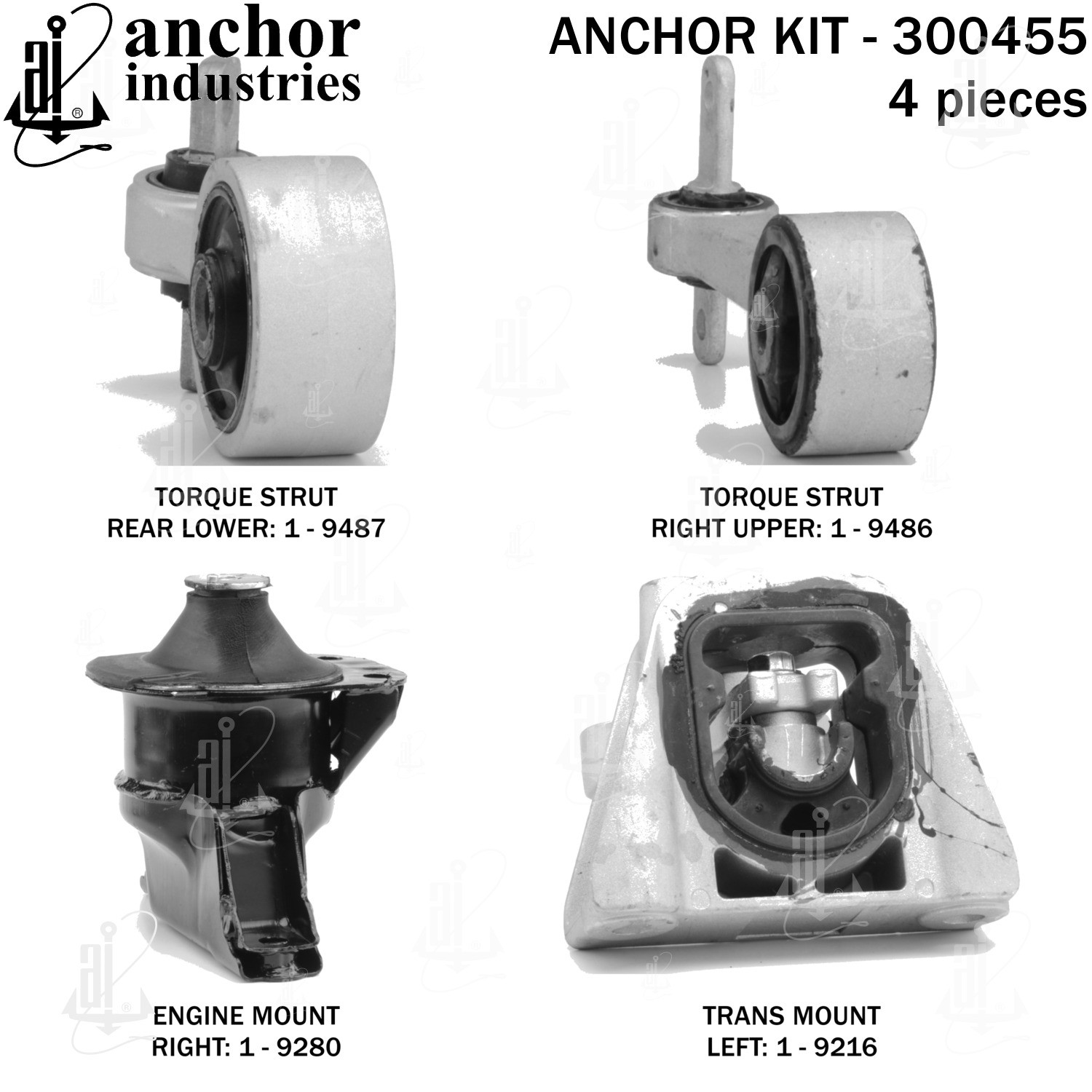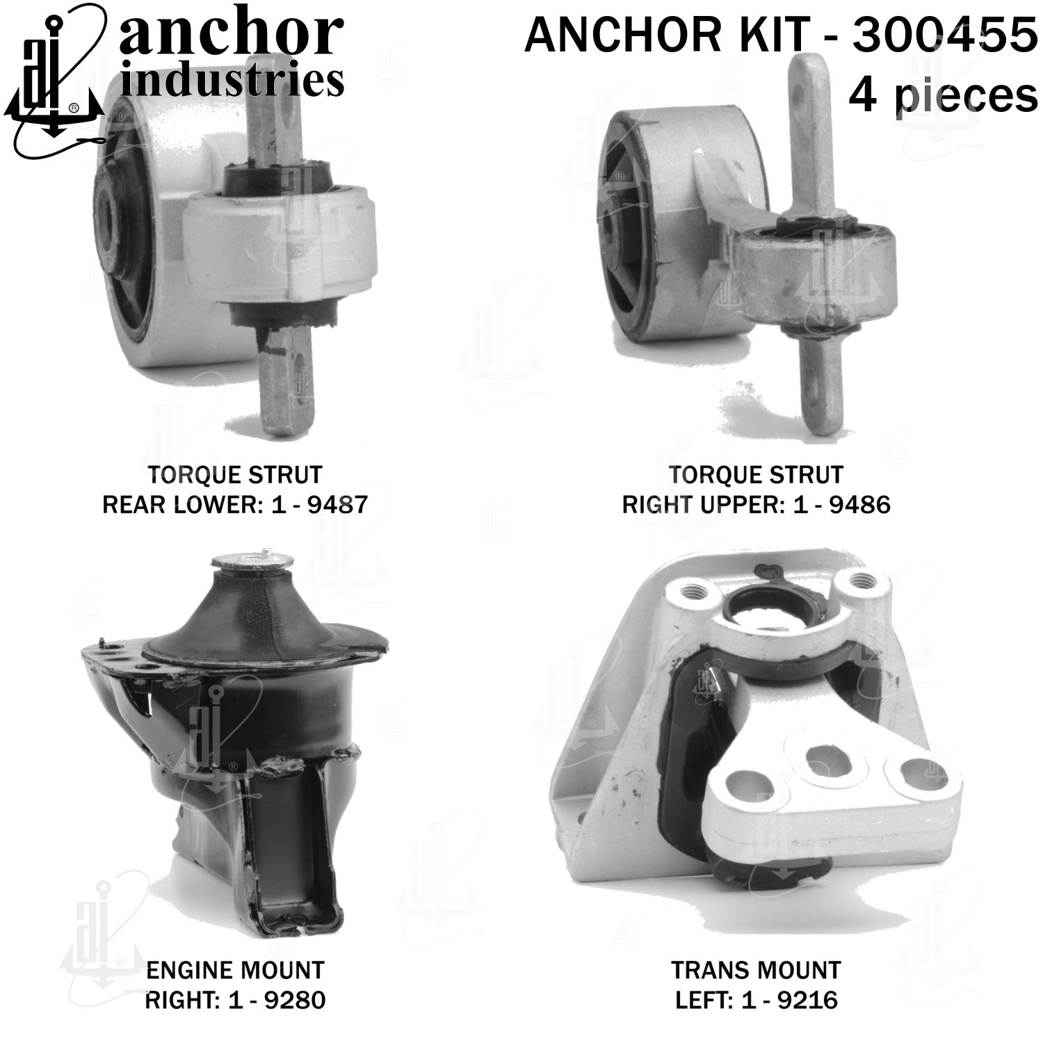 - Anchor 300455; ENGINE MNT KIT ; Each part of this kit is specifically engineered and manufactured to meet or exceed OE standards to ensure perfect fit and function. Natural and SBR rubber provide maximum life and performance. Steel fasteners are heat treated grade 5 bolts. A special bonding agent is used to ensure a rubber to metal bond. Rubber material is mixed to specific Durometer, hardness. 12 Month Warranty.