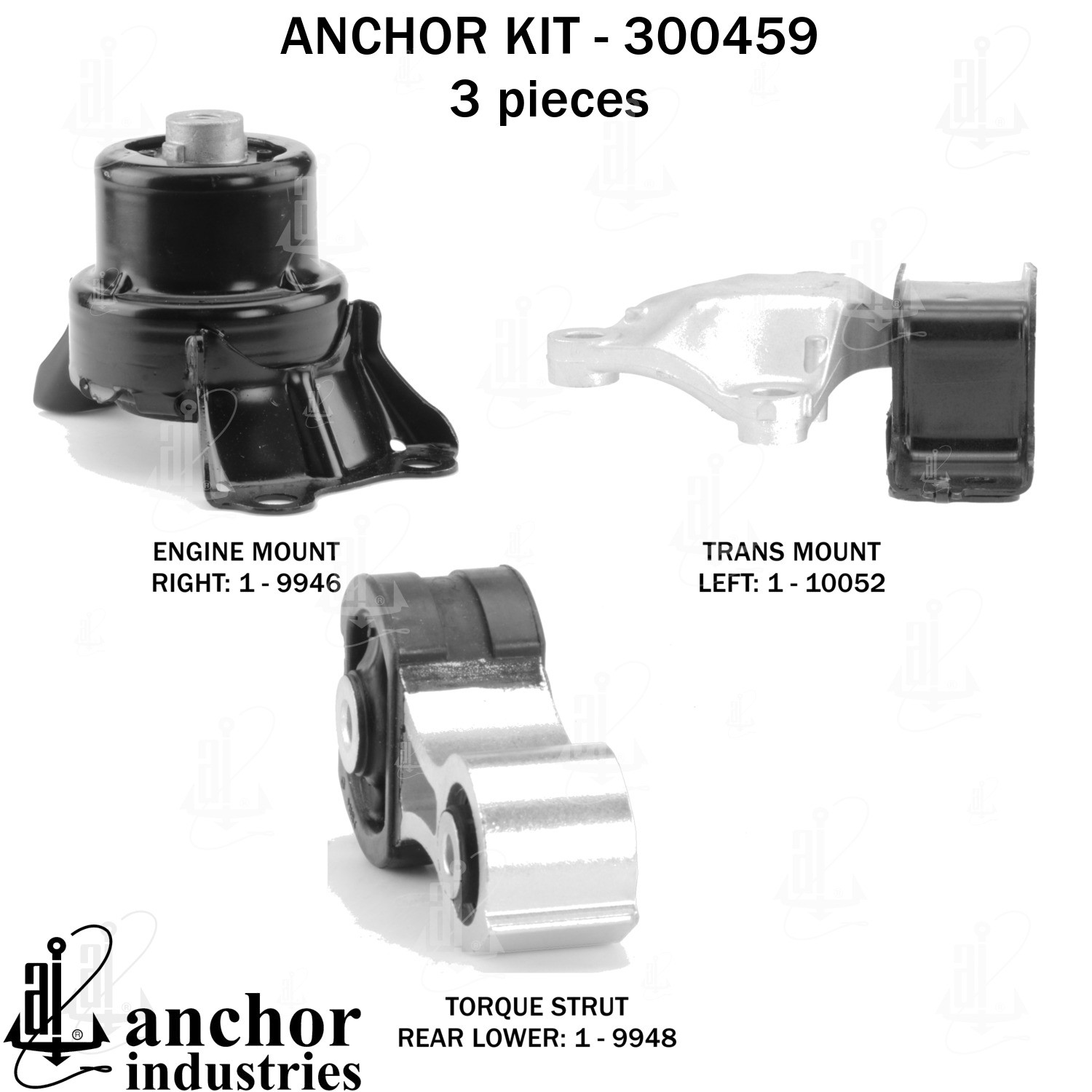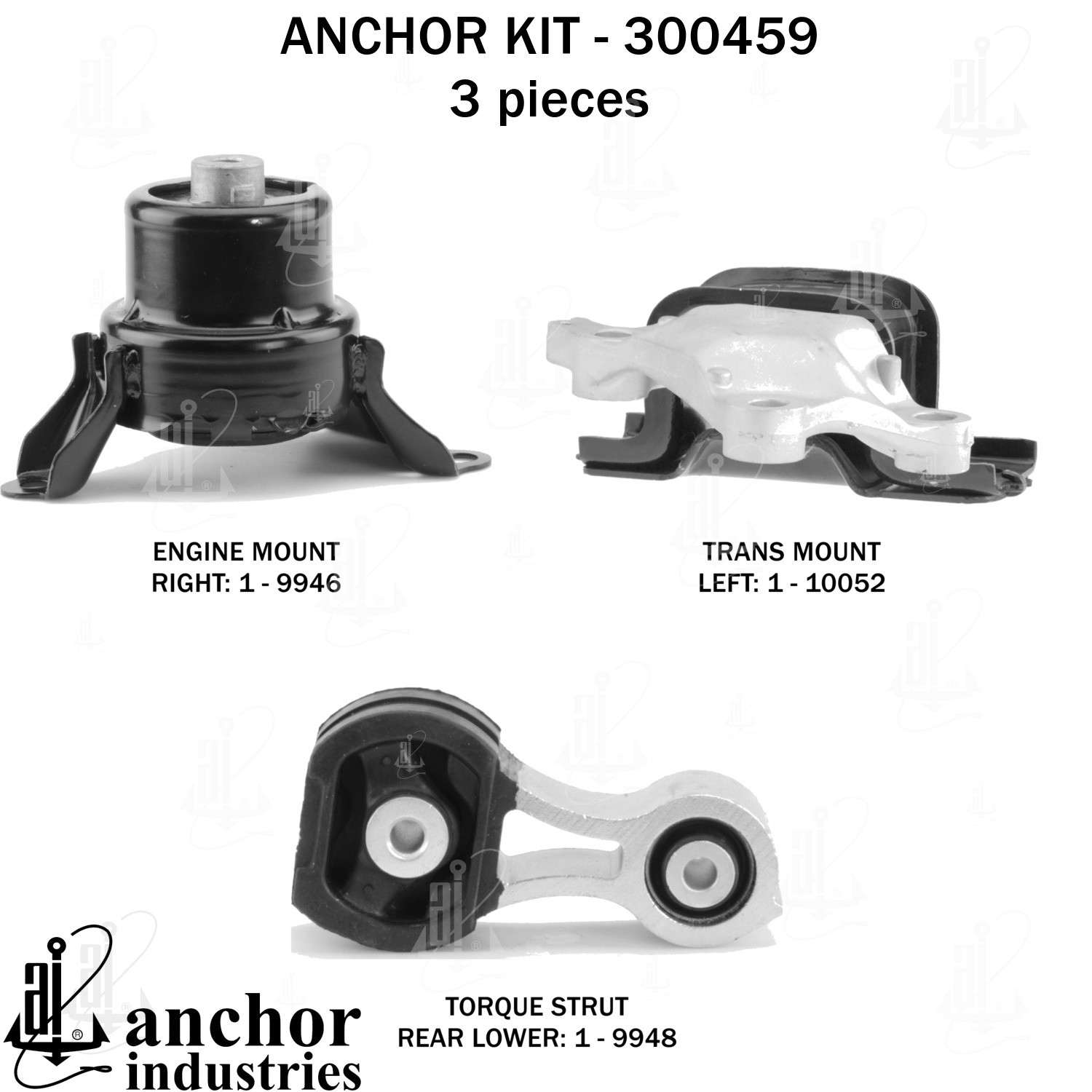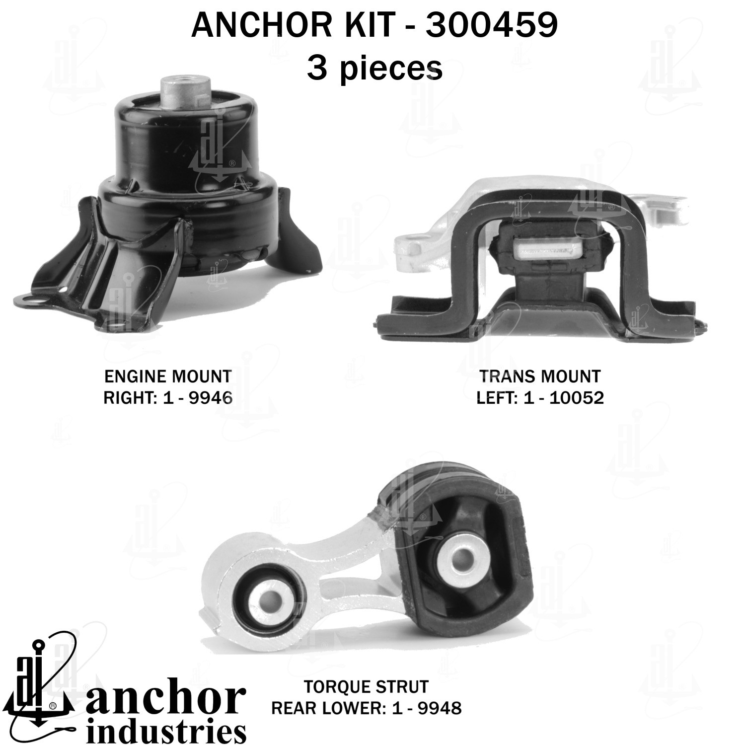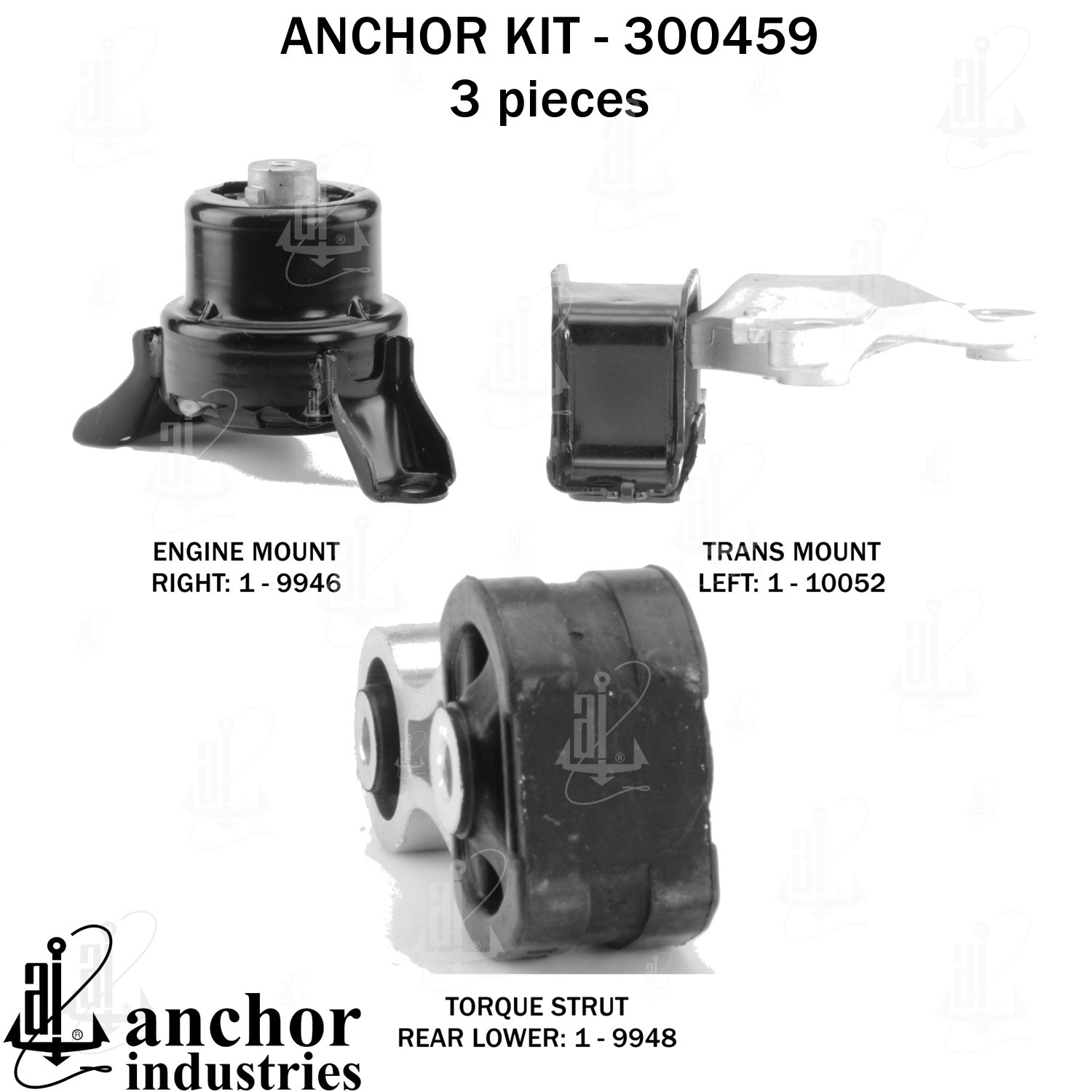 - Anchor 300459; ENGINE MNT KIT ; Each part of this kit is specifically engineered and manufactured to meet or exceed OE standards to ensure perfect fit and function. Natural and SBR rubber provide maximum life and performance. Steel fasteners are heat treated grade 5 bolts. A special bonding agent is used to ensure a rubber to metal bond. Rubber material is mixed to specific Durometer, hardness. 12 Month Warranty.