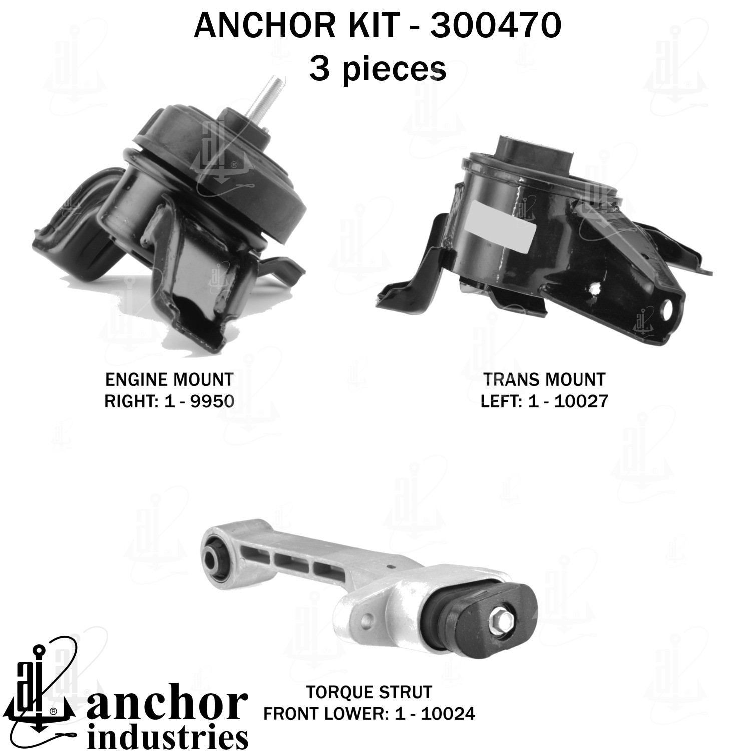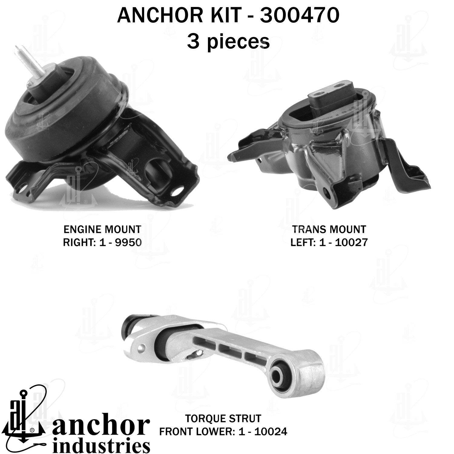- Anchor 300470; ENGINE MNT KIT ; Each part of this kit is specifically engineered and manufactured to meet or exceed OE standards to ensure perfect fit and function. Natural and SBR rubber provide maximum life and performance. Steel fasteners are heat treated grade 5 bolts. A special bonding agent is used to ensure a rubber to metal bond. Rubber material is mixed to specific Durometer, hardness. 12 Month Warranty.