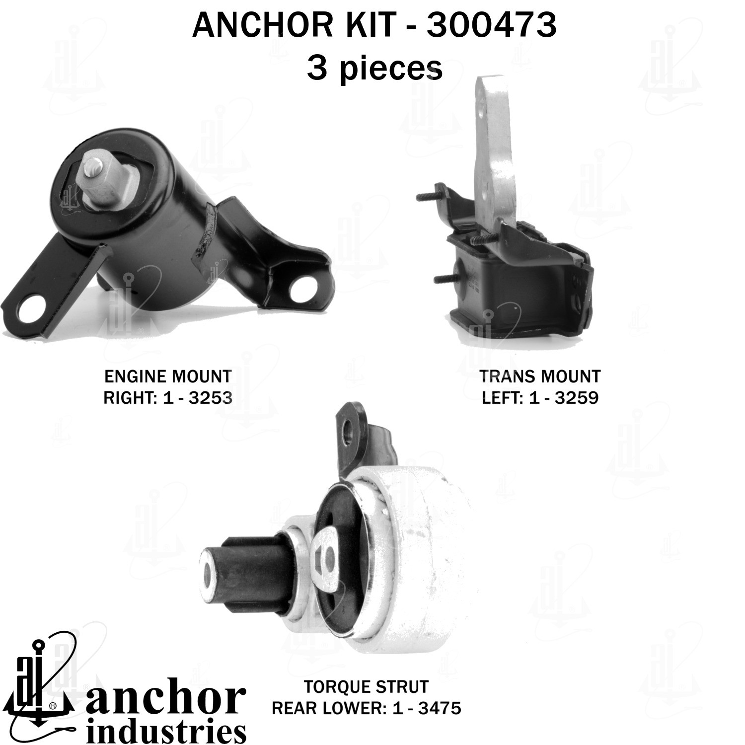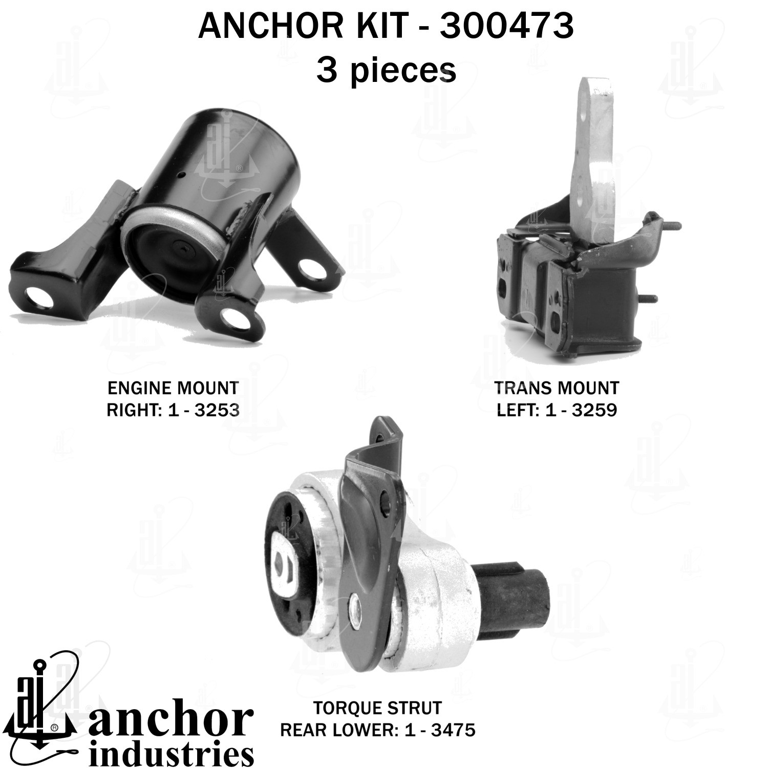 - Anchor 300473; ENGINE MNT KIT ; Each part of this kit is specifically engineered and manufactured to meet or exceed OE standards to ensure perfect fit and function. Natural and SBR rubber provide maximum life and performance. Steel fasteners are heat treated grade 5 bolts. A special bonding agent is used to ensure a rubber to metal bond. Rubber material is mixed to specific Durometer, hardness. 12 Month Warranty.