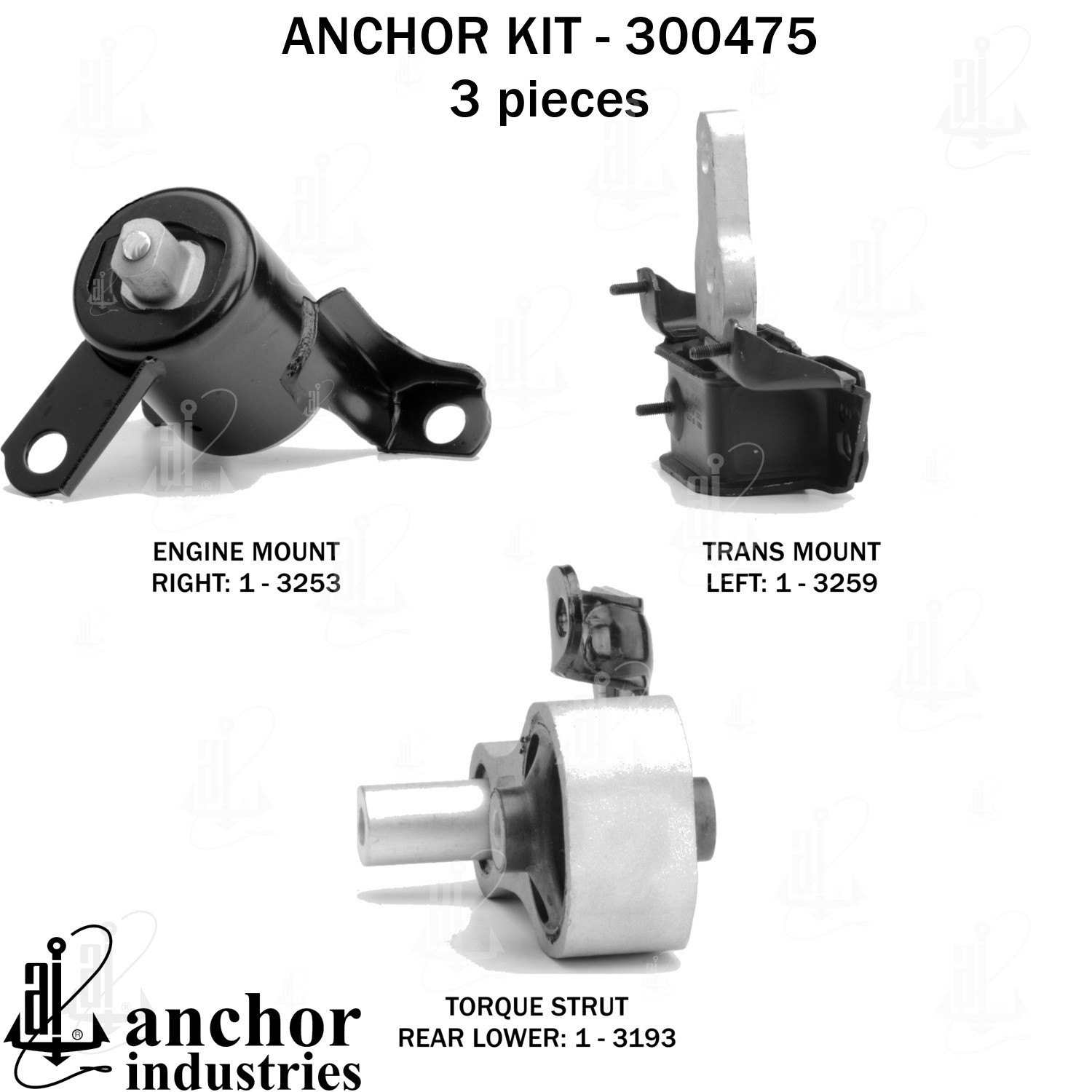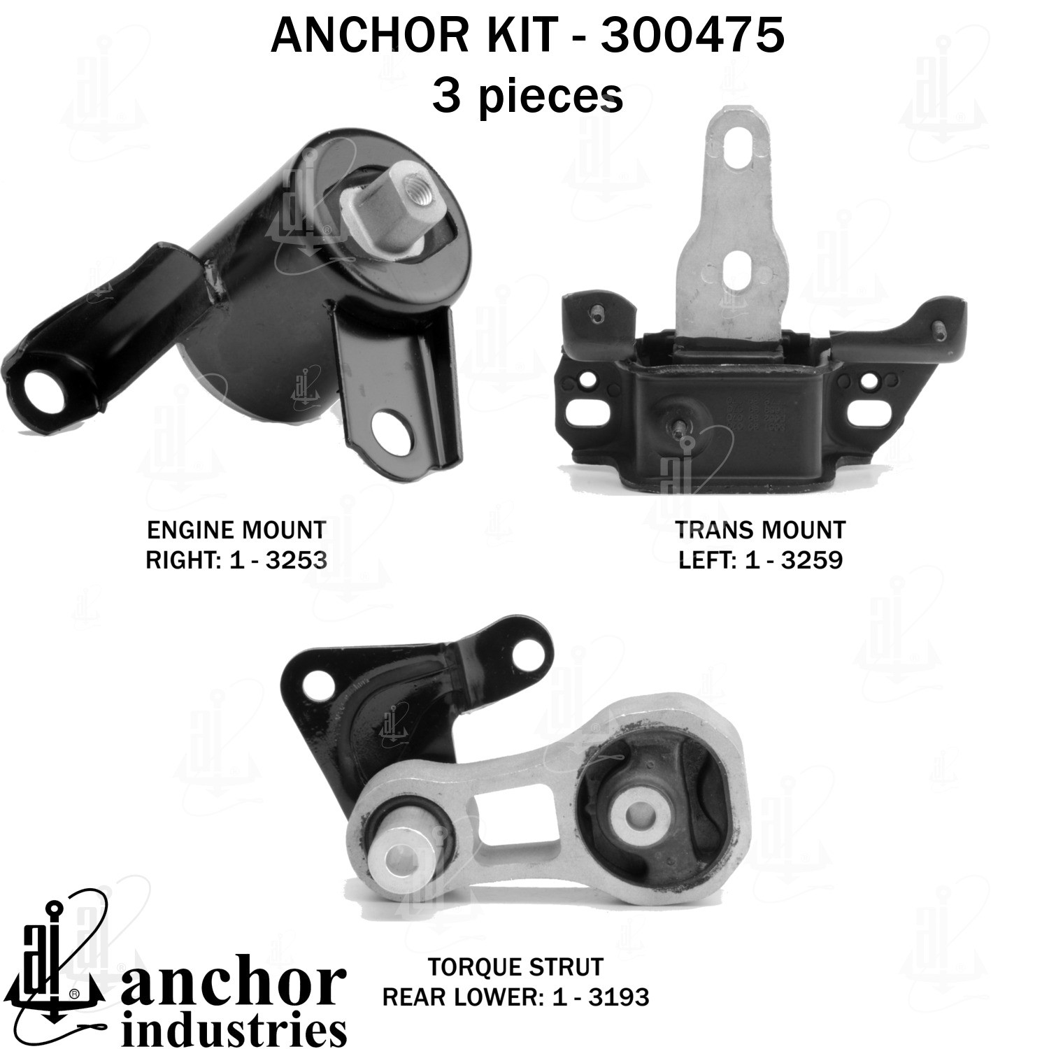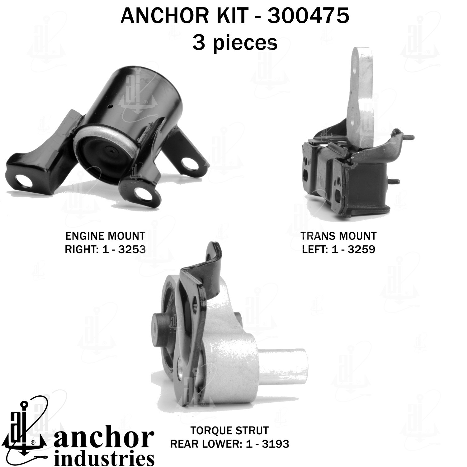 - Anchor 300475; ENGINE MNT KIT ; Each part of this kit is specifically engineered and manufactured to meet or exceed OE standards to ensure perfect fit and function. Natural and SBR rubber provide maximum life and performance. Steel fasteners are heat treated grade 5 bolts. A special bonding agent is used to ensure a rubber to metal bond. Rubber material is mixed to specific Durometer, hardness. 12 Month Warranty.