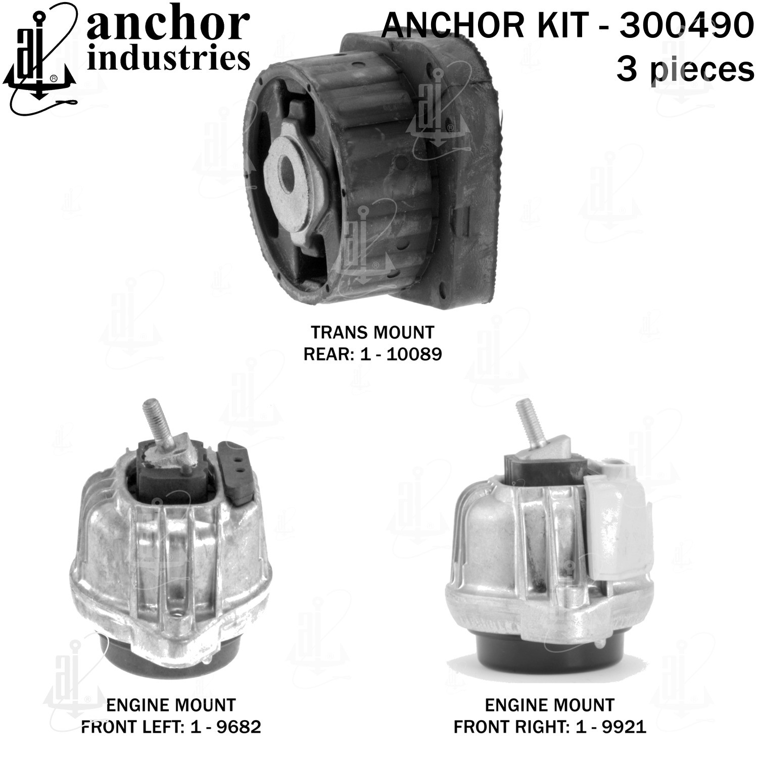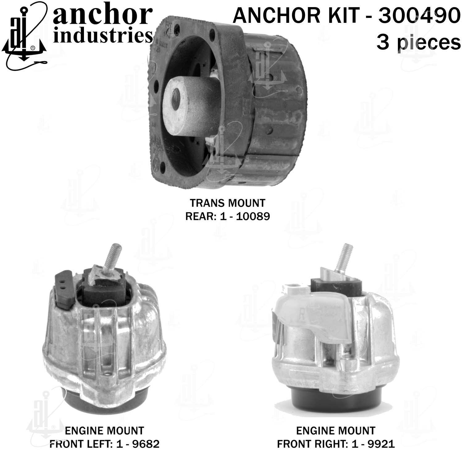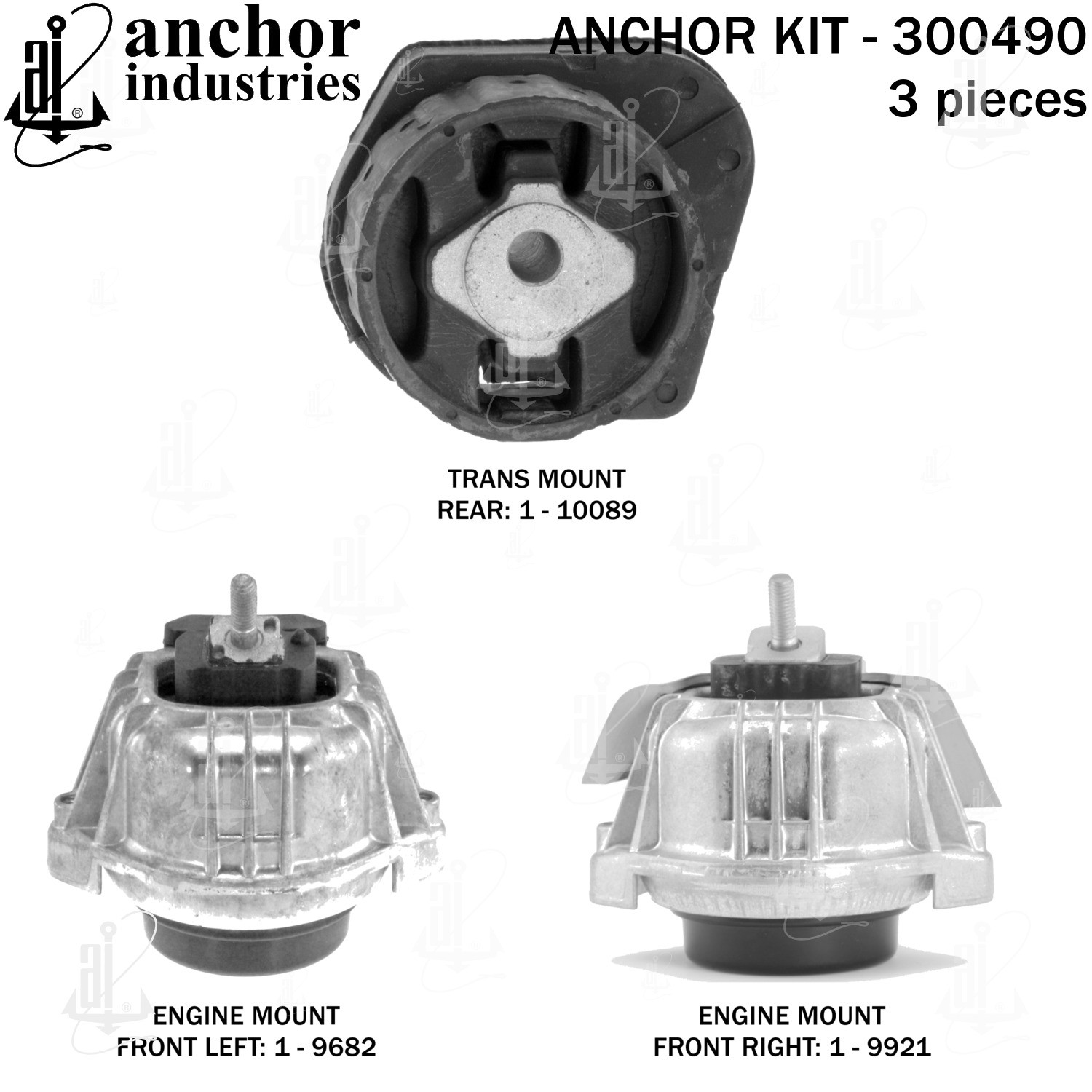 - Anchor 300490; ENGINE MNT KIT ; Each part of this kit is specifically engineered and manufactured to meet or exceed OE standards to ensure perfect fit and function. Natural and SBR rubber provide maximum life and performance. Steel fasteners are heat treated grade 5 bolts. A special bonding agent is used to ensure a rubber to metal bond. Rubber material is mixed to specific Durometer, hardness. 12 Month Warranty.
