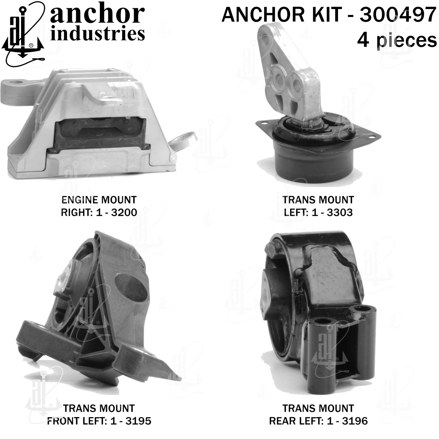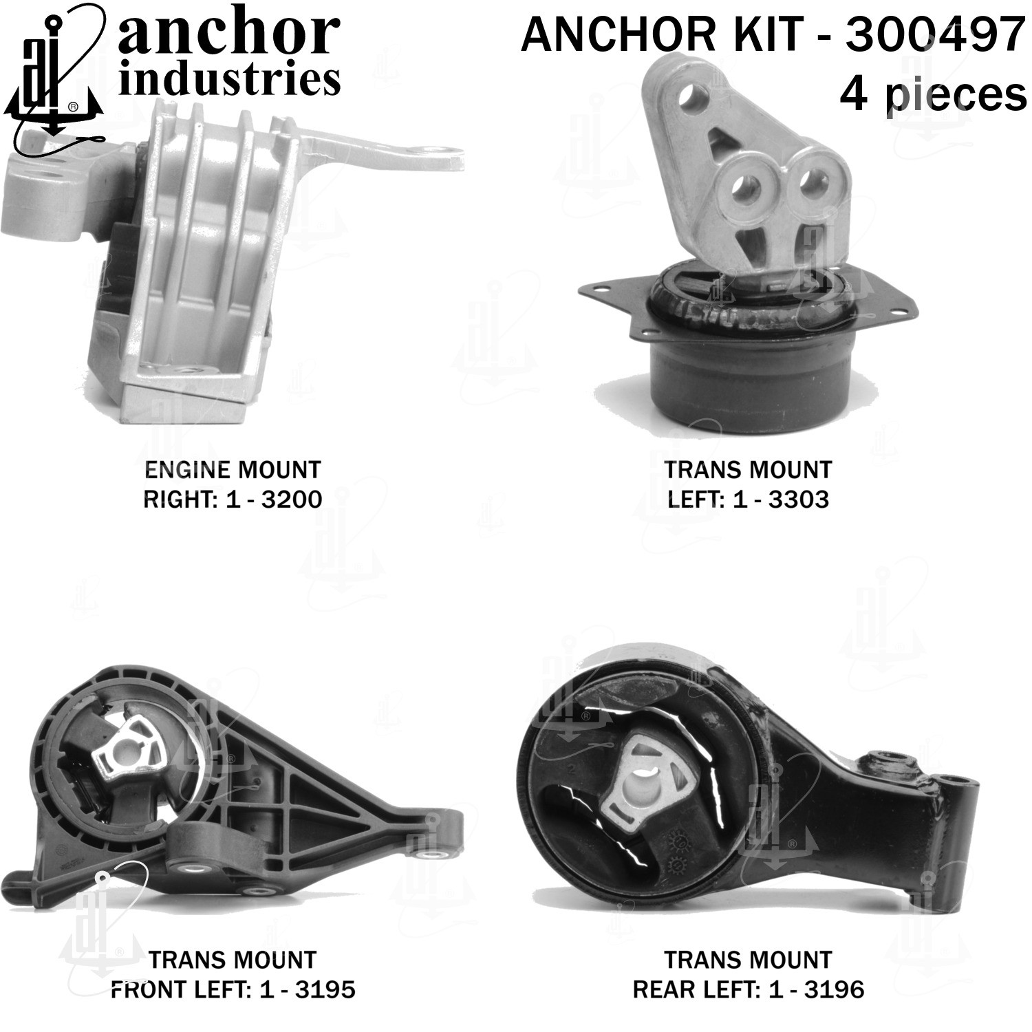 - Anchor 300497; ENGINE MNT KIT ; Each part of this kit is specifically engineered and manufactured to meet or exceed OE standards to ensure perfect fit and function. Natural and SBR rubber provide maximum life and performance. Steel fasteners are heat treated grade 5 bolts. A special bonding agent is used to ensure a rubber to metal bond. Rubber material is mixed to specific Durometer, hardness. 12 Month Warranty.