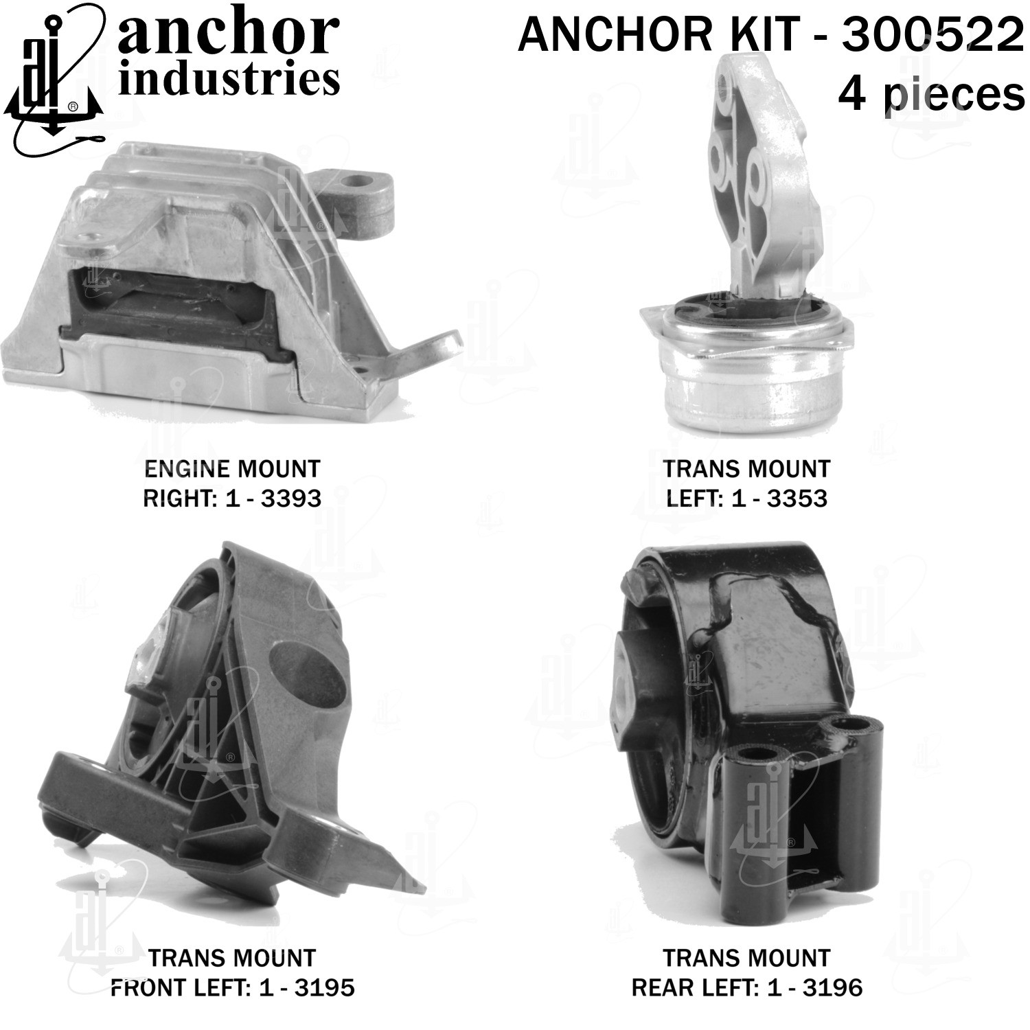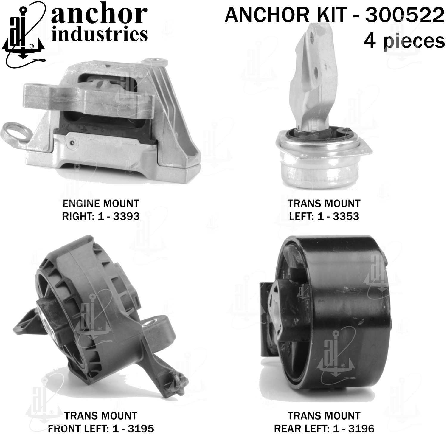 - Anchor 300522; ENGINE MNT KIT ; Each part of this kit is specifically engineered and manufactured to meet or exceed OE standards to ensure perfect fit and function. Natural and SBR rubber provide maximum life and performance. Steel fasteners are heat treated grade 5 bolts. A special bonding agent is used to ensure a rubber to metal bond. Rubber material is mixed to specific Durometer, hardness. 12 Month Warranty.