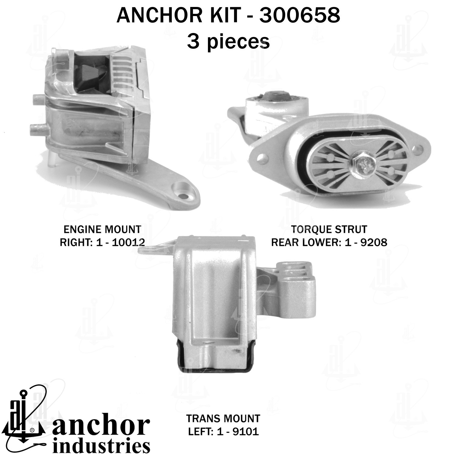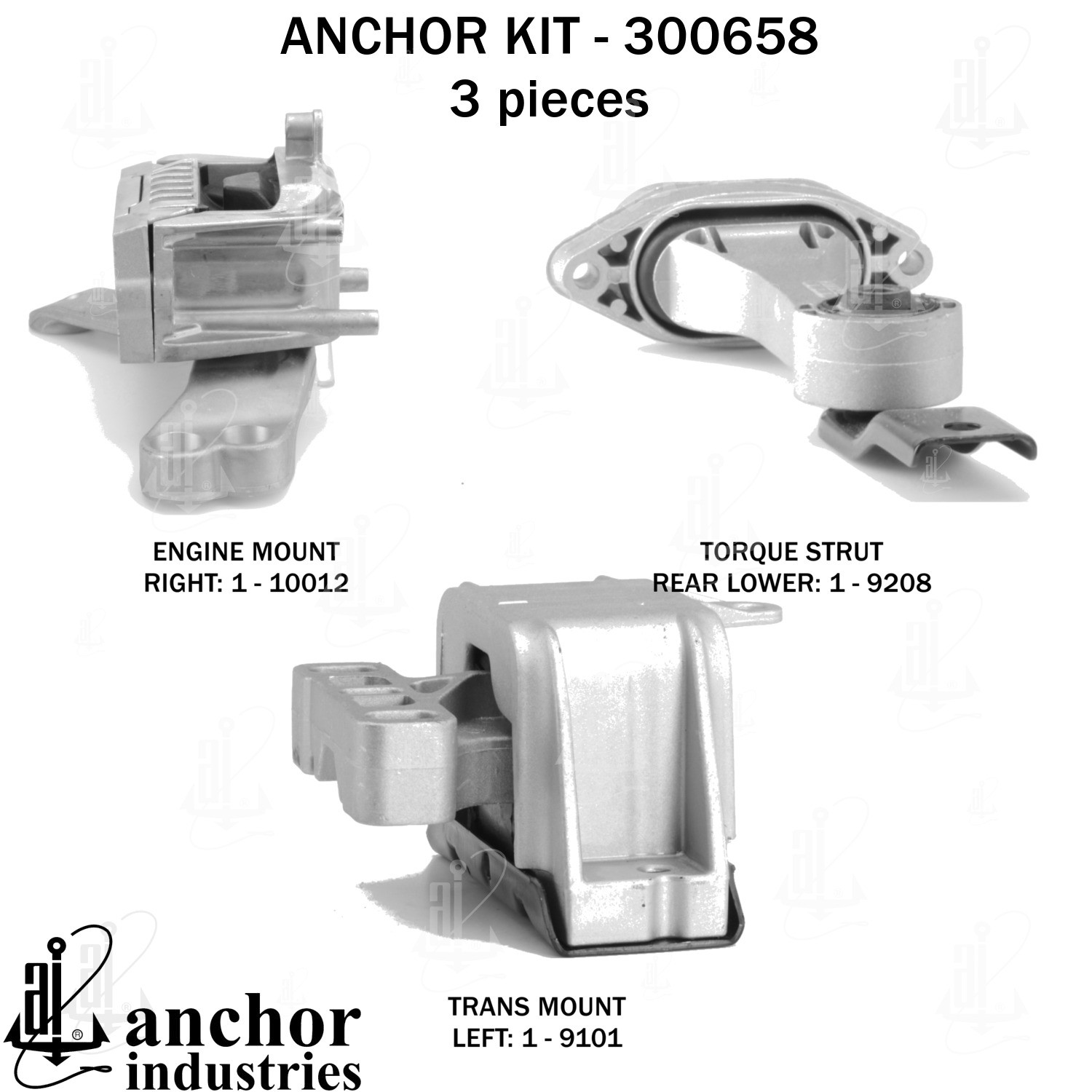 - Anchor 300658; ENGINE MNT KIT ; Each part of this kit is specifically engineered and manufactured to meet or exceed OE standards to ensure perfect fit and function. Natural and SBR rubber provide maximum life and performance. Steel fasteners are heat treated grade 5 bolts. A special bonding agent is used to ensure a rubber to metal bond. Rubber material is mixed to specific Durometer, hardness. 12 Month Warranty.