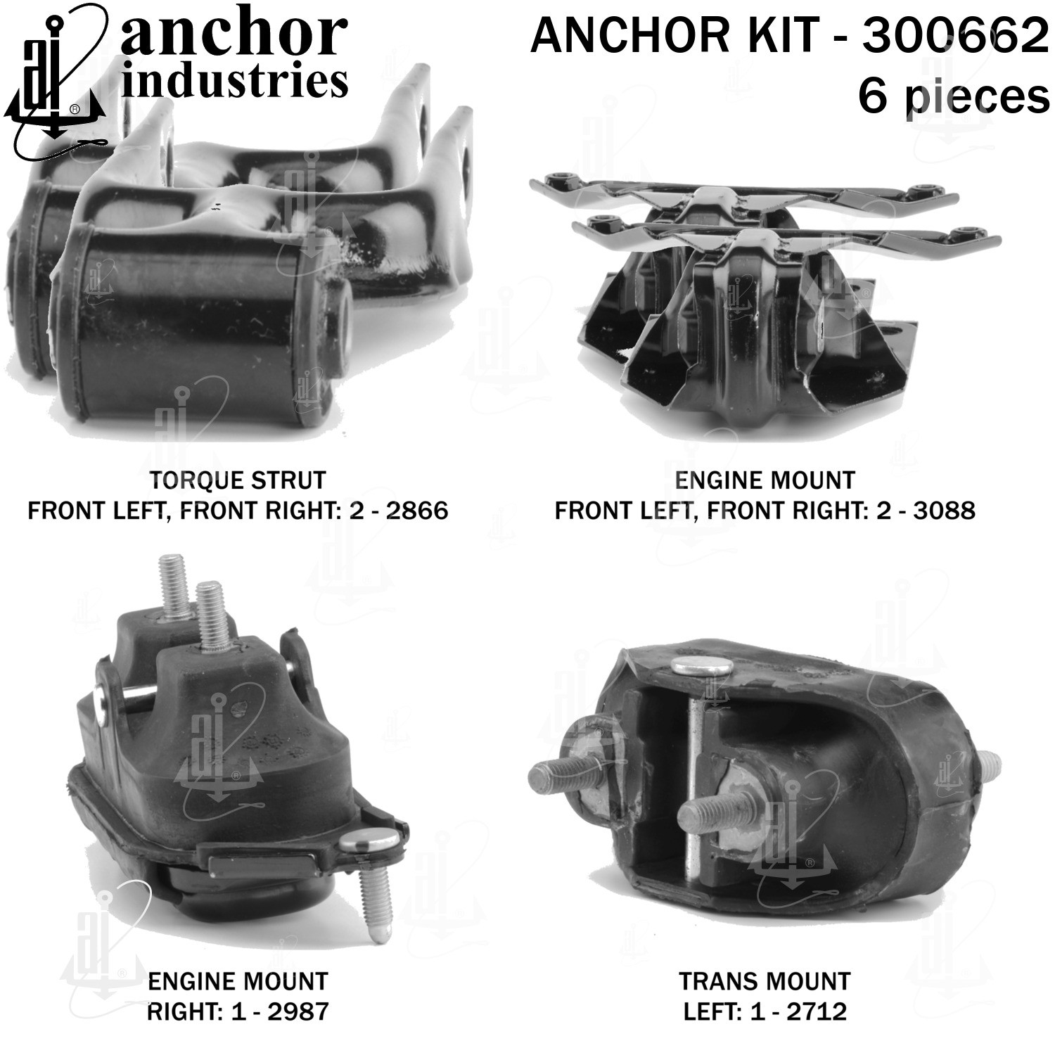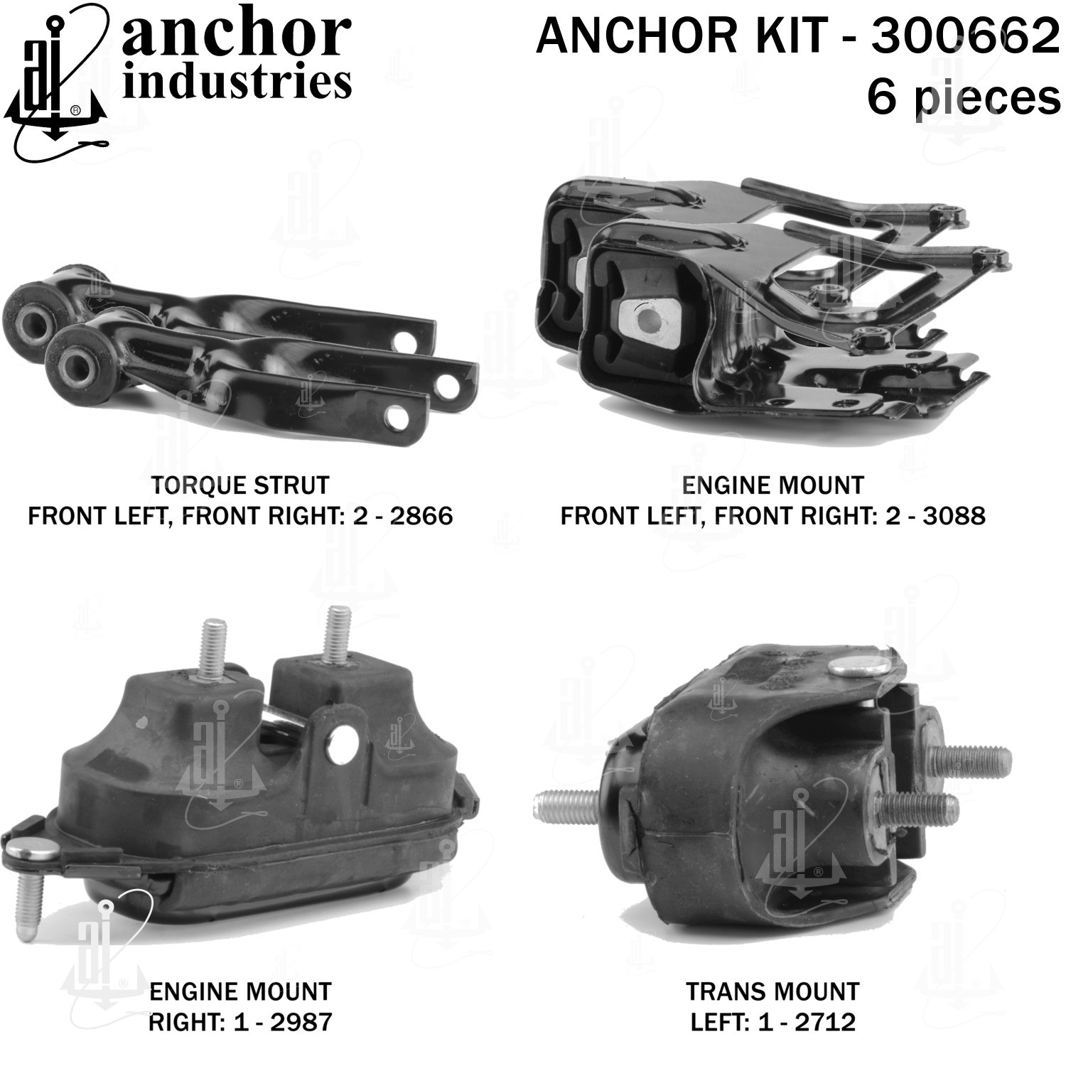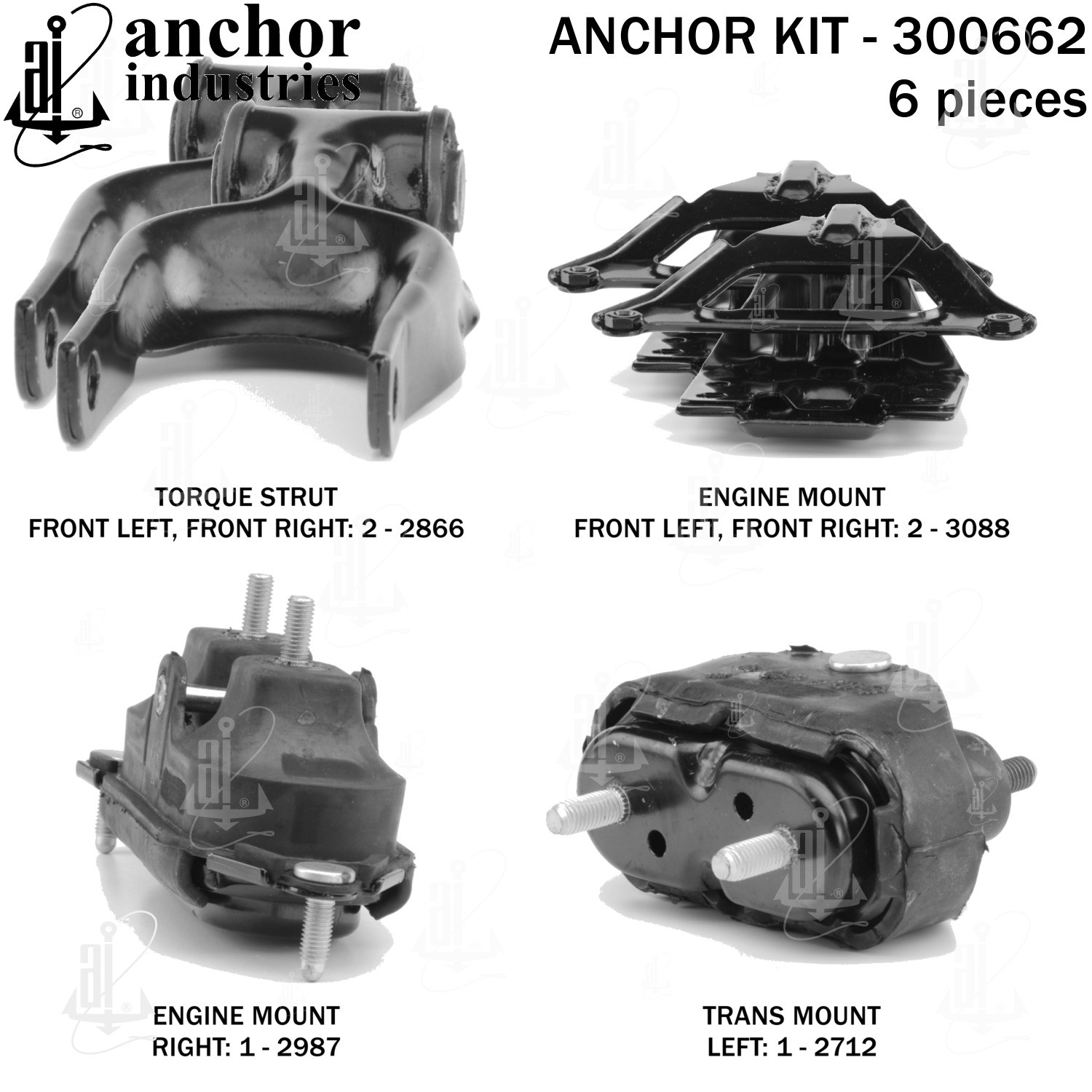 - Anchor 300662; ENGINE MNT KIT ; Each part of this kit is specifically engineered and manufactured to meet or exceed OE standards to ensure perfect fit and function. Natural and SBR rubber provide maximum life and performance. Steel fasteners are heat treated grade 5 bolts. A special bonding agent is used to ensure a rubber to metal bond. Rubber material is mixed to specific Durometer, hardness. 12 Month Warranty.