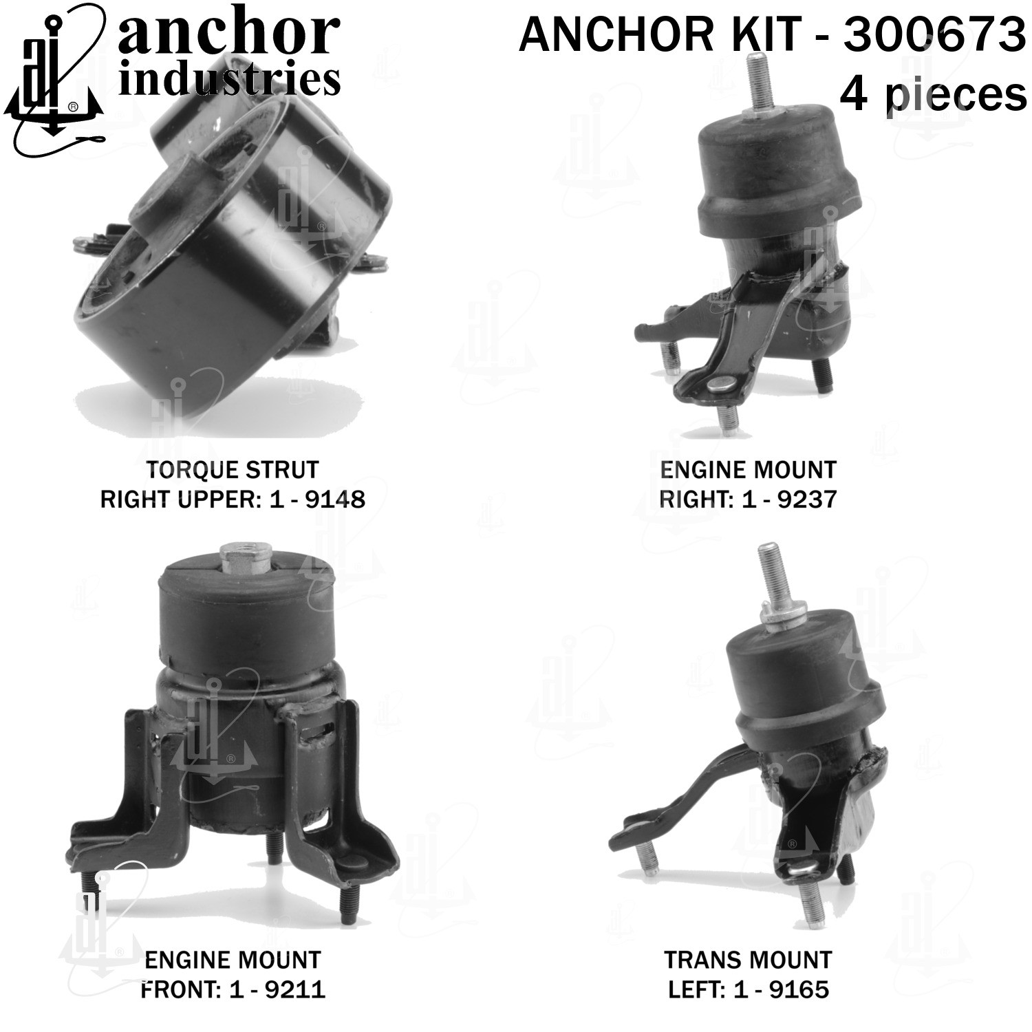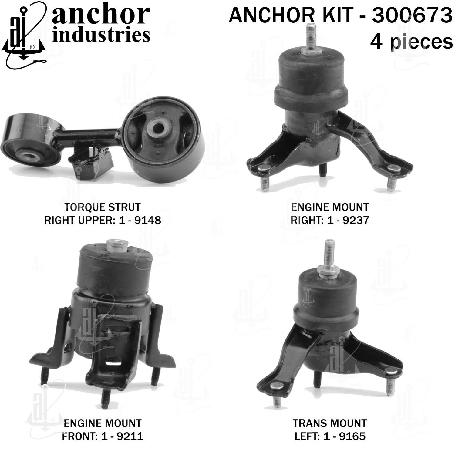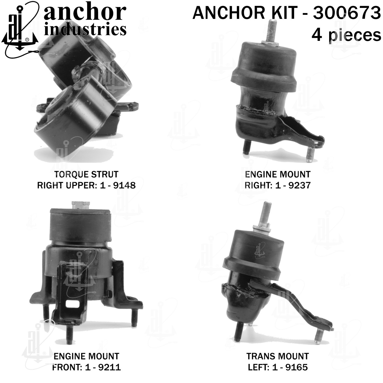 - Anchor 300673; ENGINE MNT KIT ; Each part of this kit is specifically engineered and manufactured to meet or exceed OE standards to ensure perfect fit and function. Natural and SBR rubber provide maximum life and performance. Steel fasteners are heat treated grade 5 bolts. A special bonding agent is used to ensure a rubber to metal bond. Rubber material is mixed to specific Durometer, hardness. 12 Month Warranty.