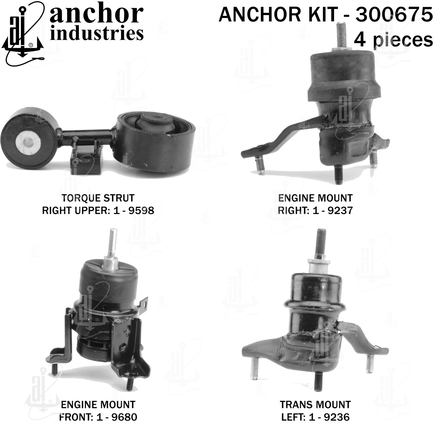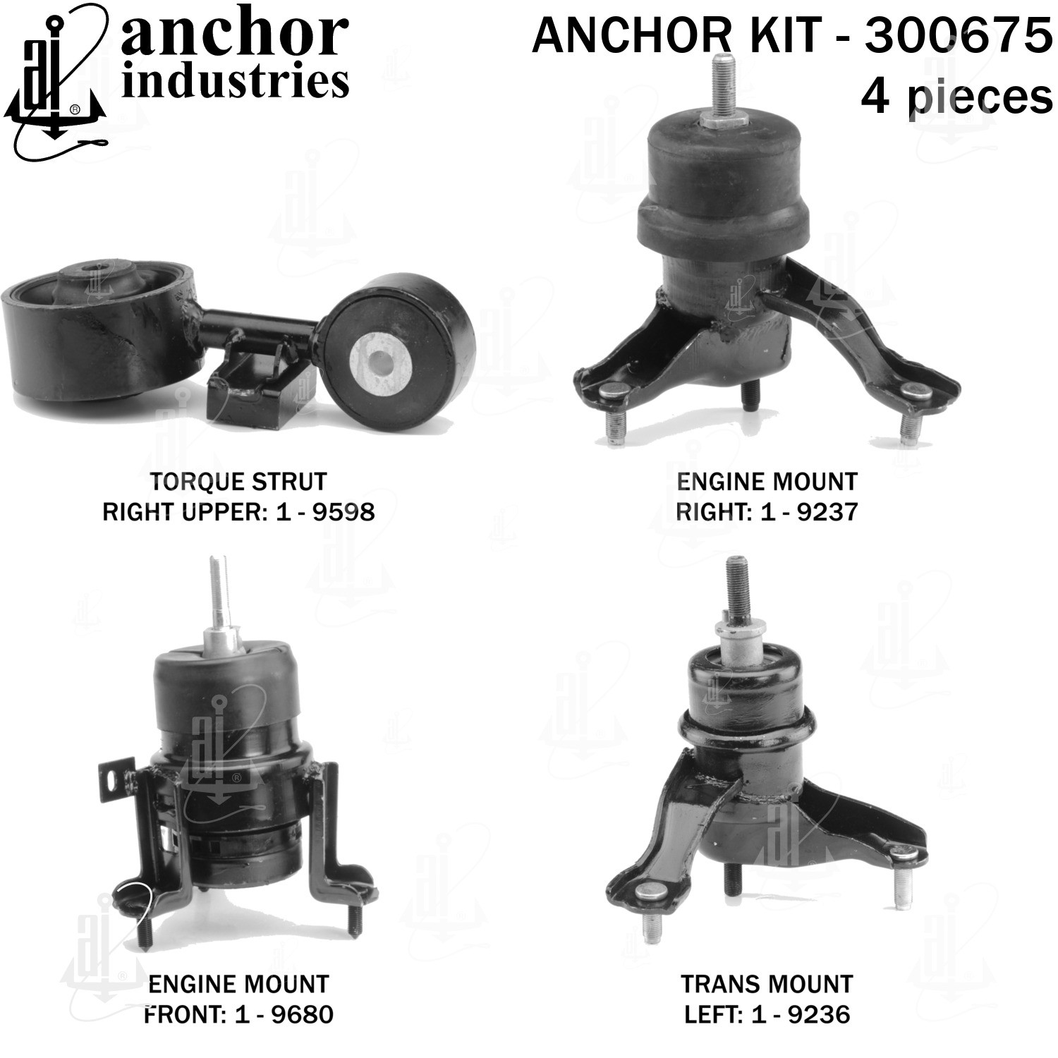 - Anchor 300675; ENGINE MNT KIT ; Each part of this kit is specifically engineered and manufactured to meet or exceed OE standards to ensure perfect fit and function. Natural and SBR rubber provide maximum life and performance. Steel fasteners are heat treated grade 5 bolts. A special bonding agent is used to ensure a rubber to metal bond. Rubber material is mixed to specific Durometer, hardness. 12 Month Warranty.