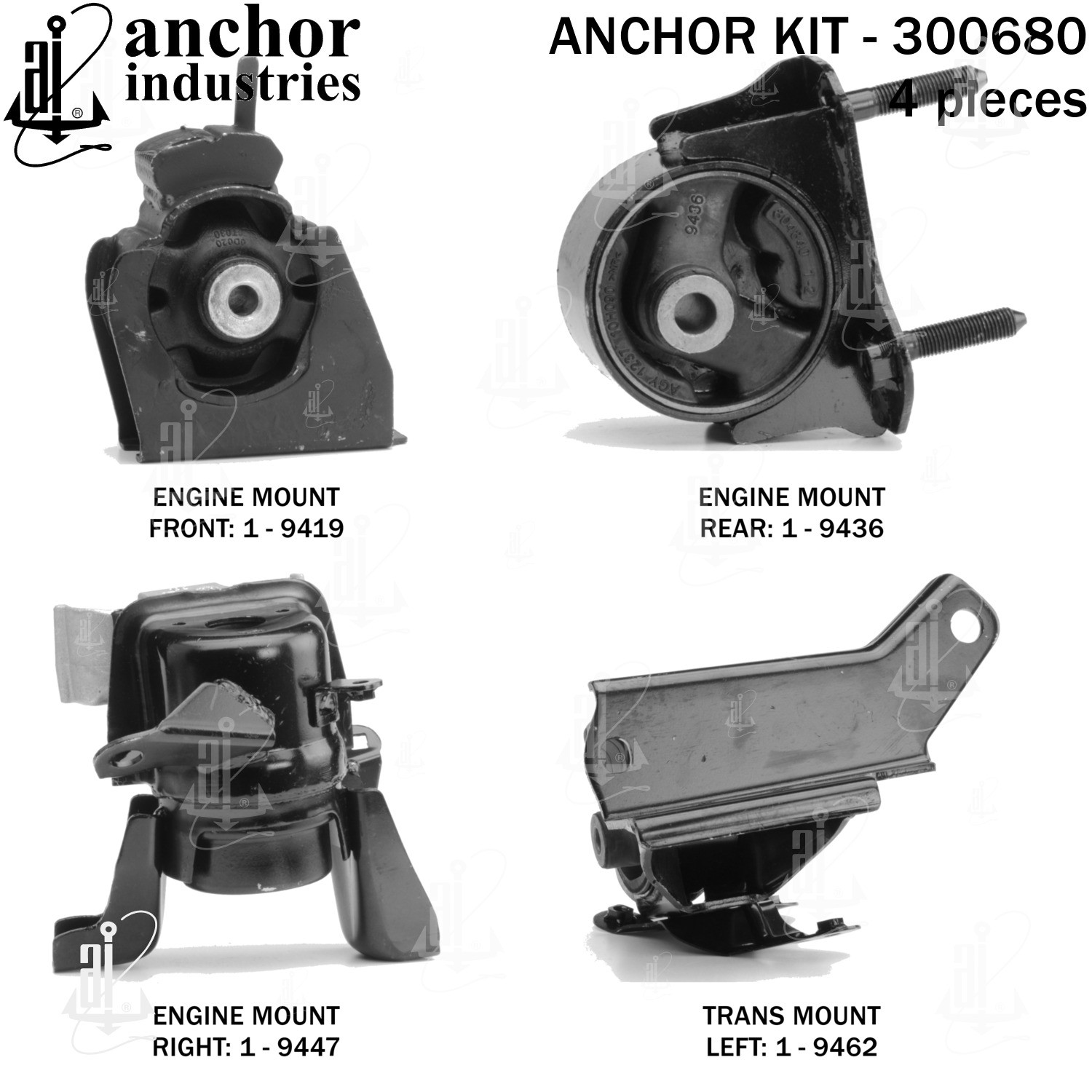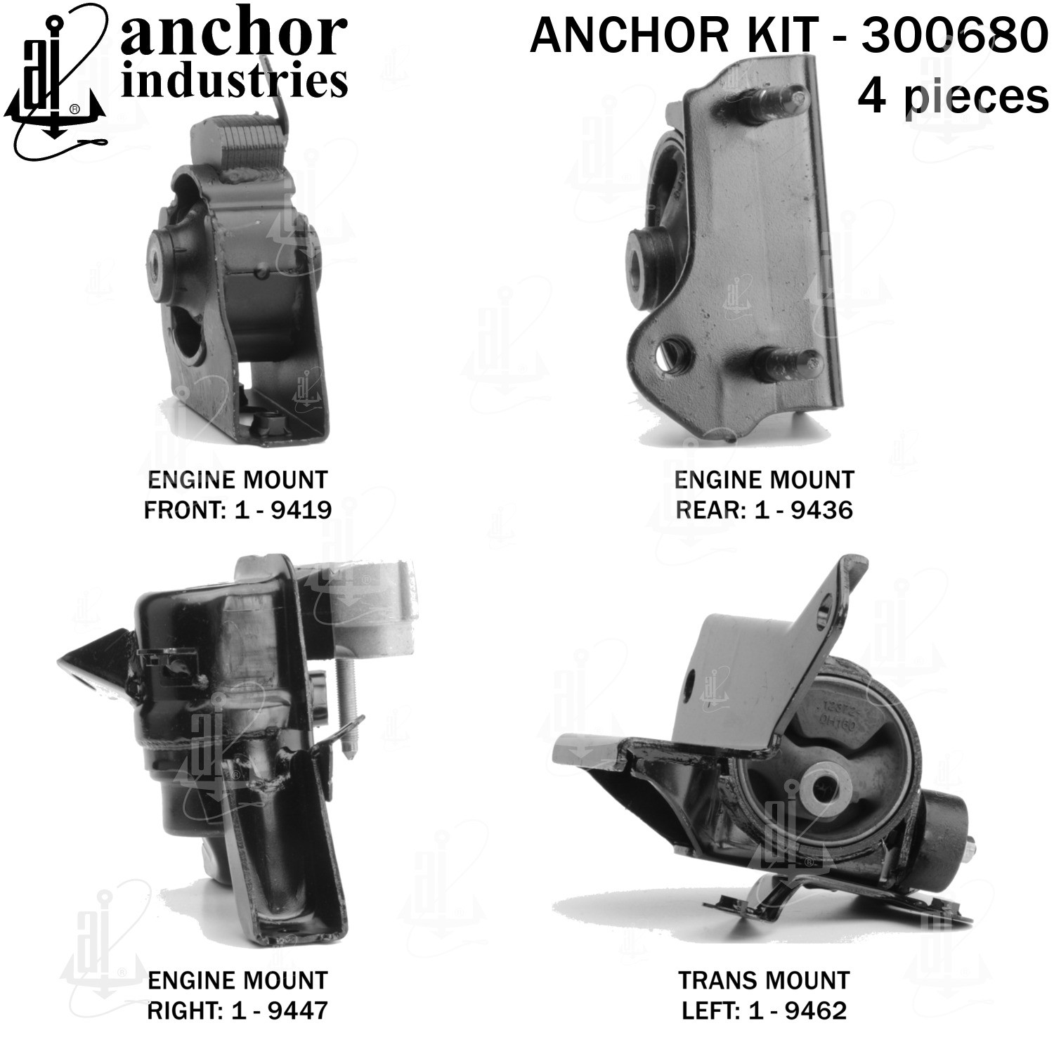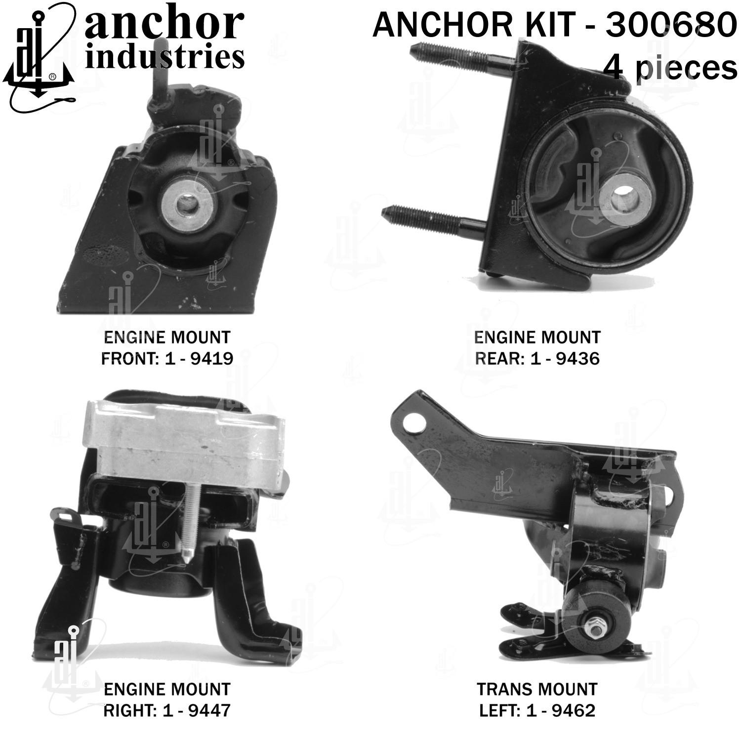 - Anchor 300680; ENGINE MNT KIT ; Each part of this kit is specifically engineered and manufactured to meet or exceed OE standards to ensure perfect fit and function. Natural and SBR rubber provide maximum life and performance. Steel fasteners are heat treated grade 5 bolts. A special bonding agent is used to ensure a rubber to metal bond. Rubber material is mixed to specific Durometer, hardness. 12 Month Warranty.