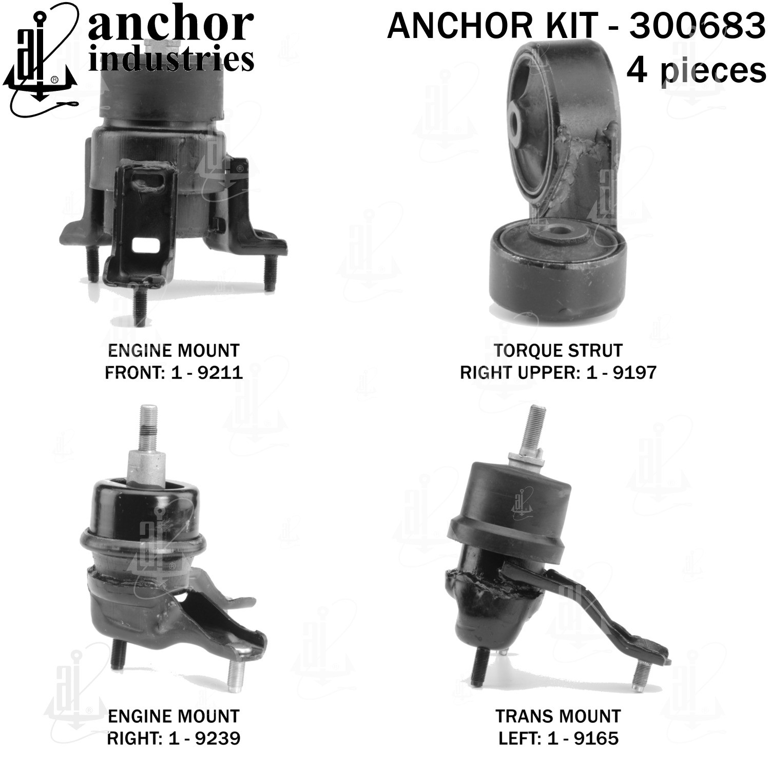 - Anchor 300683; ENGINE MNT KIT ; Each part of this kit is specifically engineered and manufactured to meet or exceed OE standards to ensure perfect fit and function. Natural and SBR rubber provide maximum life and performance. Steel fasteners are heat treated grade 5 bolts. A special bonding agent is used to ensure a rubber to metal bond. Rubber material is mixed to specific Durometer, hardness. 12 Month Warranty.