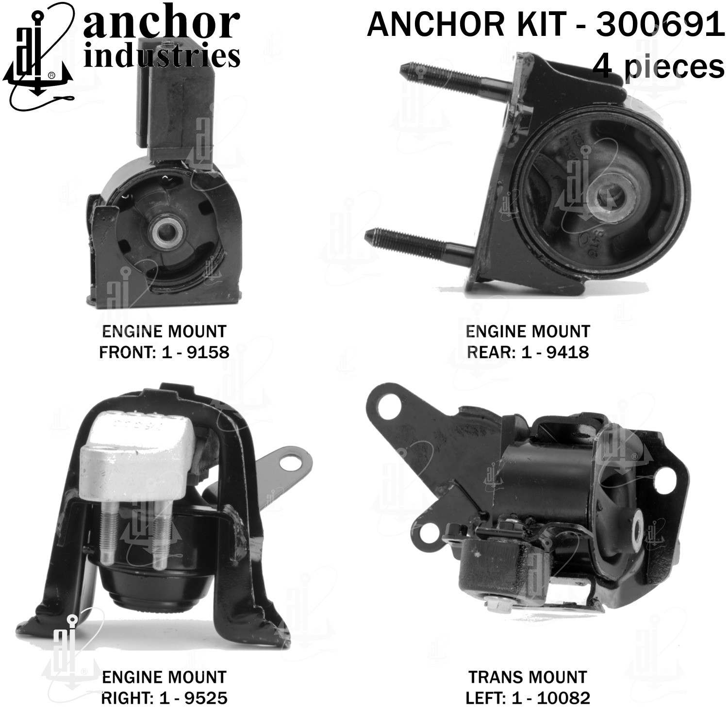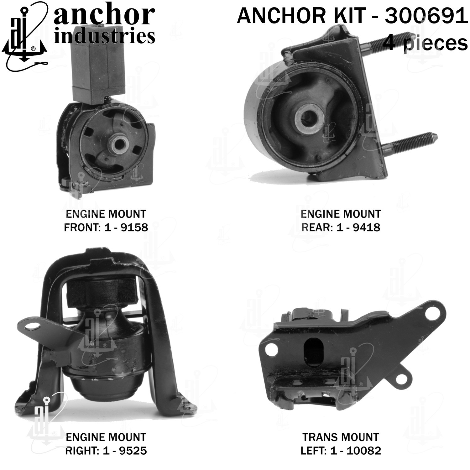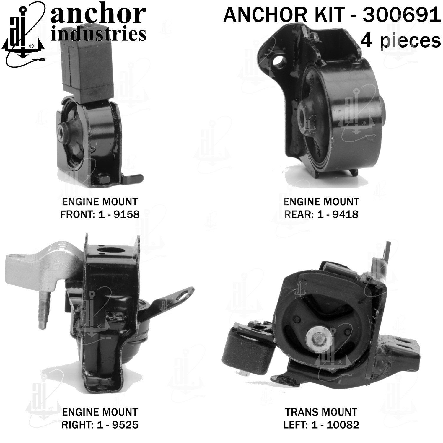 - Anchor 300691; ENGINE MNT KIT ; Each part of this kit is specifically engineered and manufactured to meet or exceed OE standards to ensure perfect fit and function. Natural and SBR rubber provide maximum life and performance. Steel fasteners are heat treated grade 5 bolts. A special bonding agent is used to ensure a rubber to metal bond. Rubber material is mixed to specific Durometer, hardness. 12 Month Warranty.