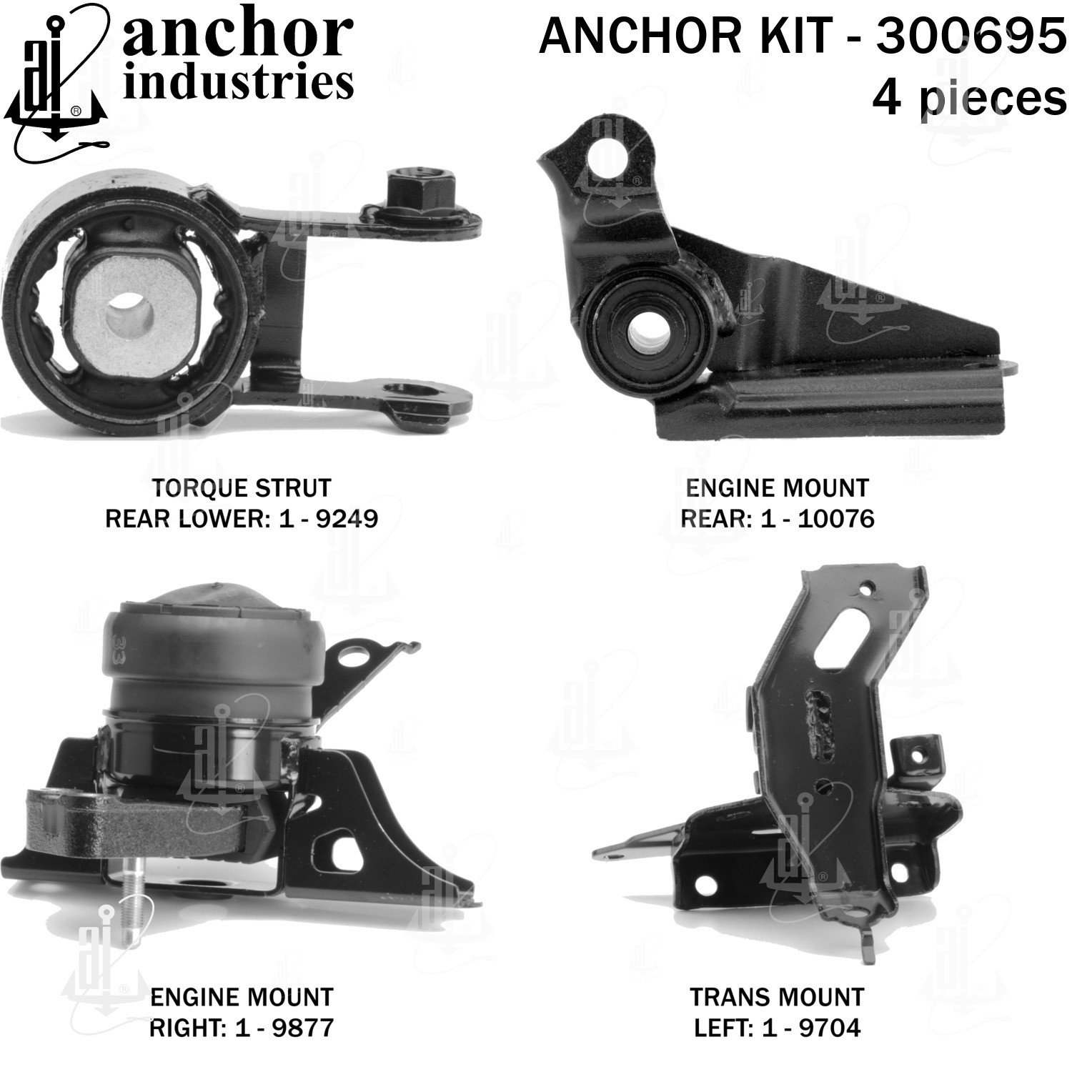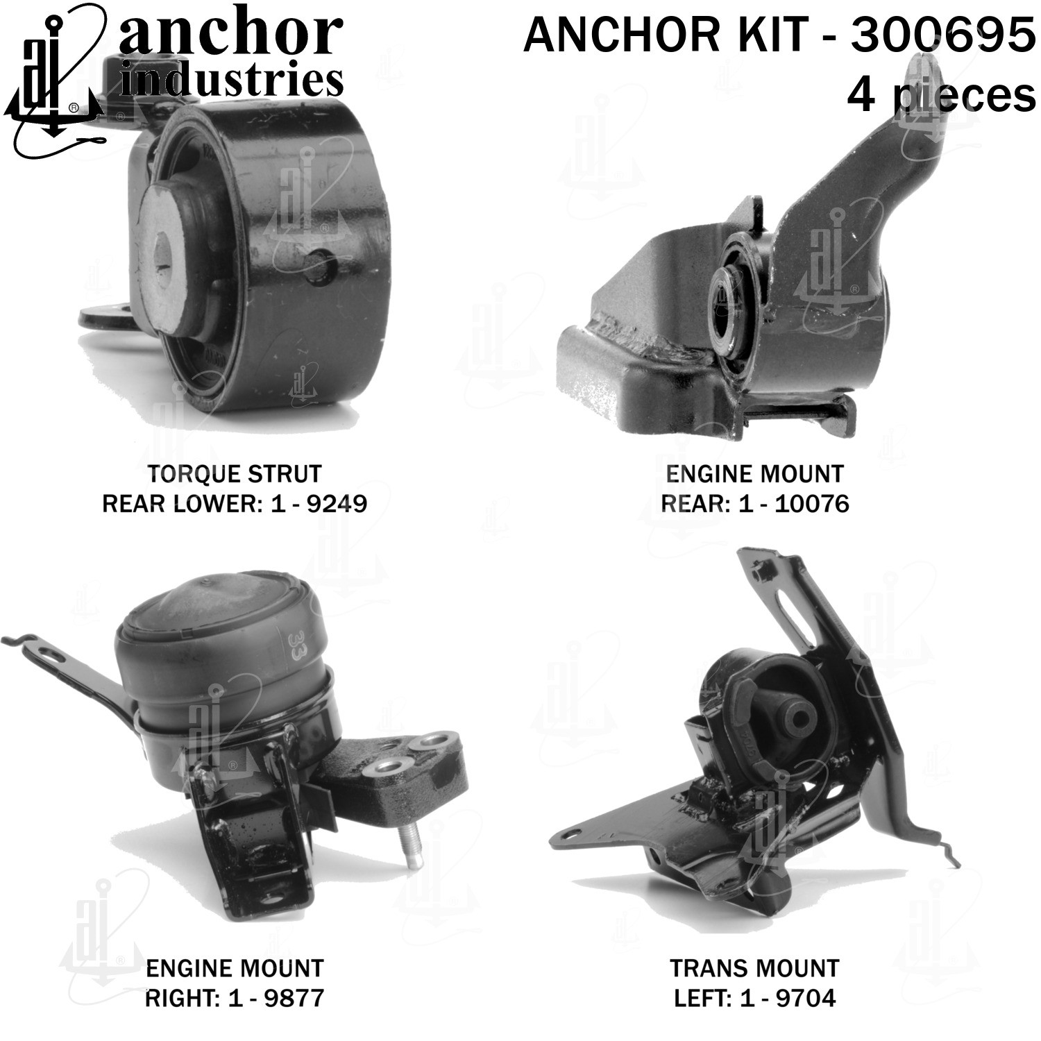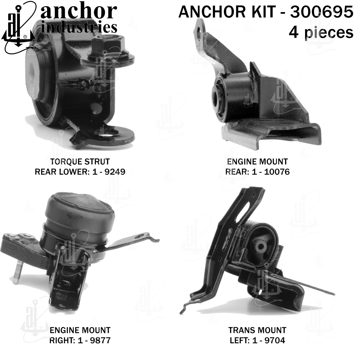 - Anchor 300695; ENGINE MNT KIT ; Each part of this kit is specifically engineered and manufactured to meet or exceed OE standards to ensure perfect fit and function. Natural and SBR rubber provide maximum life and performance. Steel fasteners are heat treated grade 5 bolts. A special bonding agent is used to ensure a rubber to metal bond. Rubber material is mixed to specific Durometer, hardness. 12 Month Warranty.
