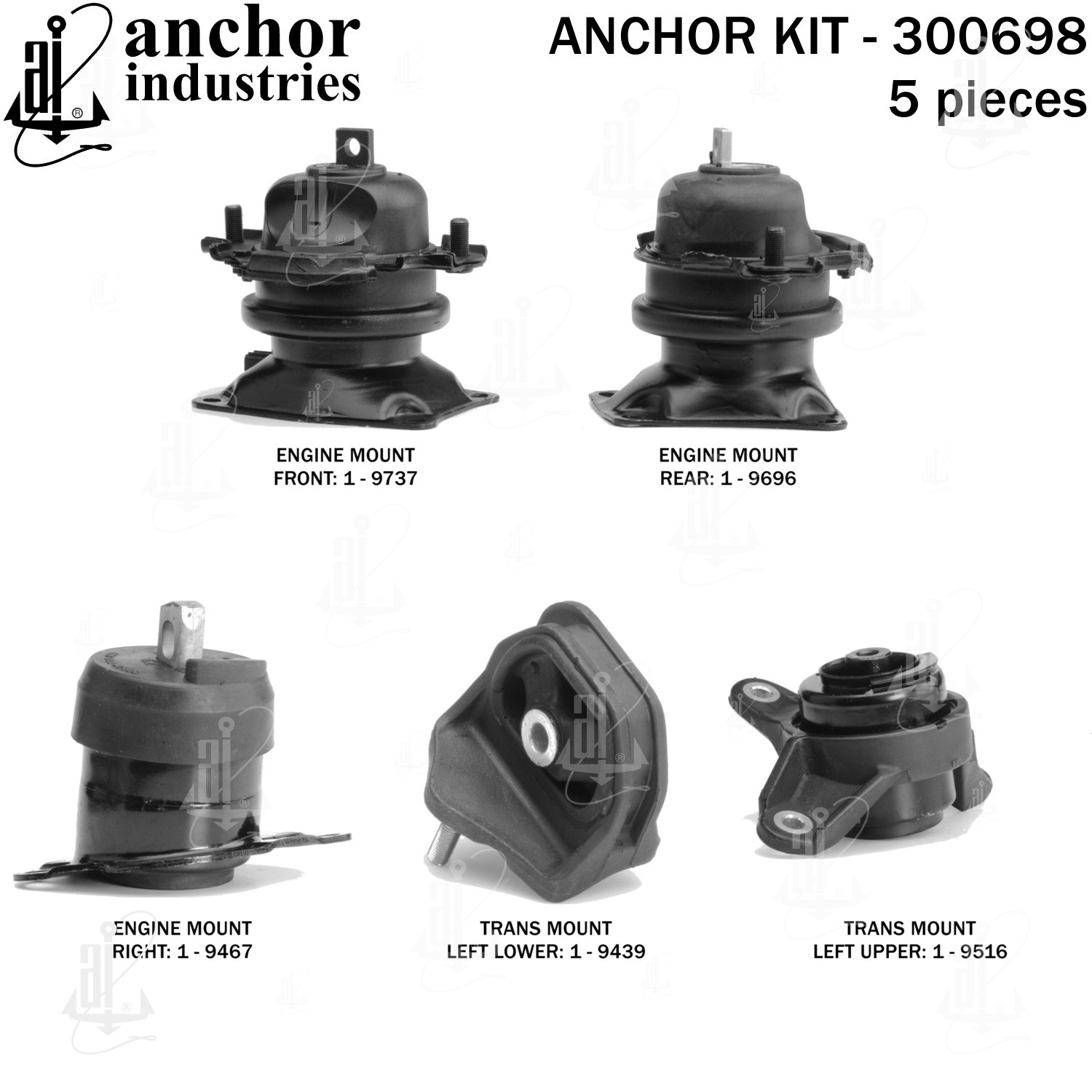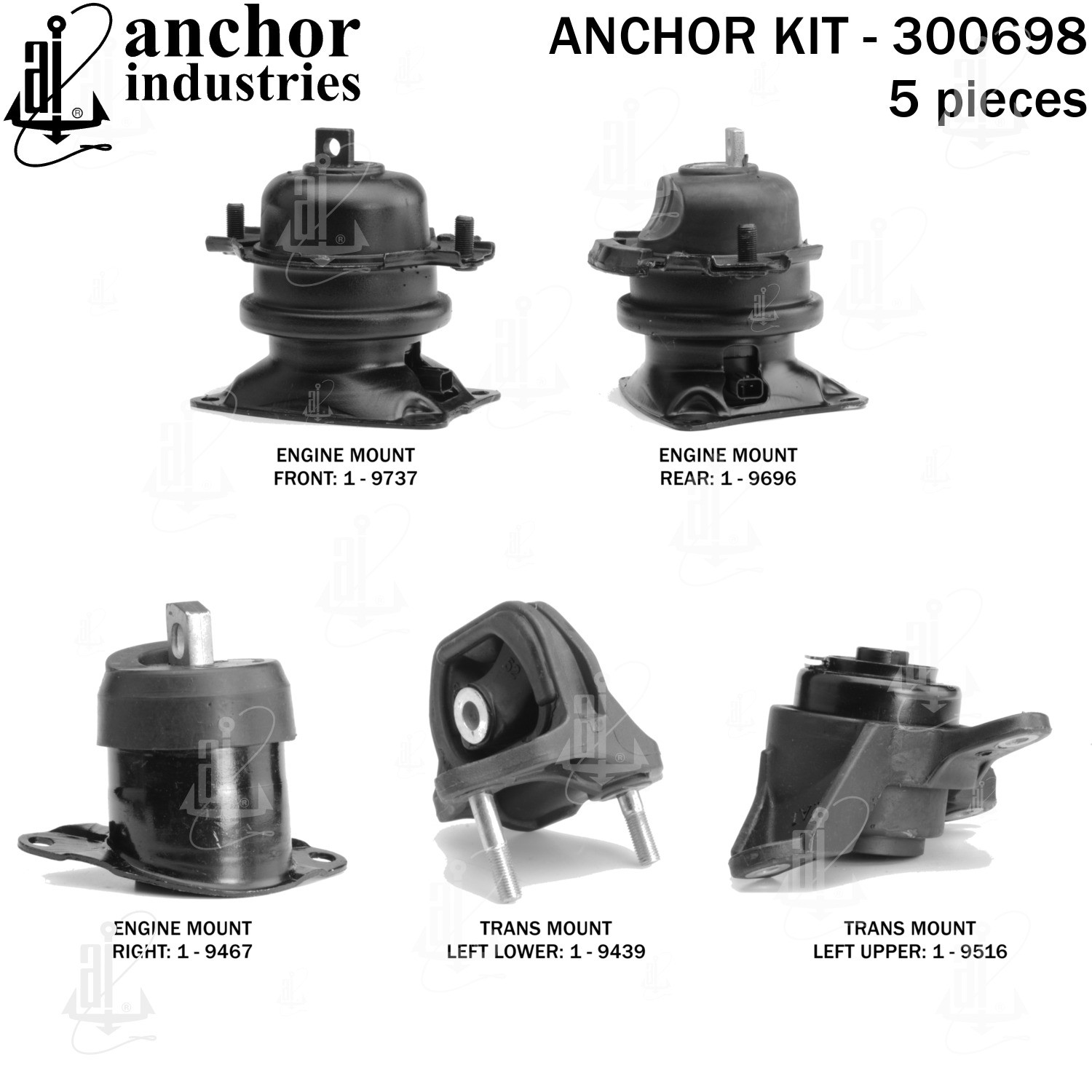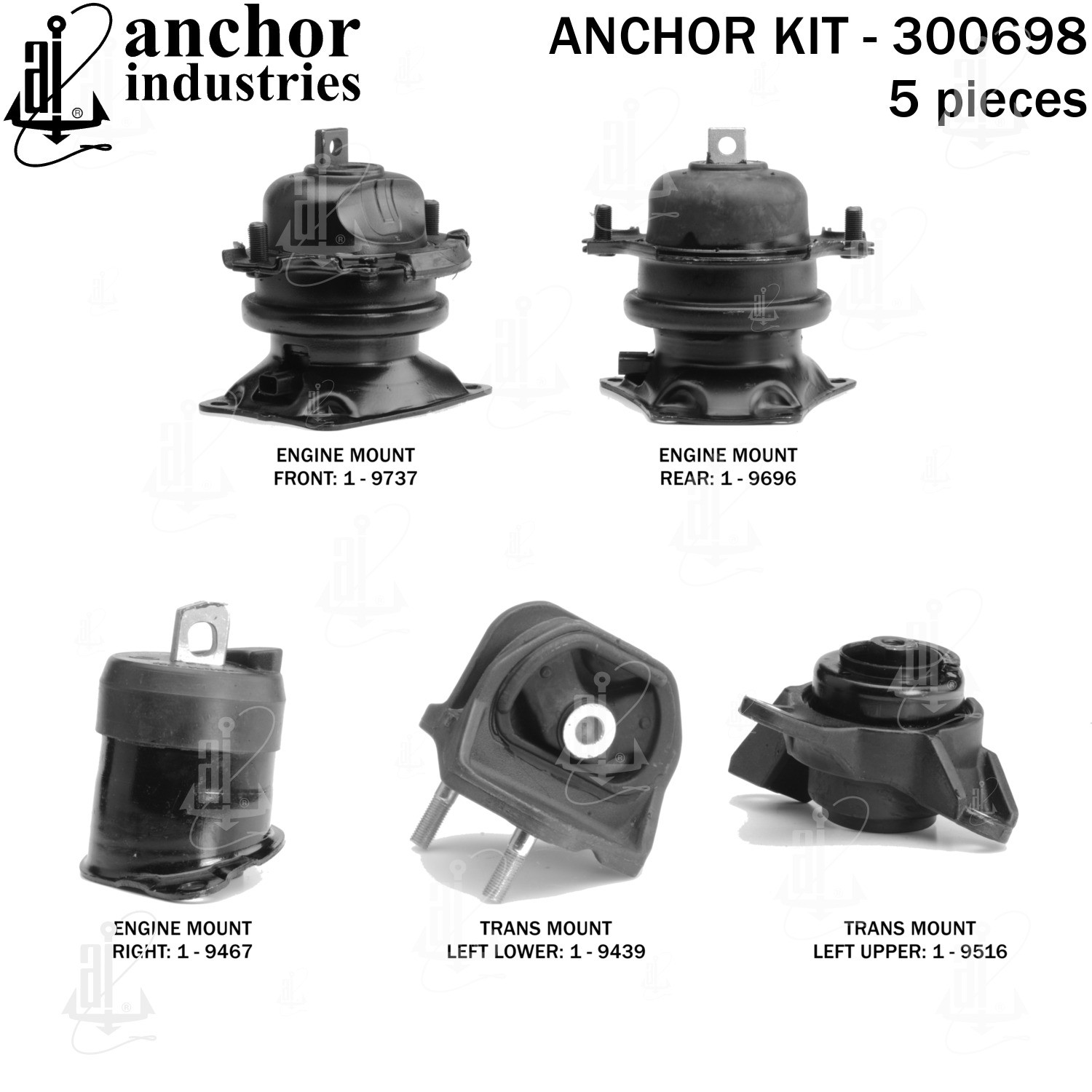 - Anchor 300698; ENGINE MNT KIT ; Each part of this kit is specifically engineered and manufactured to meet or exceed OE standards to ensure perfect fit and function. Natural and SBR rubber provide maximum life and performance. Steel fasteners are heat treated grade 5 bolts. A special bonding agent is used to ensure a rubber to metal bond. Rubber material is mixed to specific Durometer, hardness. 12 Month Warranty.
