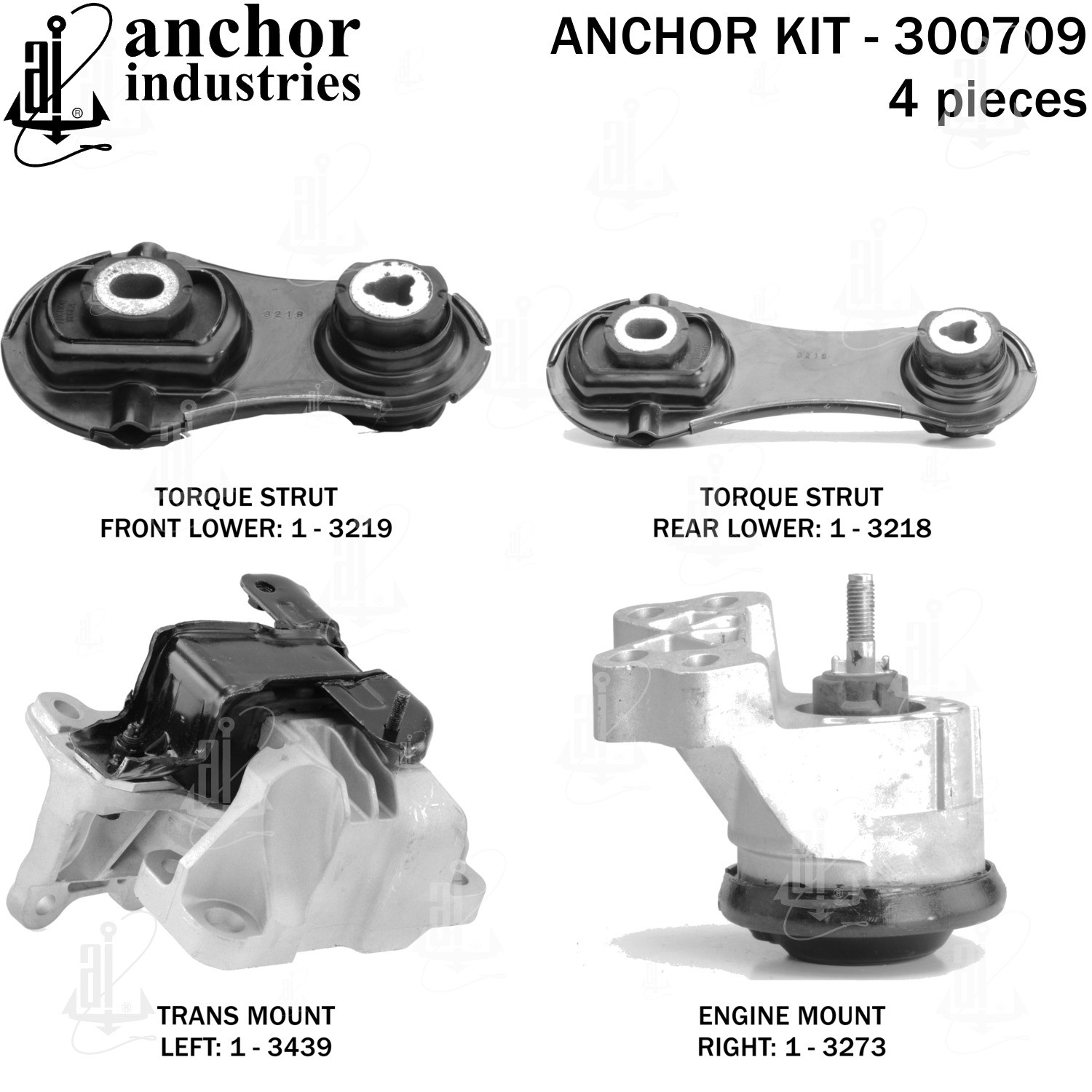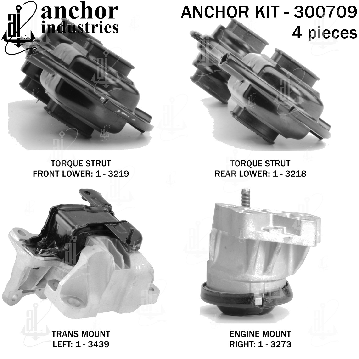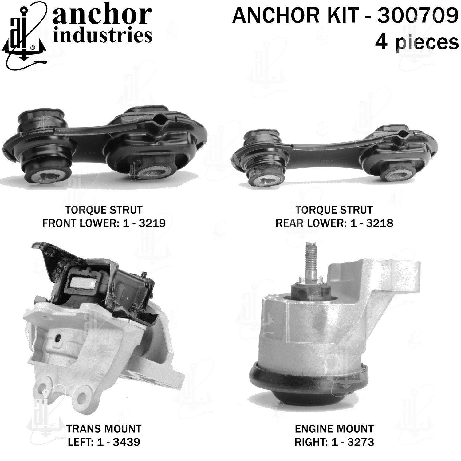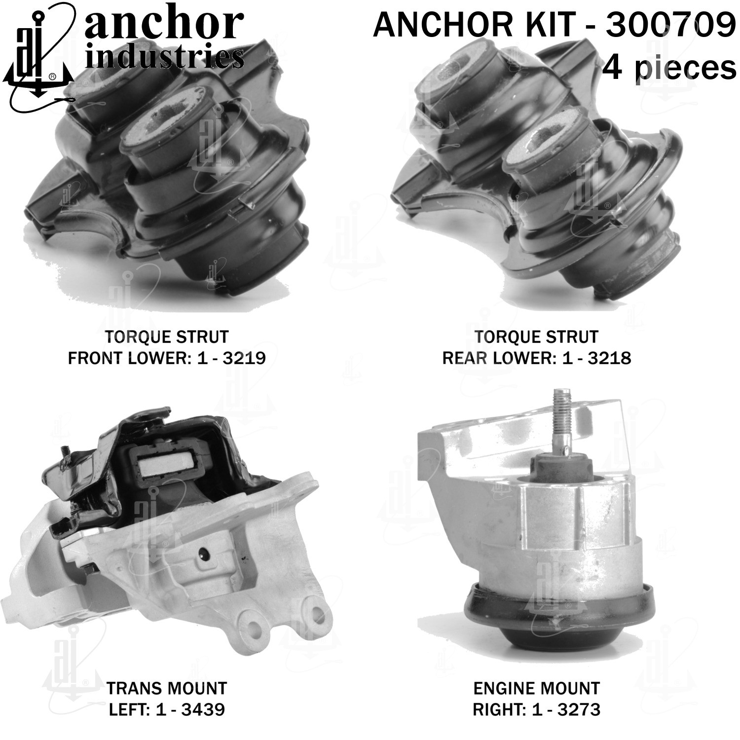 | KIT | 1-3273 engine mount right / 1-3439 trans mount left / 1-3218 torque strut rear lower / 1-3219 torque strut front lower |