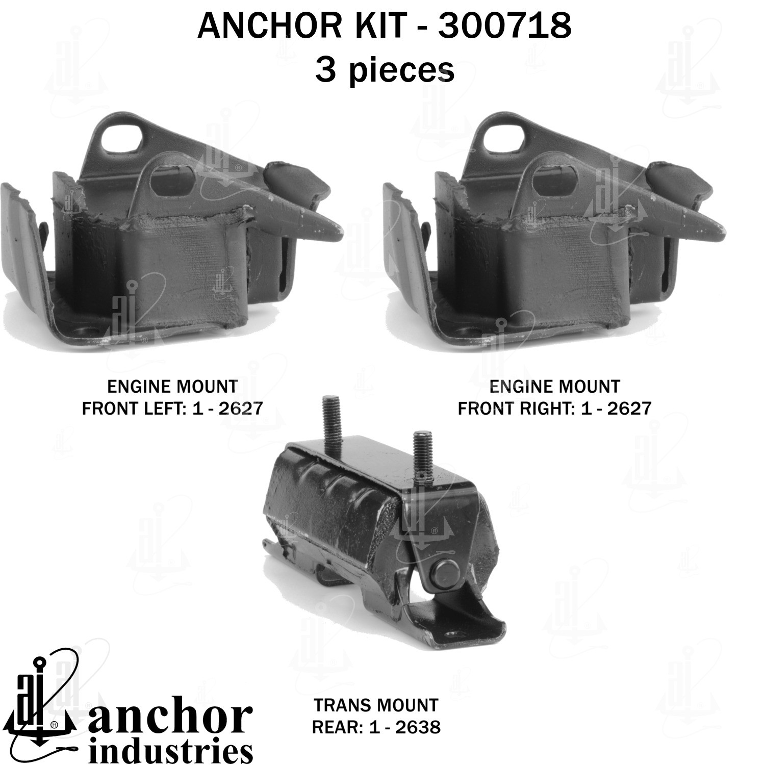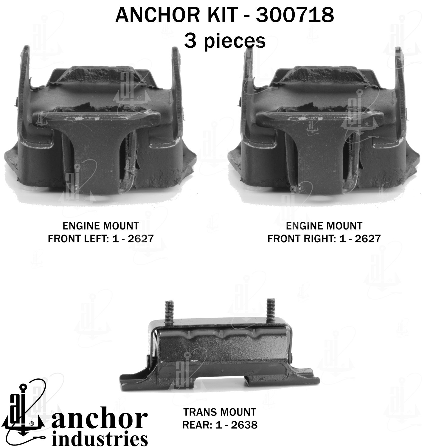 - Anchor 300718; ENGINE MNT KIT ; Each part of this kit is specifically engineered and manufactured to meet or exceed OE standards to ensure perfect fit and function. Natural and SBR rubber provide maximum life and performance. Steel fasteners are heat treated grade 5 bolts. A special bonding agent is used to ensure a rubber to metal bond. Rubber material is mixed to specific Durometer, hardness. 12 Month Warranty.