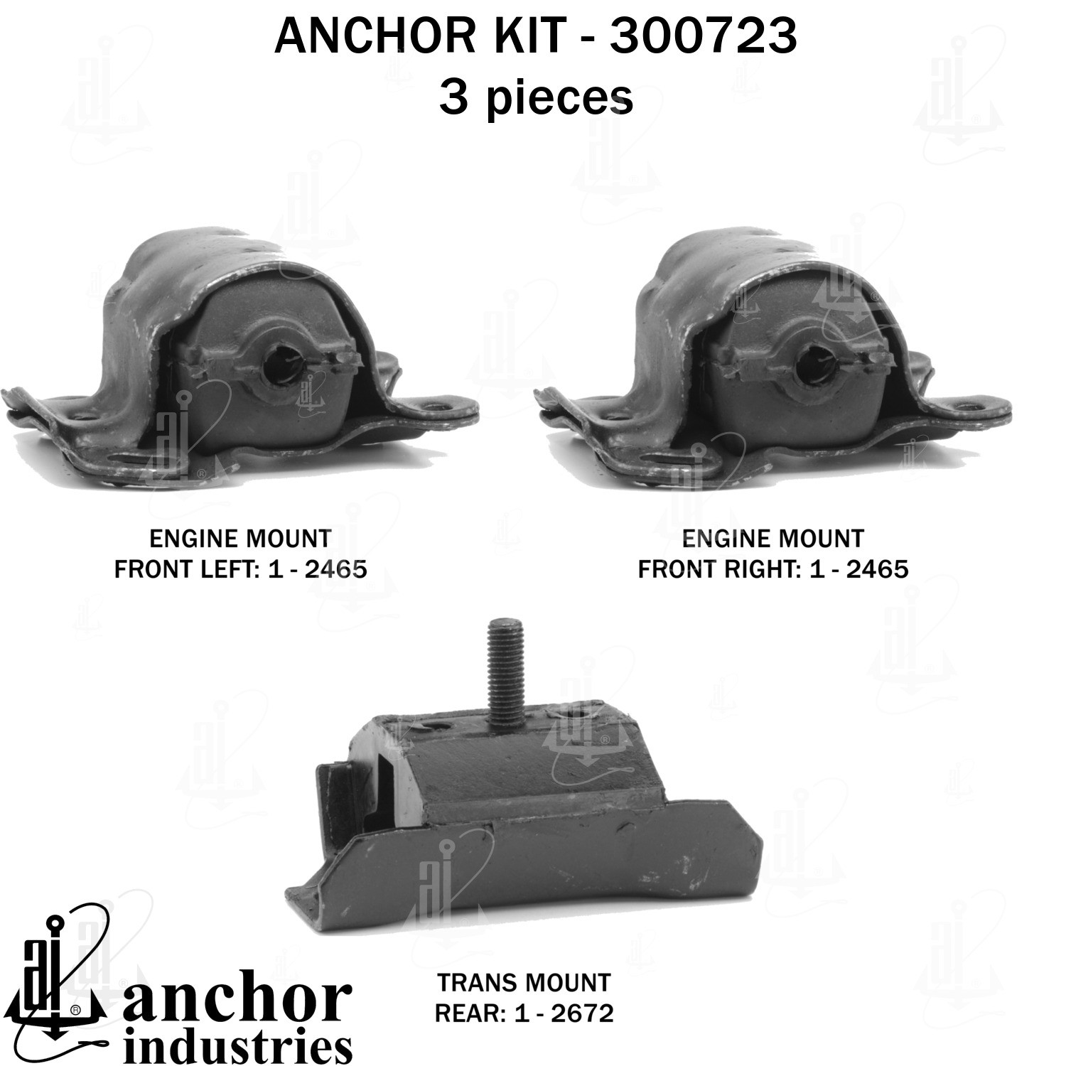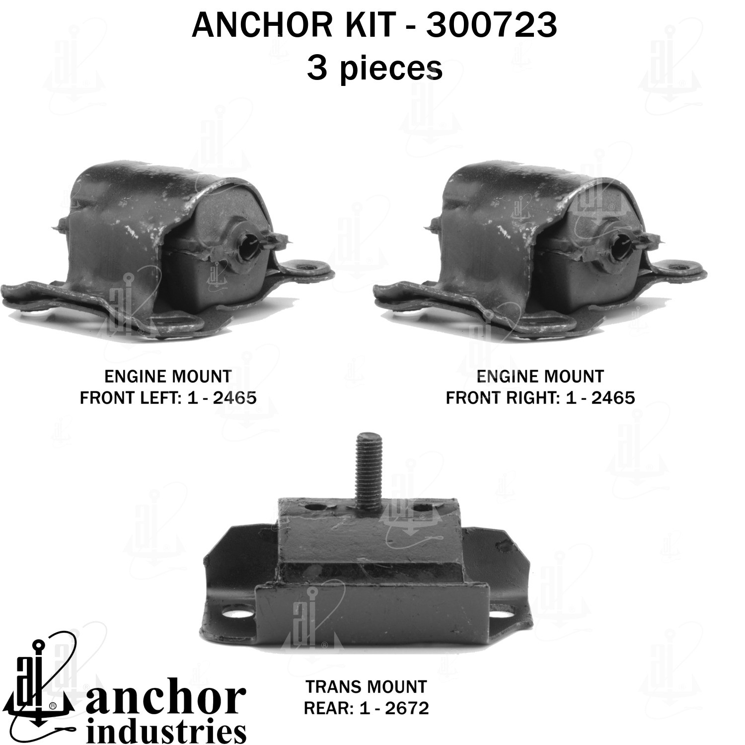 - Anchor 300723; ENGINE MNT KIT ; Each part of this kit is specifically engineered and manufactured to meet or exceed OE standards to ensure perfect fit and function. Natural and SBR rubber provide maximum life and performance. Steel fasteners are heat treated grade 5 bolts. A special bonding agent is used to ensure a rubber to metal bond. Rubber material is mixed to specific Durometer, hardness. 12 Month Warranty.