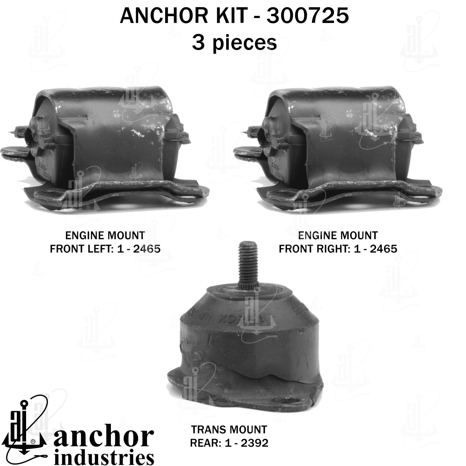 - Anchor 300725; ENGINE MNT KIT ; Each part of this kit is specifically engineered and manufactured to meet or exceed OE standards to ensure perfect fit and function. Natural and SBR rubber provide maximum life and performance. Steel fasteners are heat treated grade 5 bolts. A special bonding agent is used to ensure a rubber to metal bond. Rubber material is mixed to specific Durometer, hardness. 12 Month Warranty.