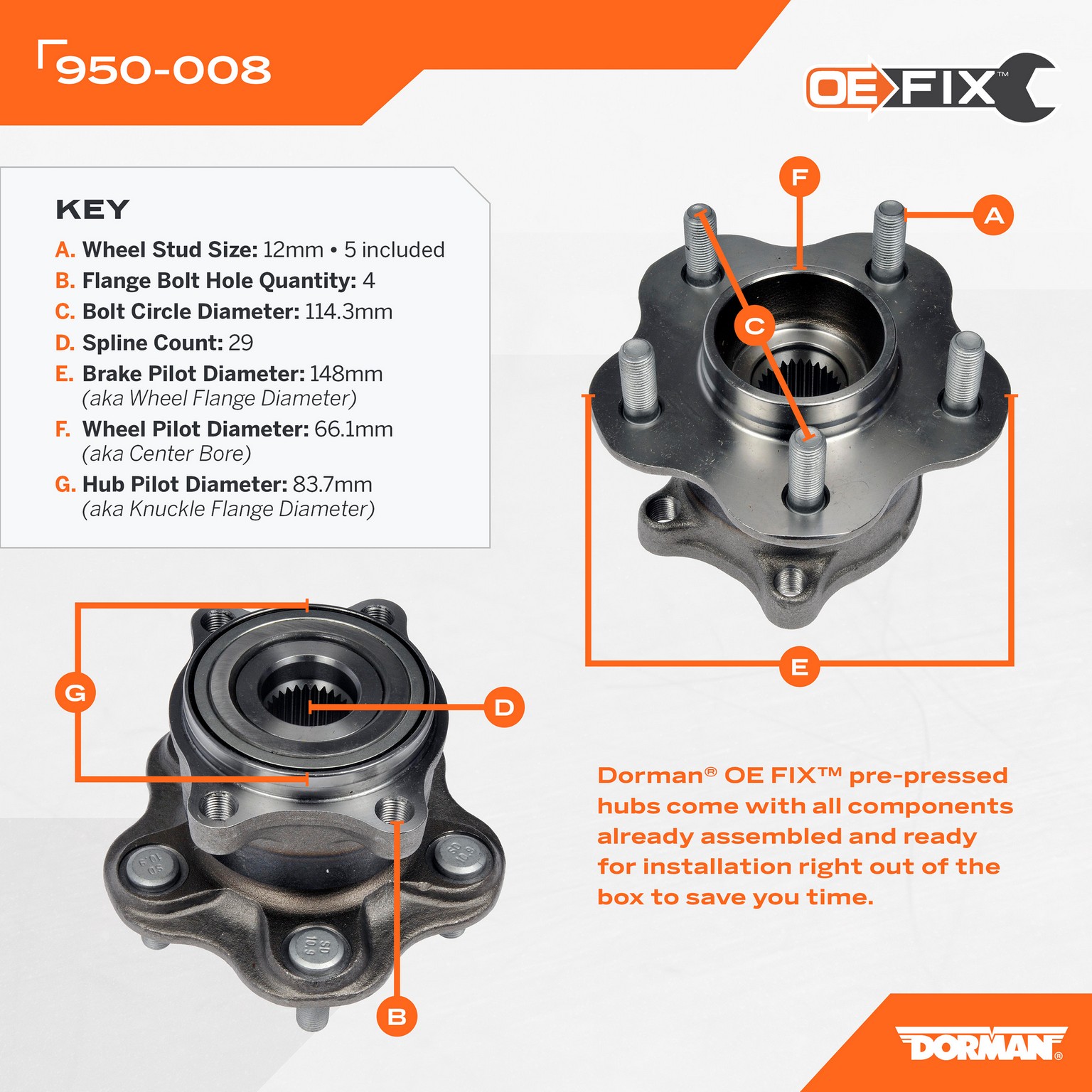 - Fixing a worn wheel bearing usually requires a difficult procedure using a shop press, or purchasing multiple components. This Dorman OE FIX pre-pressed hub includes all critical components already assembled for a fast, simple, safe install.