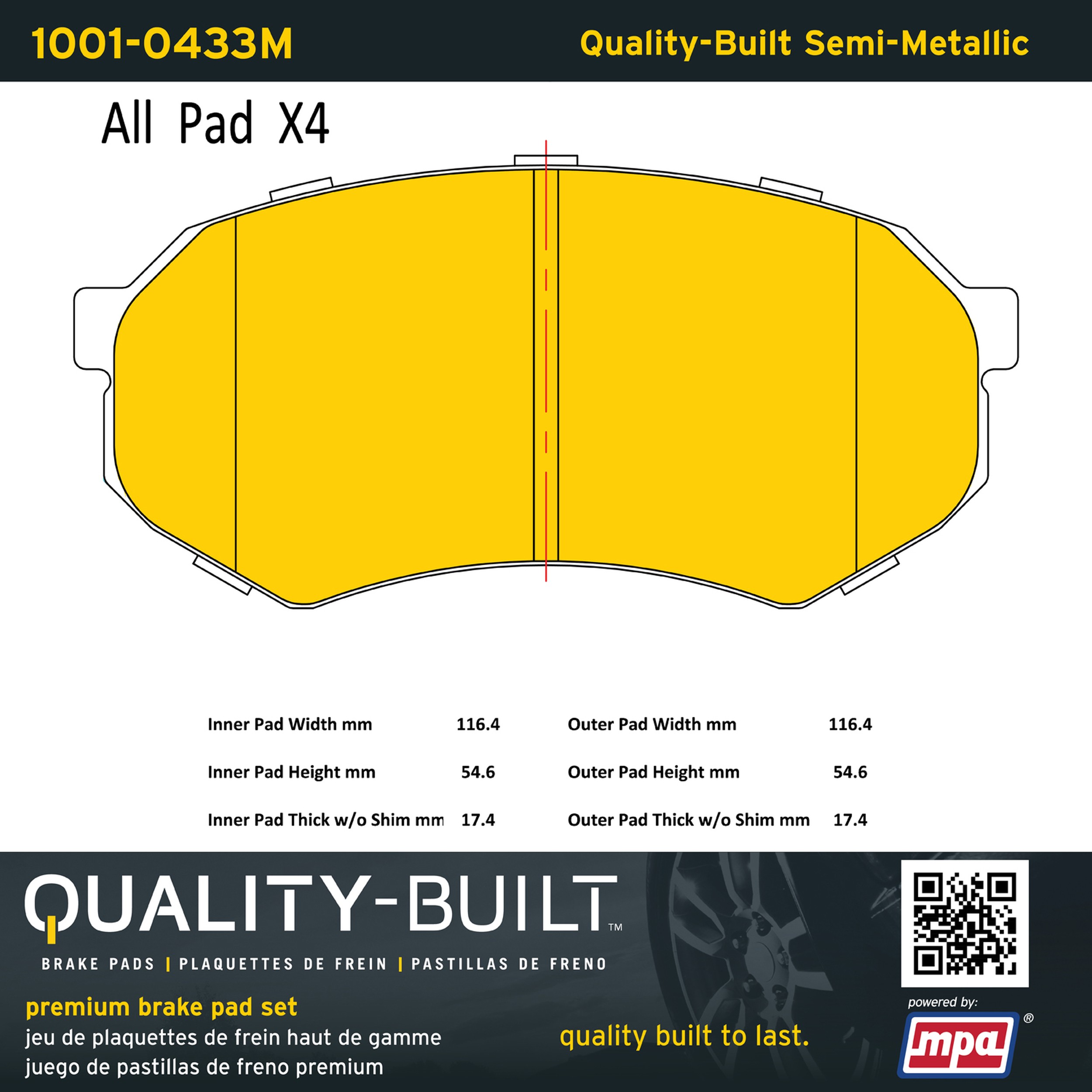 - Quality-Built Premium Brake Pads provide optimized stopping power in all conditions. Application-specific pad formulas remove the guesswork from pad selection by providing friction compounds engineered to restore like-new stopping power for every vehicle. 2025 compliant, copper-free friction formulas deliver dependable performance across a wide thermal range with low brake dust and zero noise.