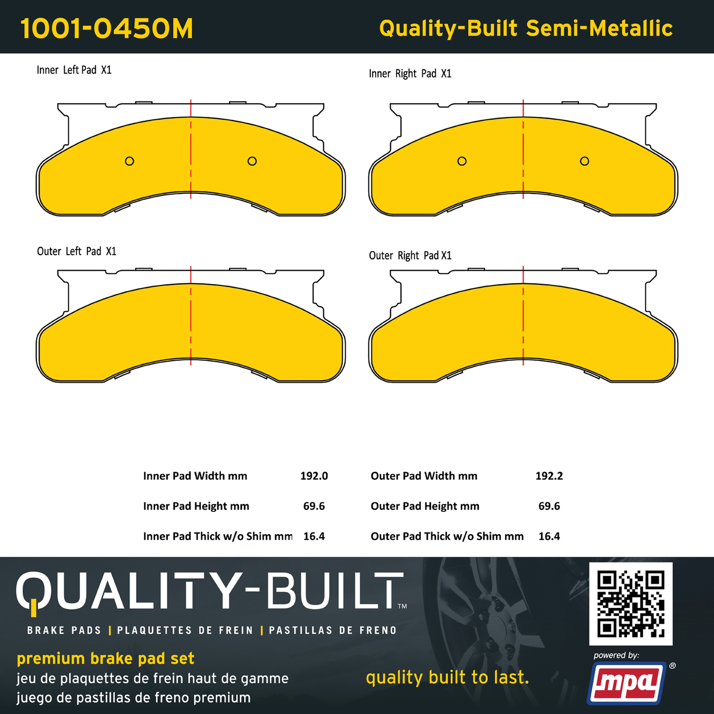 - Quality-Built Premium Brake Pads provide optimized stopping power in all conditions. Application-specific pad formulas remove the guesswork from pad selection by providing friction compounds engineered to restore like-new stopping power for every vehicle. 2025 compliant, copper-free friction formulas deliver dependable performance across a wide thermal range with low brake dust and zero noise.