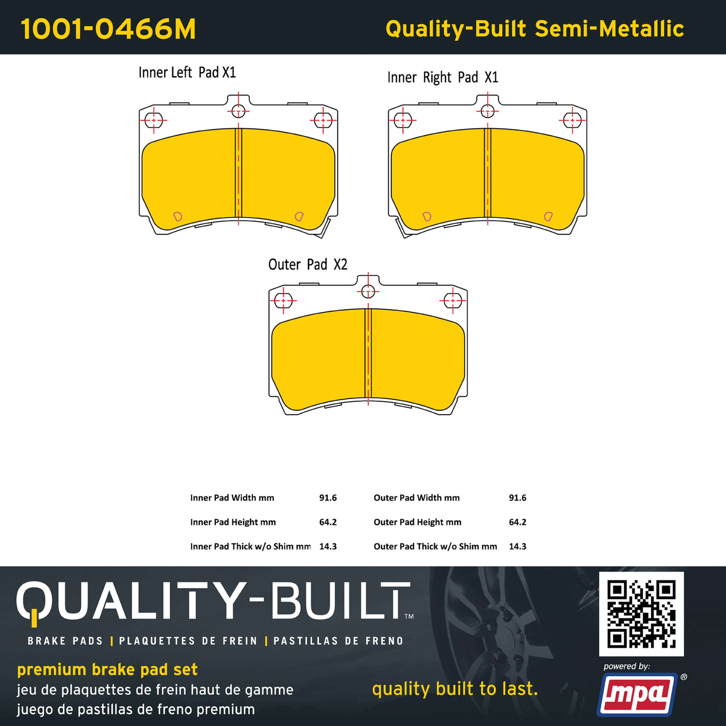 - Quality-Built Premium Brake Pads provide optimized stopping power in all conditions. Application-specific pad formulas remove the guesswork from pad selection by providing friction compounds engineered to restore like-new stopping power for every vehicle. 2025 compliant, copper-free friction formulas deliver dependable performance across a wide thermal range with low brake dust and zero noise.