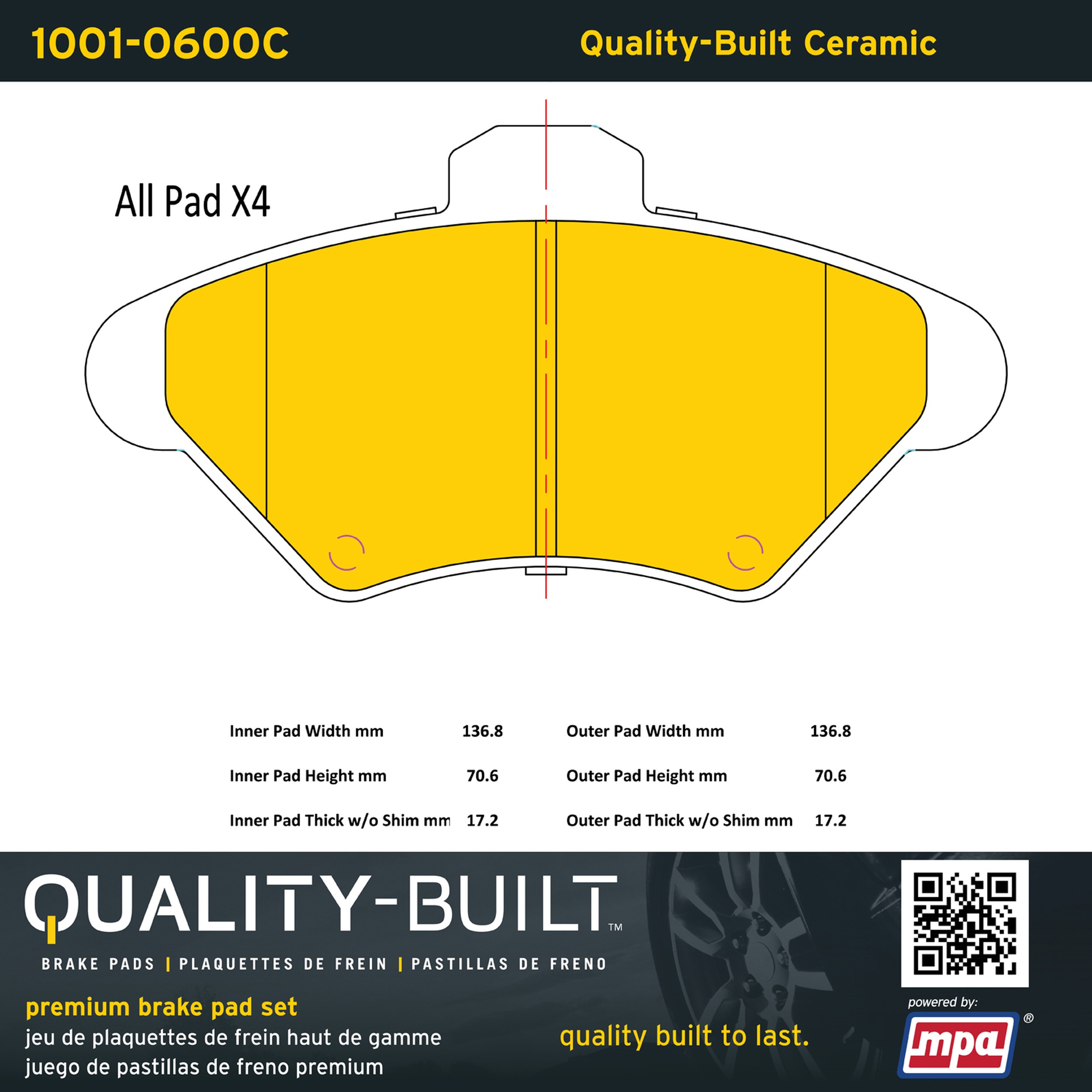 - Quality-Built Premium Brake Pads provide optimized stopping power in all conditions. Application-specific pad formulas remove the guesswork from pad selection by providing friction compounds engineered to restore like-new stopping power for every vehicle. 2025 compliant, copper-free friction formulas deliver dependable performance across a wide thermal range with low brake dust and zero noise.