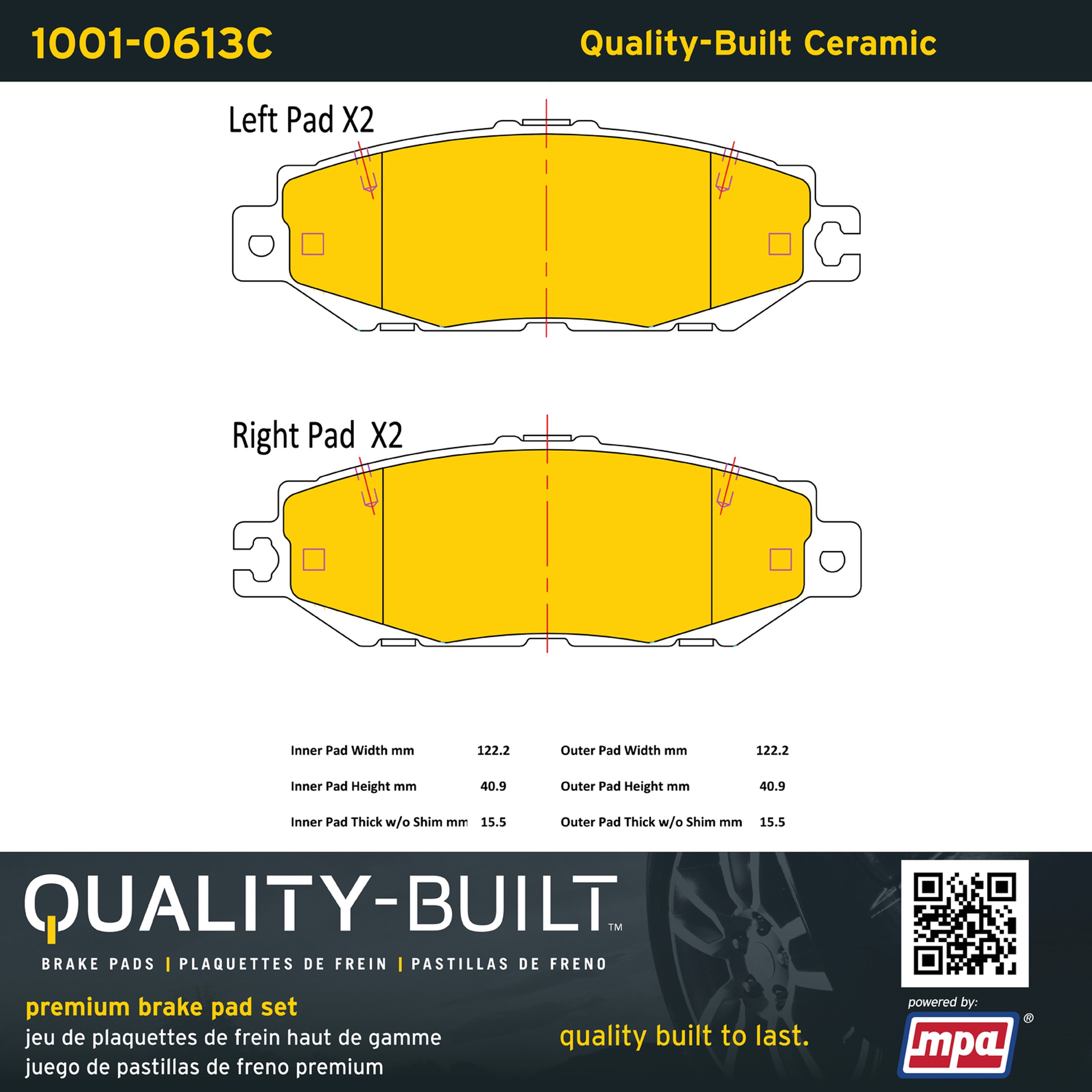 - Quality-Built Premium Brake Pads provide optimized stopping power in all conditions. Application-specific pad formulas remove the guesswork from pad selection by providing friction compounds engineered to restore like-new stopping power for every vehicle. 2025 compliant, copper-free friction formulas deliver dependable performance across a wide thermal range with low brake dust and zero noise.