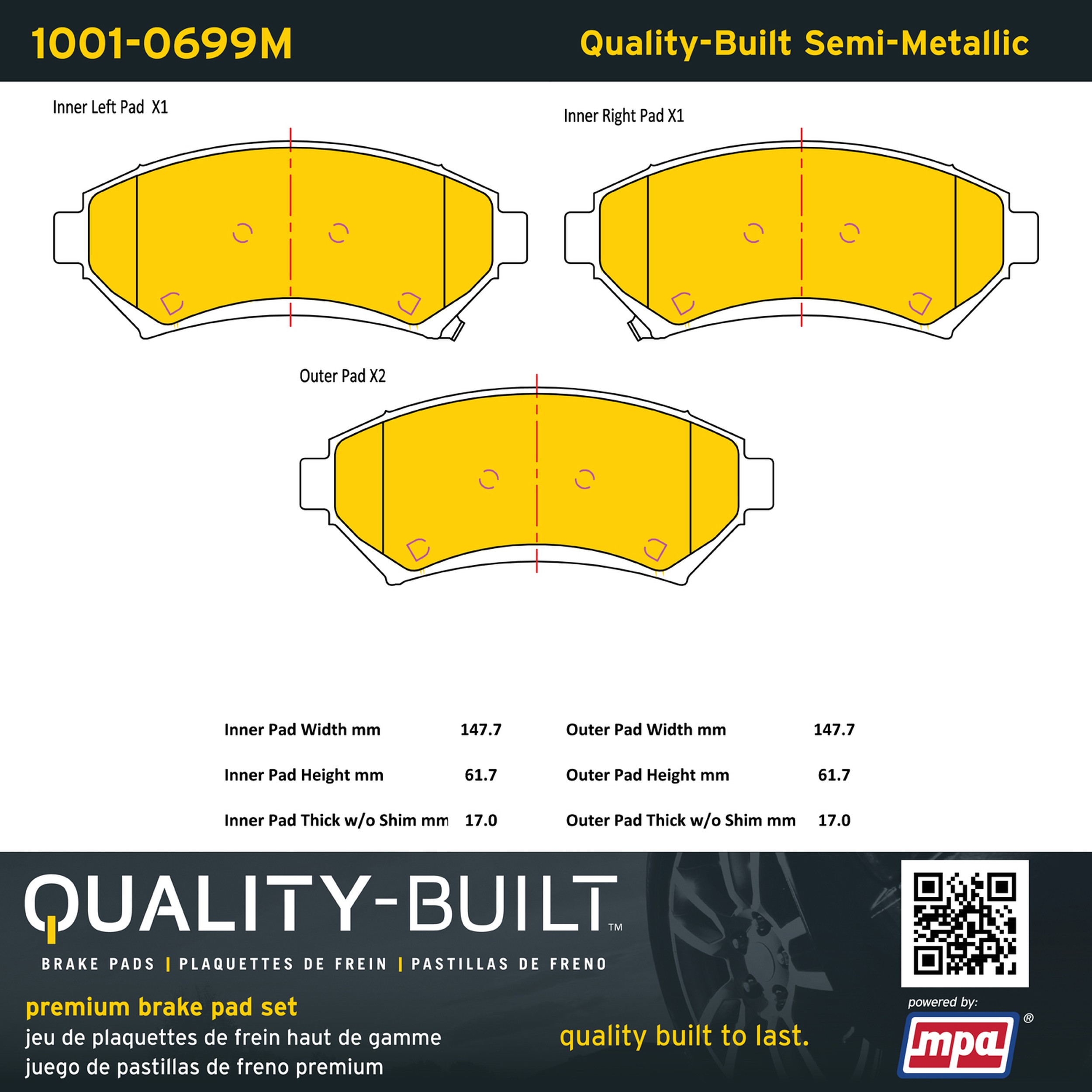 - Quality-Built Premium Brake Pads provide optimized stopping power in all conditions. Application-specific pad formulas remove the guesswork from pad selection by providing friction compounds engineered to restore like-new stopping power for every vehicle. 2025 compliant, copper-free friction formulas deliver dependable performance across a wide thermal range with low brake dust and zero noise.