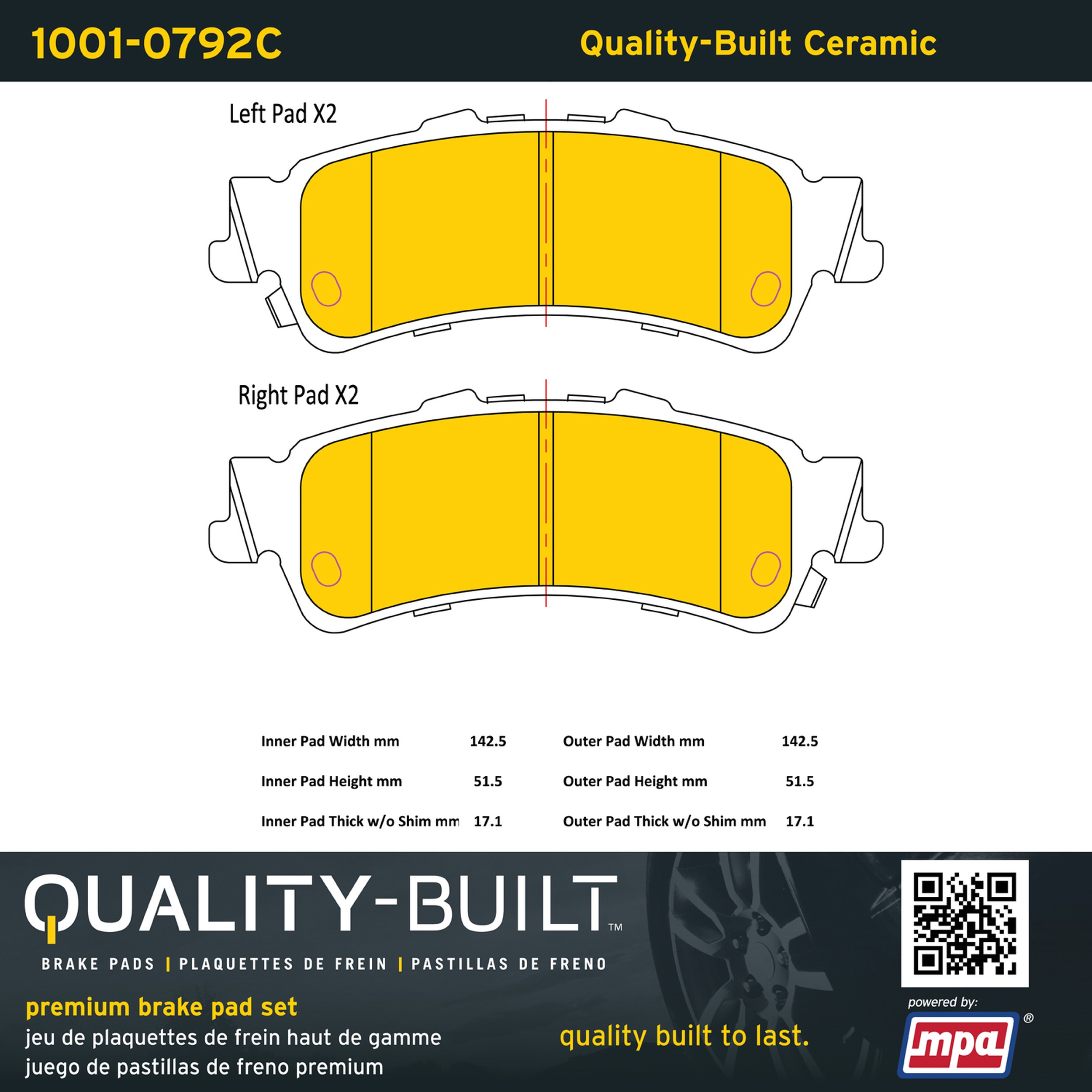 - Quality-Built Premium Brake Pads provide optimized stopping power in all conditions. Application-specific pad formulas remove the guesswork from pad selection by providing friction compounds engineered to restore like-new stopping power for every vehicle. 2025 compliant, copper-free friction formulas deliver dependable performance across a wide thermal range with low brake dust and zero noise.