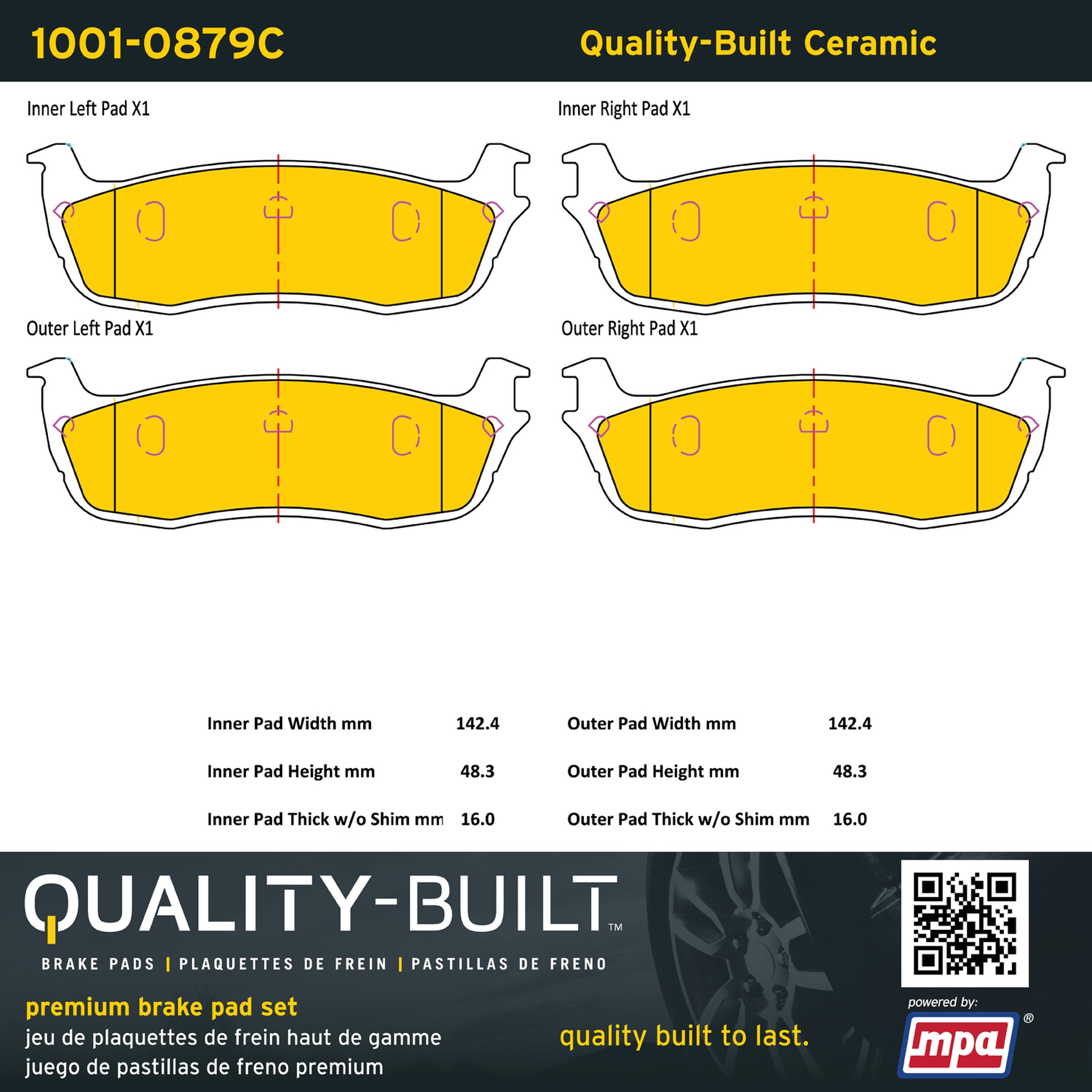 - Quality-Built Premium Brake Pads provide optimized stopping power in all conditions. Application-specific pad formulas remove the guesswork from pad selection by providing friction compounds engineered to restore like-new stopping power for every vehicle. 2025 compliant, copper-free friction formulas deliver dependable performance across a wide thermal range with low brake dust and zero noise.