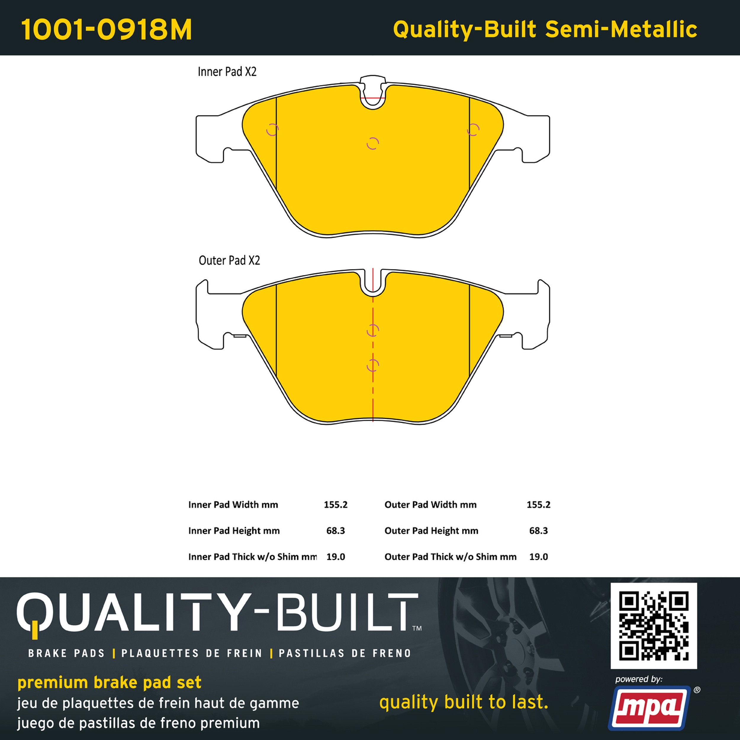 - Quality-Built Premium Brake Pads provide optimized stopping power in all conditions. Application-specific pad formulas remove the guesswork from pad selection by providing friction compounds engineered to restore like-new stopping power for every vehicle. 2025 compliant, copper-free friction formulas deliver dependable performance across a wide thermal range with low brake dust and zero noise.