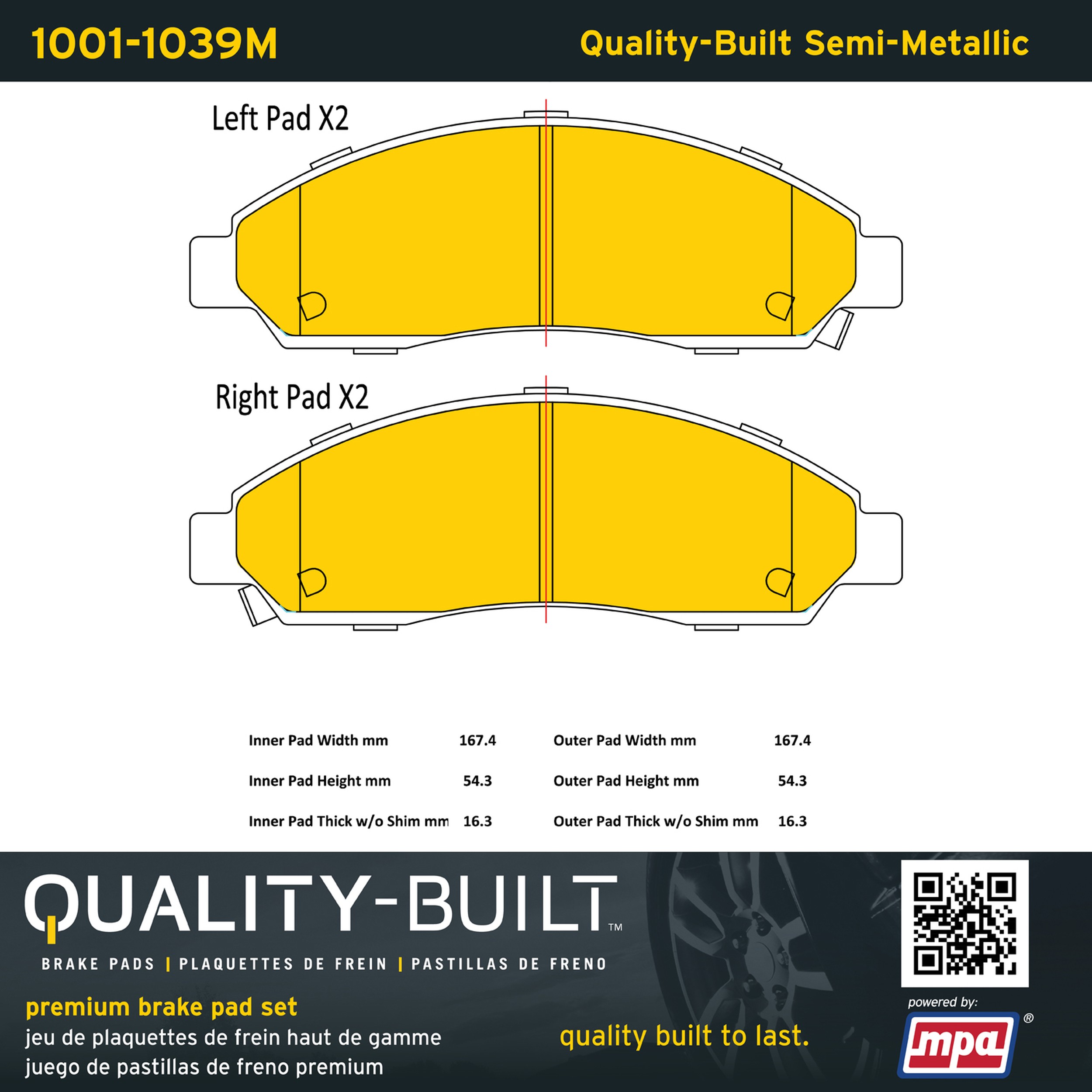 - Quality-Built Premium Brake Pads provide optimized stopping power in all conditions. Application-specific pad formulas remove the guesswork from pad selection by providing friction compounds engineered to restore like-new stopping power for every vehicle. 2025 compliant, copper-free friction formulas deliver dependable performance across a wide thermal range with low brake dust and zero noise.