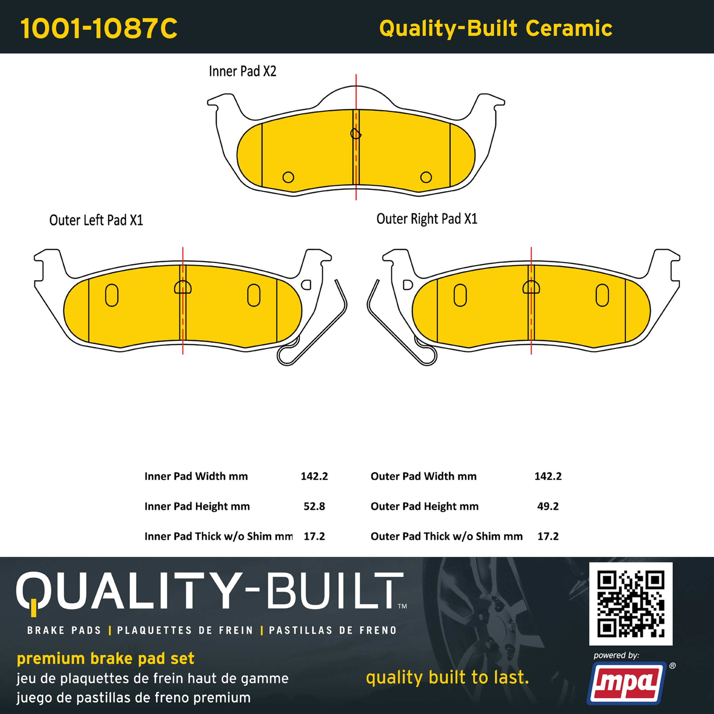 - Quality-Built Premium Brake Pads provide optimized stopping power in all conditions. Application-specific pad formulas remove the guesswork from pad selection by providing friction compounds engineered to restore like-new stopping power for every vehicle. 2025 compliant, copper-free friction formulas deliver dependable performance across a wide thermal range with low brake dust and zero noise.