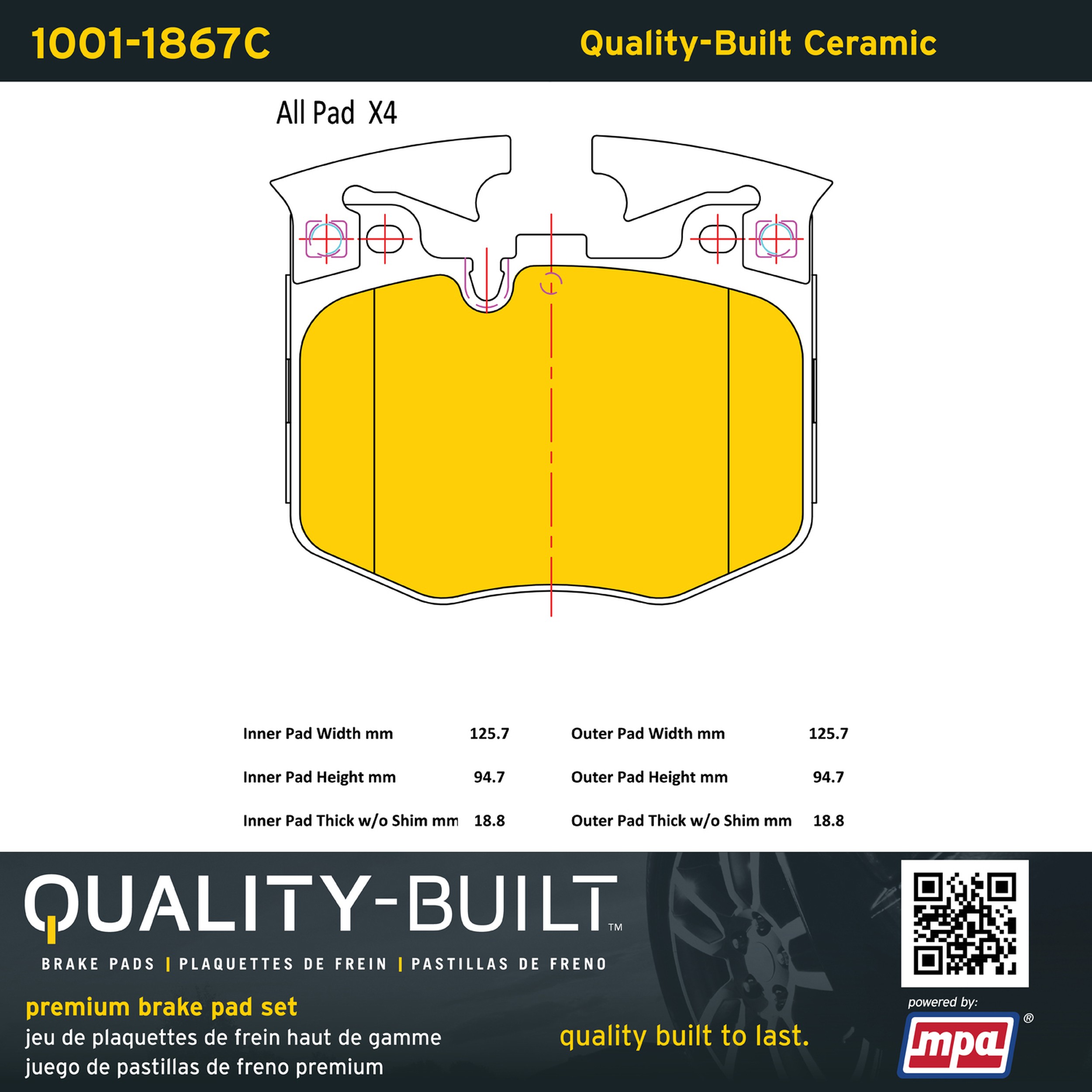- Quality-Built Premium Brake Pads provide optimized stopping power in all conditions. Application-specific pad formulas remove the guesswork from pad selection by providing friction compounds engineered to restore like-new stopping power for every vehicle. 2025 compliant, copper-free friction formulas deliver dependable performance across a wide thermal range with low brake dust and zero noise.