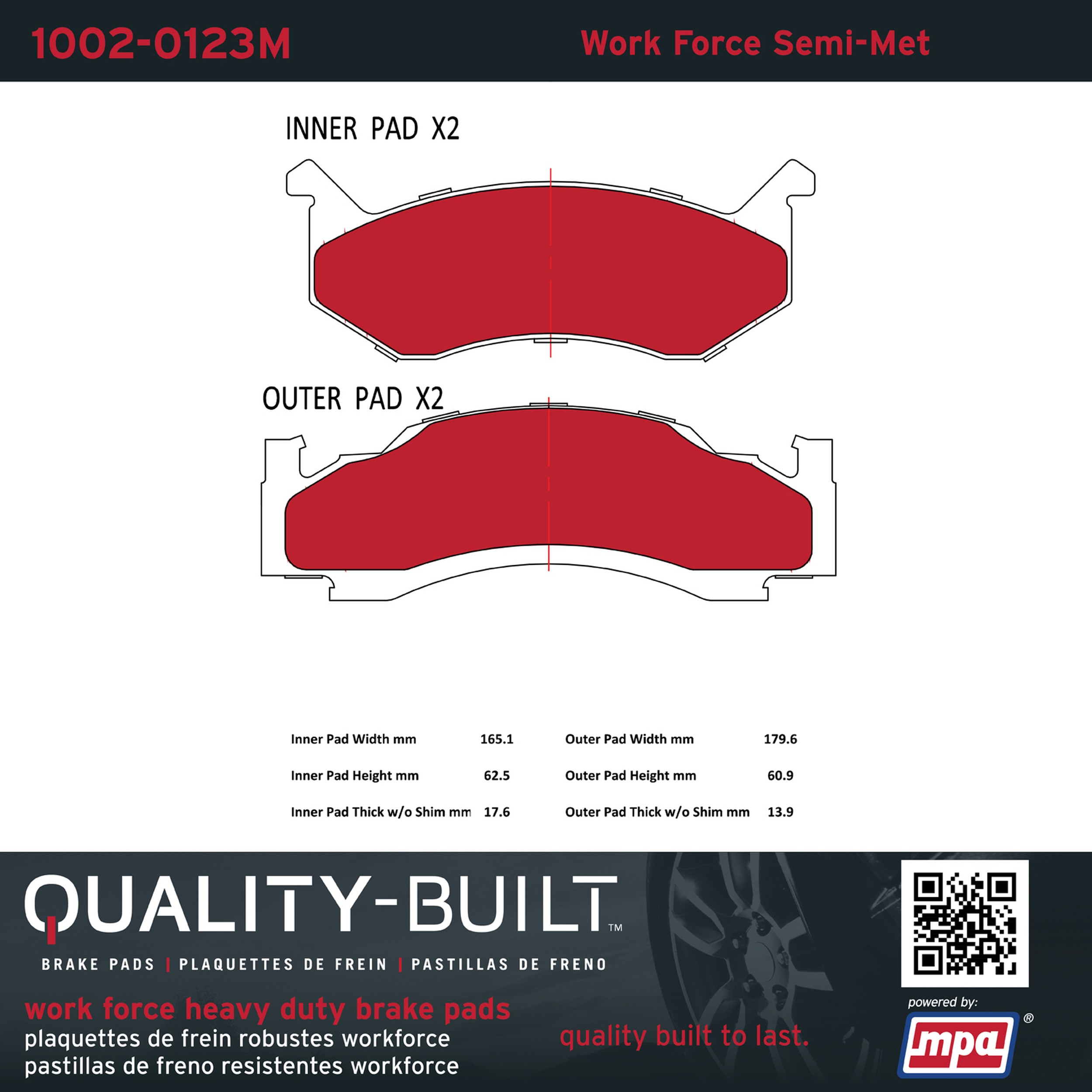 - Hardworking vehicles need hardworking brake pads, and Quality-Built Work force brake pads deliver every time. Specially formulated friction compounds are designed for high heat, heavy-duty use, where repeat stop situations, off-road driving, or towing push brake pads to the limits. Work force brake pads are an excellent choice for fleet use where extended service life and maximum durability are required.