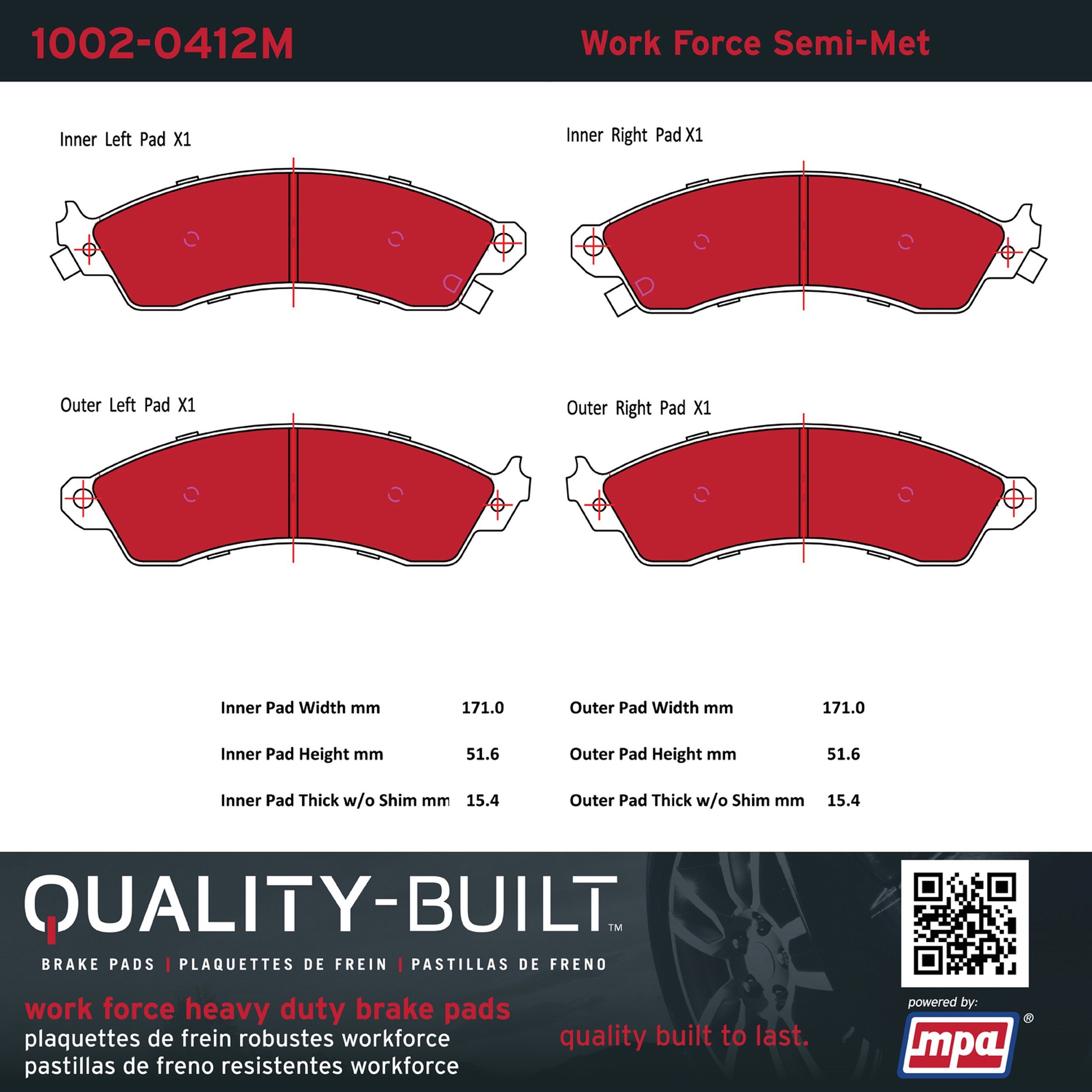 • Hardworking vehicles need hardworking brake pads, and Quality-Built Work force brake pads deliver every time. Specially formulated friction compounds are designed for high heat, heavy-duty use, where repeat stop situations, off-road driving, or towing push brake pads to the limits. Work force brake pads are an excellent choice for fleet use where extended service life and maximum durability are required.