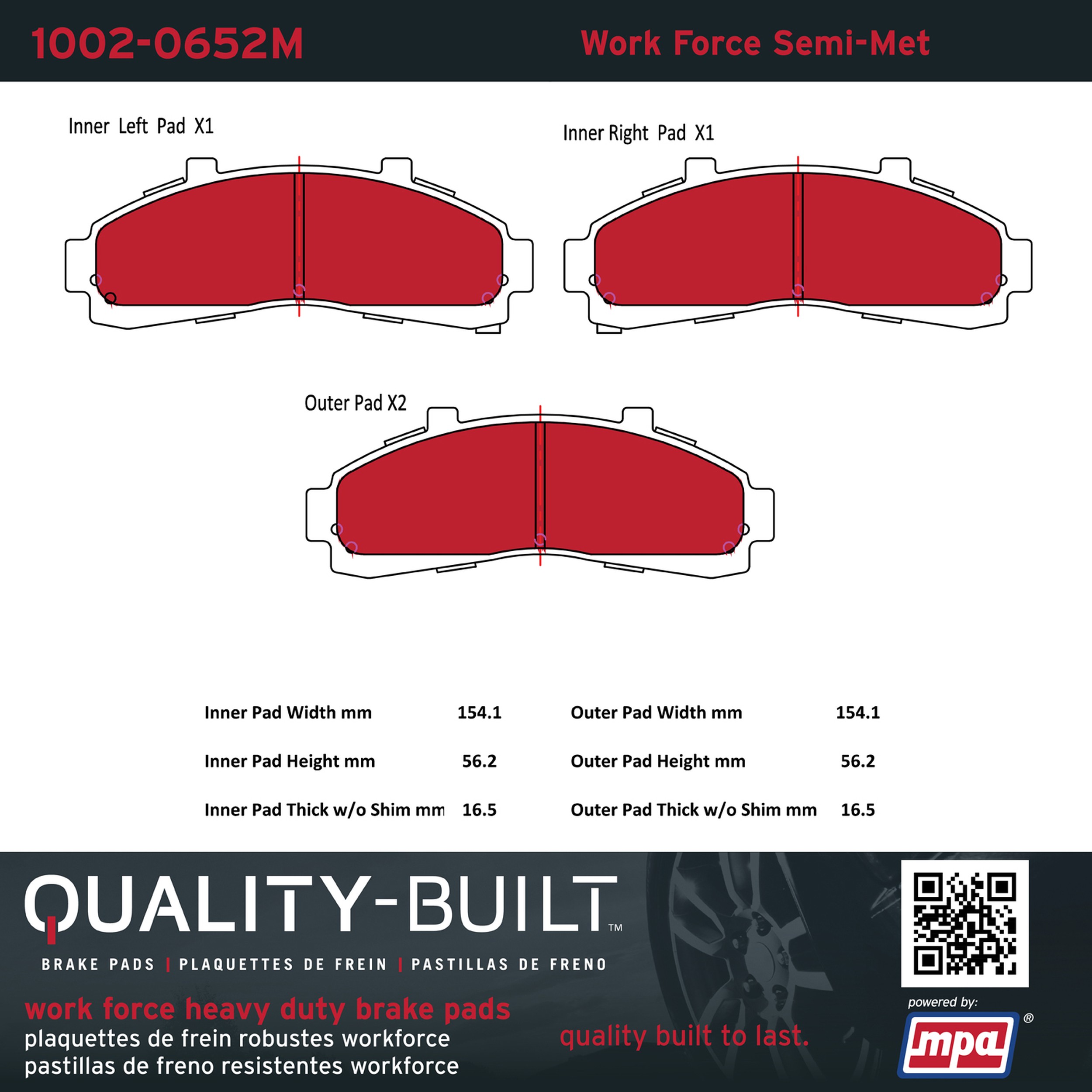 - Hardworking vehicles need hardworking brake pads, and Quality-Built Work force brake pads deliver every time. Specially formulated friction compounds are designed for high heat, heavy-duty use, where repeat stop situations, off-road driving, or towing push brake pads to the limits. Work force brake pads are an excellent choice for fleet use where extended service life and maximum durability are required.
