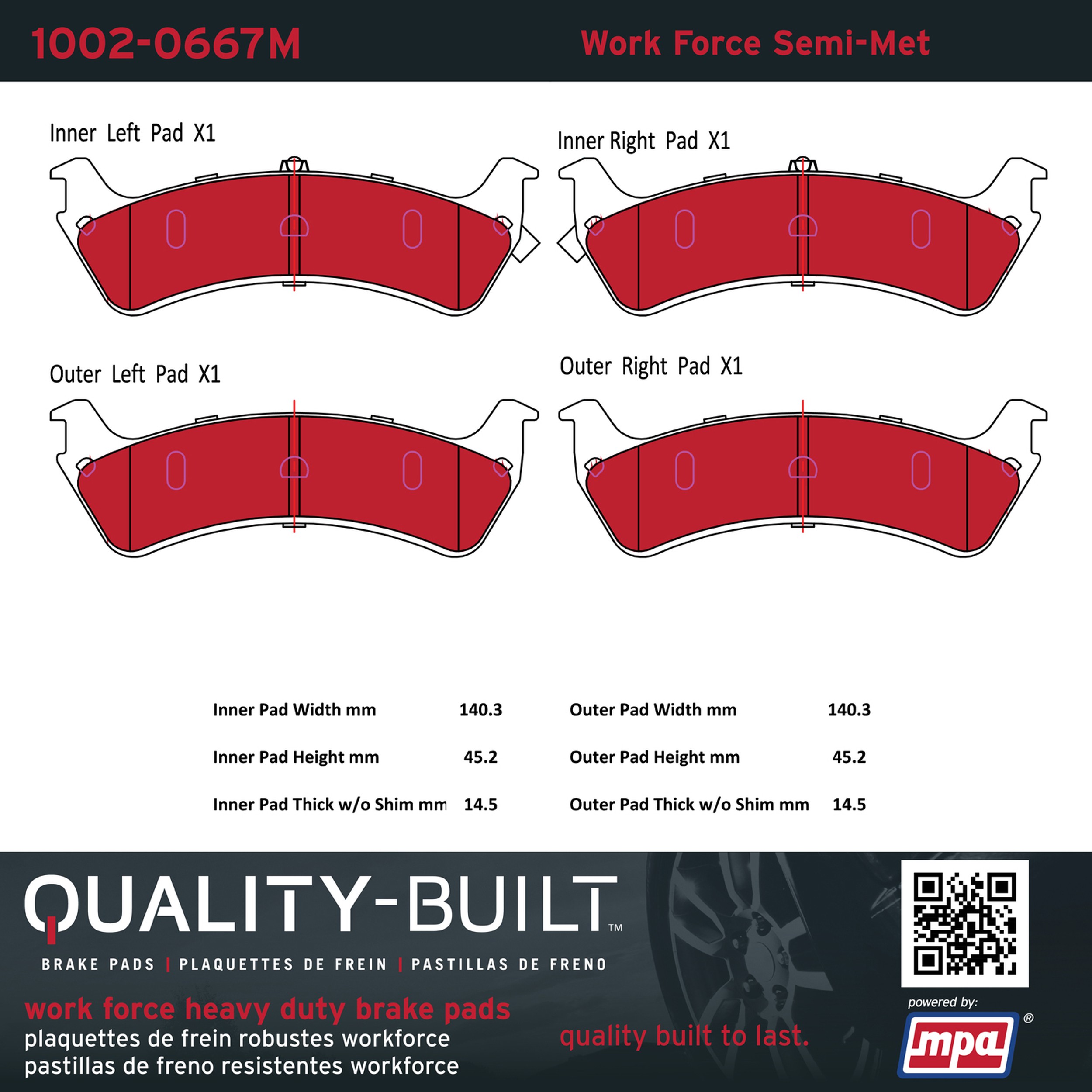 - Hardworking vehicles need hardworking brake pads, and Quality-Built Work force brake pads deliver every time. Specially formulated friction compounds are designed for high heat, heavy-duty use, where repeat stop situations, off-road driving, or towing push brake pads to the limits. Work force brake pads are an excellent choice for fleet use where extended service life and maximum durability are required.