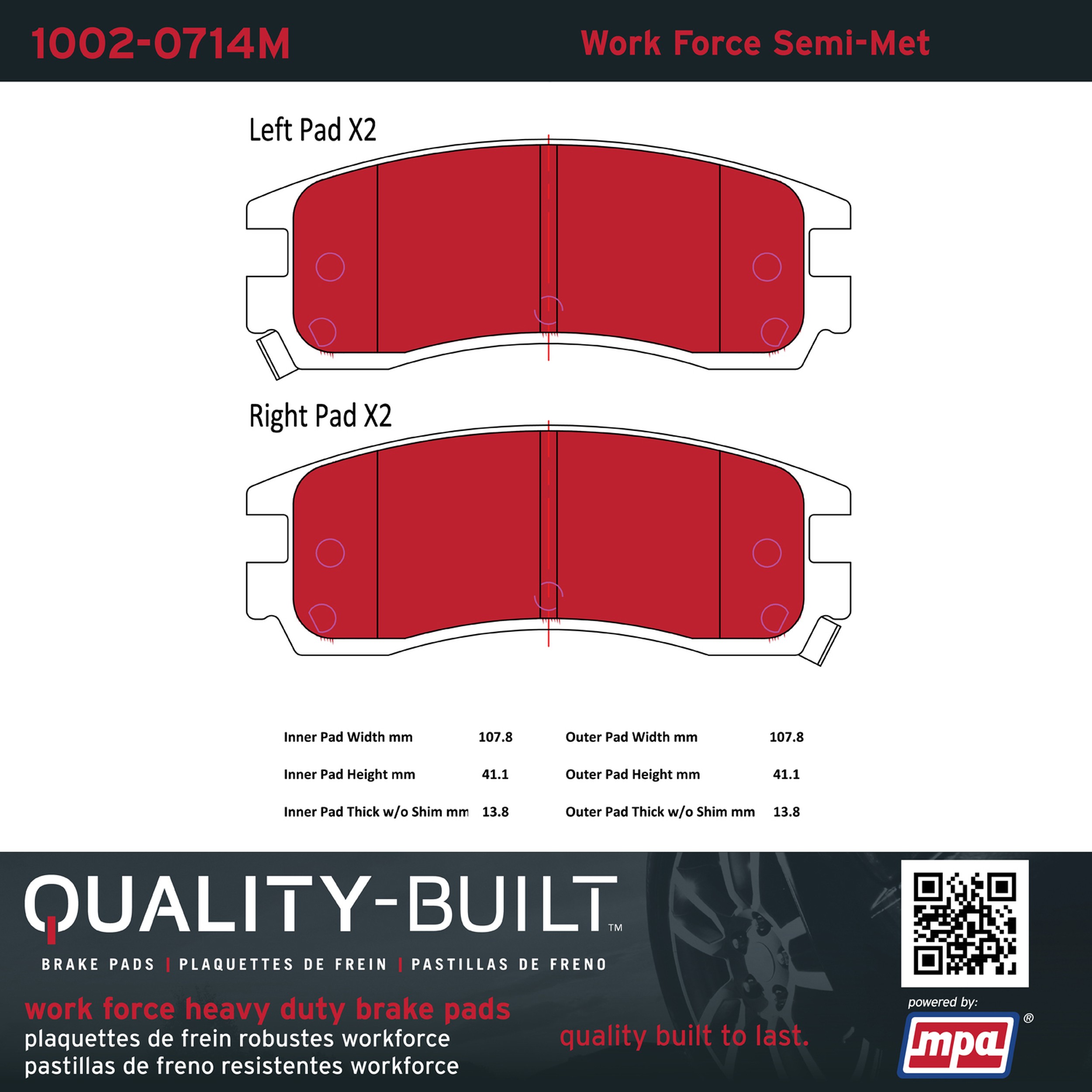 - Hardworking vehicles need hardworking brake pads, and Quality-Built Work force brake pads deliver every time. Specially formulated friction compounds are designed for high heat, heavy-duty use, where repeat stop situations, off-road driving, or towing push brake pads to the limits. Work force brake pads are an excellent choice for fleet use where extended service life and maximum durability are required.