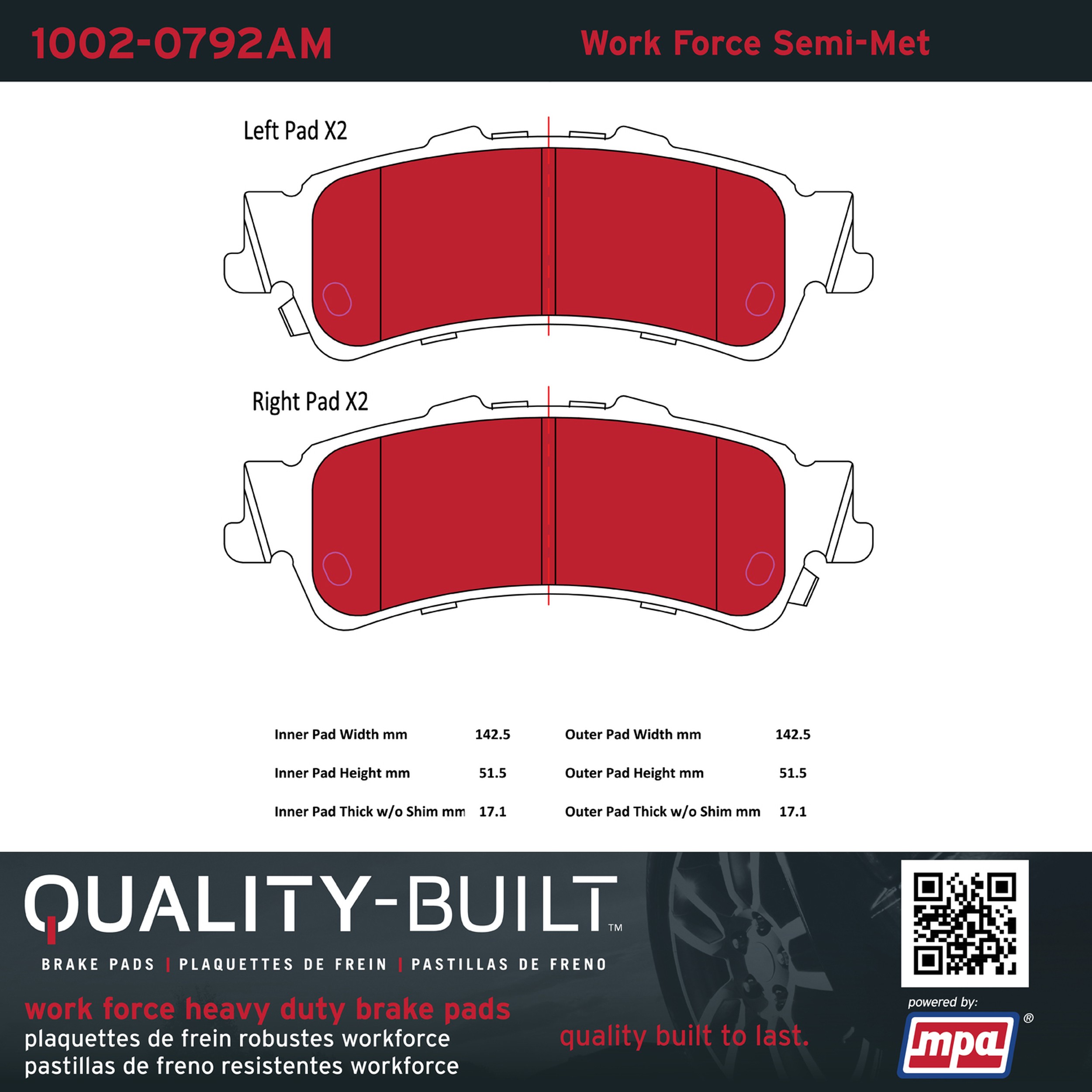 - Hardworking vehicles need hardworking brake pads, and Quality-Built Work force brake pads deliver every time. Specially formulated friction compounds are designed for high heat, heavy-duty use, where repeat stop situations, off-road driving, or towing push brake pads to the limits. Work force brake pads are an excellent choice for fleet use where extended service life and maximum durability are required.