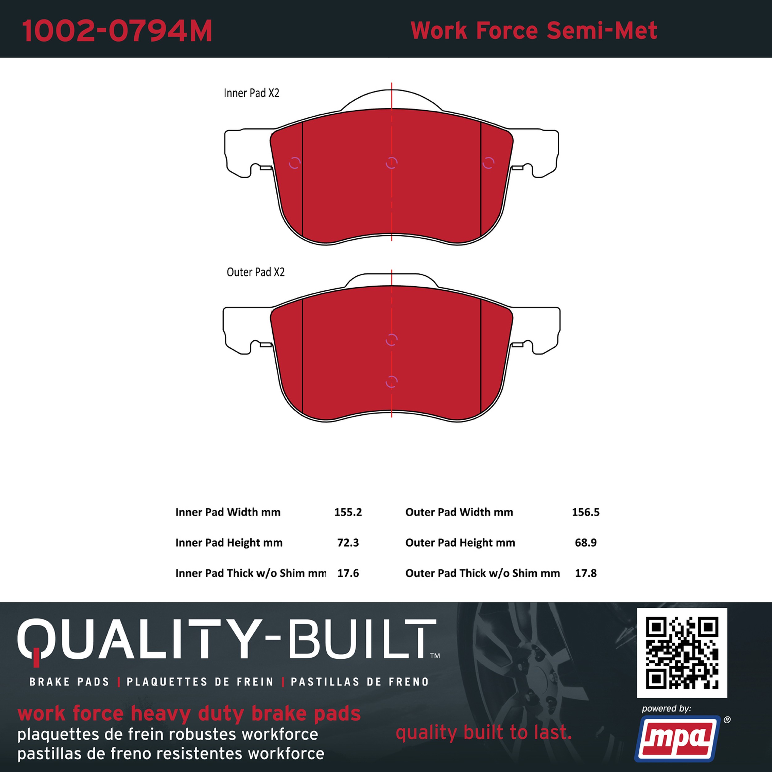 - Hardworking vehicles need hardworking brake pads, and Quality-Built Work force brake pads deliver every time. Specially formulated friction compounds are designed for high heat, heavy-duty use, where repeat stop situations, off-road driving, or towing push brake pads to the limits. Work force brake pads are an excellent choice for fleet use where extended service life and maximum durability are required.