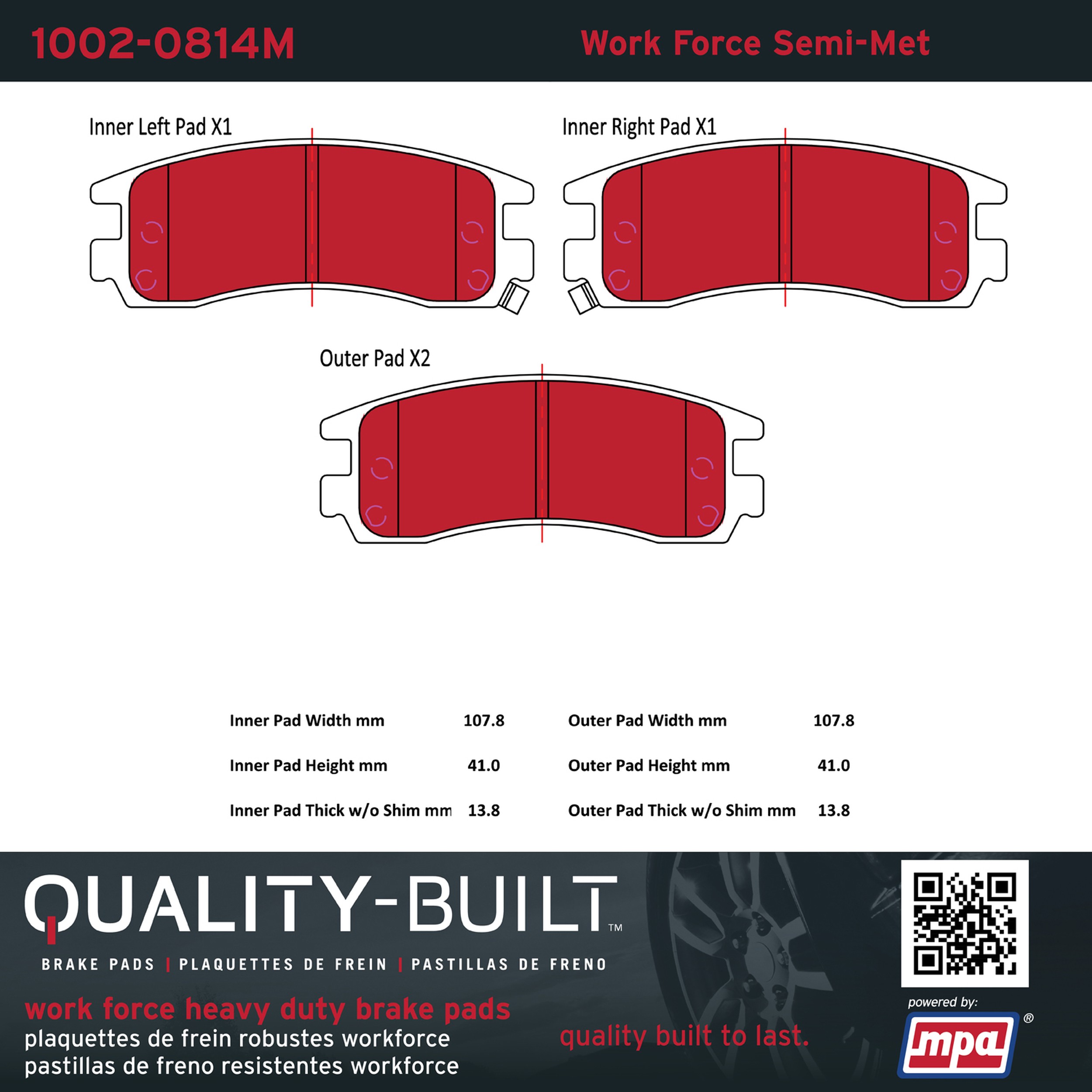 - Hardworking vehicles need hardworking brake pads, and Quality-Built Work force brake pads deliver every time. Specially formulated friction compounds are designed for high heat, heavy-duty use, where repeat stop situations, off-road driving, or towing push brake pads to the limits. Work force brake pads are an excellent choice for fleet use where extended service life and maximum durability are required.