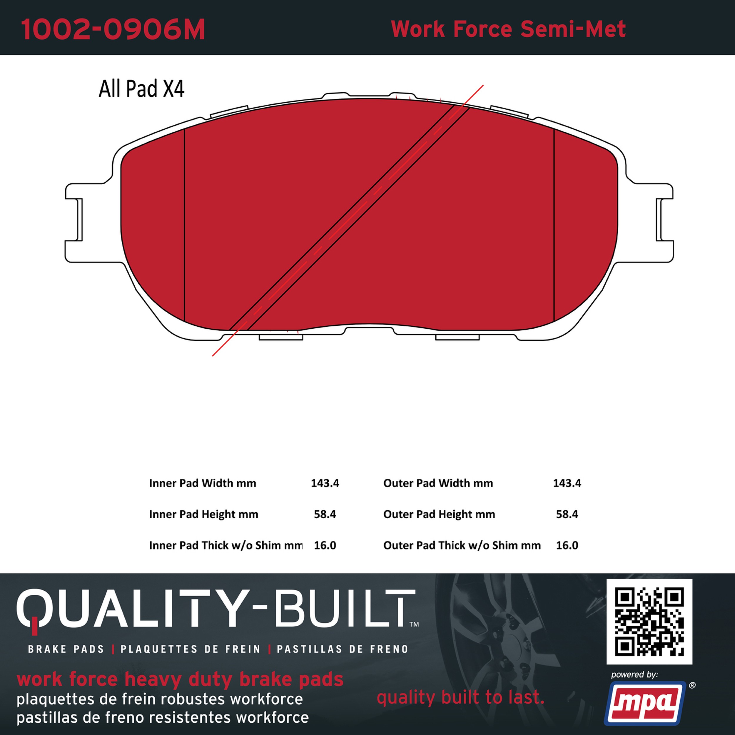 - Hardworking vehicles need hardworking brake pads, and Quality-Built Work force brake pads deliver every time. Specially formulated friction compounds are designed for high heat, heavy-duty use, where repeat stop situations, off-road driving, or towing push brake pads to the limits. Work force brake pads are an excellent choice for fleet use where extended service life and maximum durability are required.