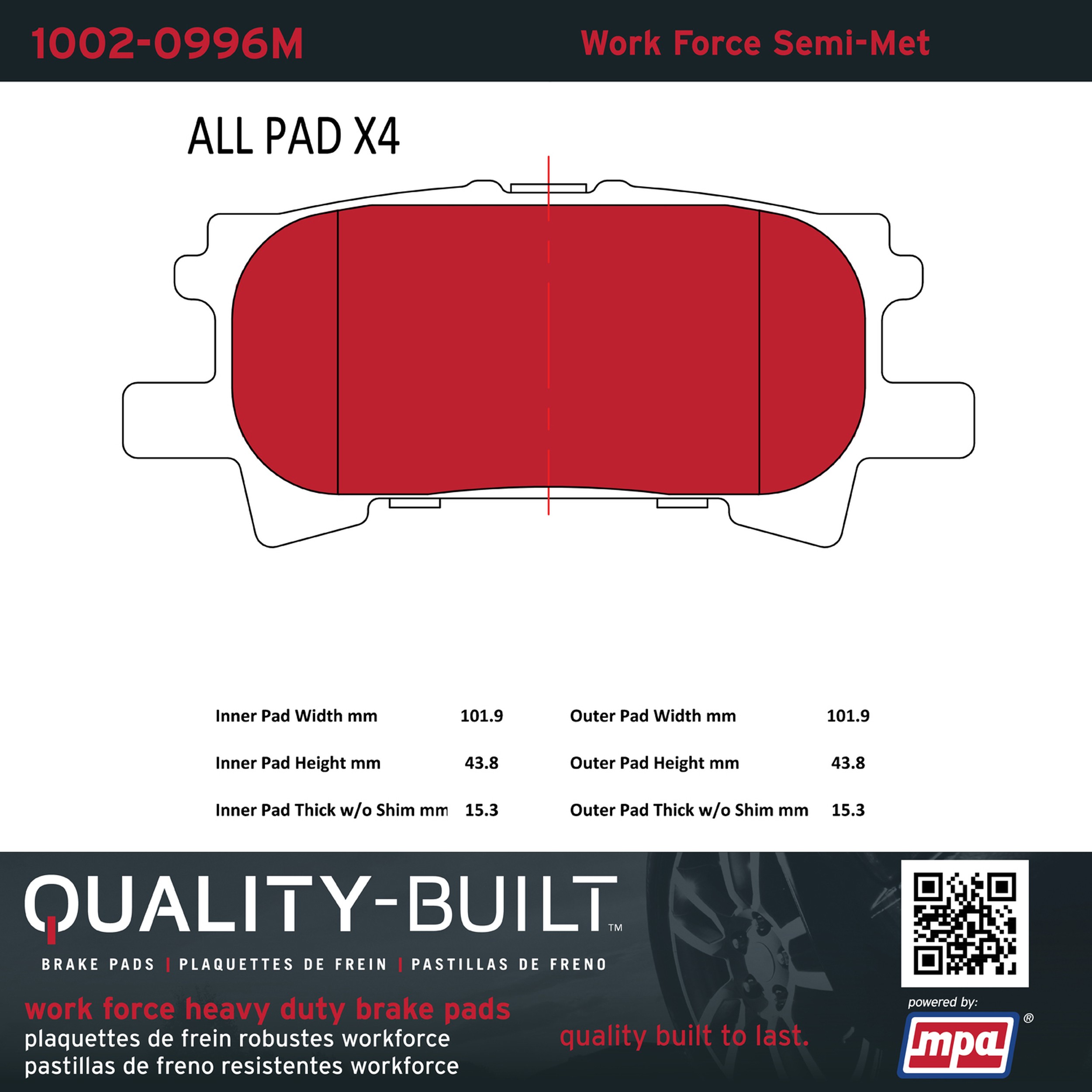 - Hardworking vehicles need hardworking brake pads, and Quality-Built Work force brake pads deliver every time. Specially formulated friction compounds are designed for high heat, heavy-duty use, where repeat stop situations, off-road driving, or towing push brake pads to the limits. Work force brake pads are an excellent choice for fleet use where extended service life and maximum durability are required.
