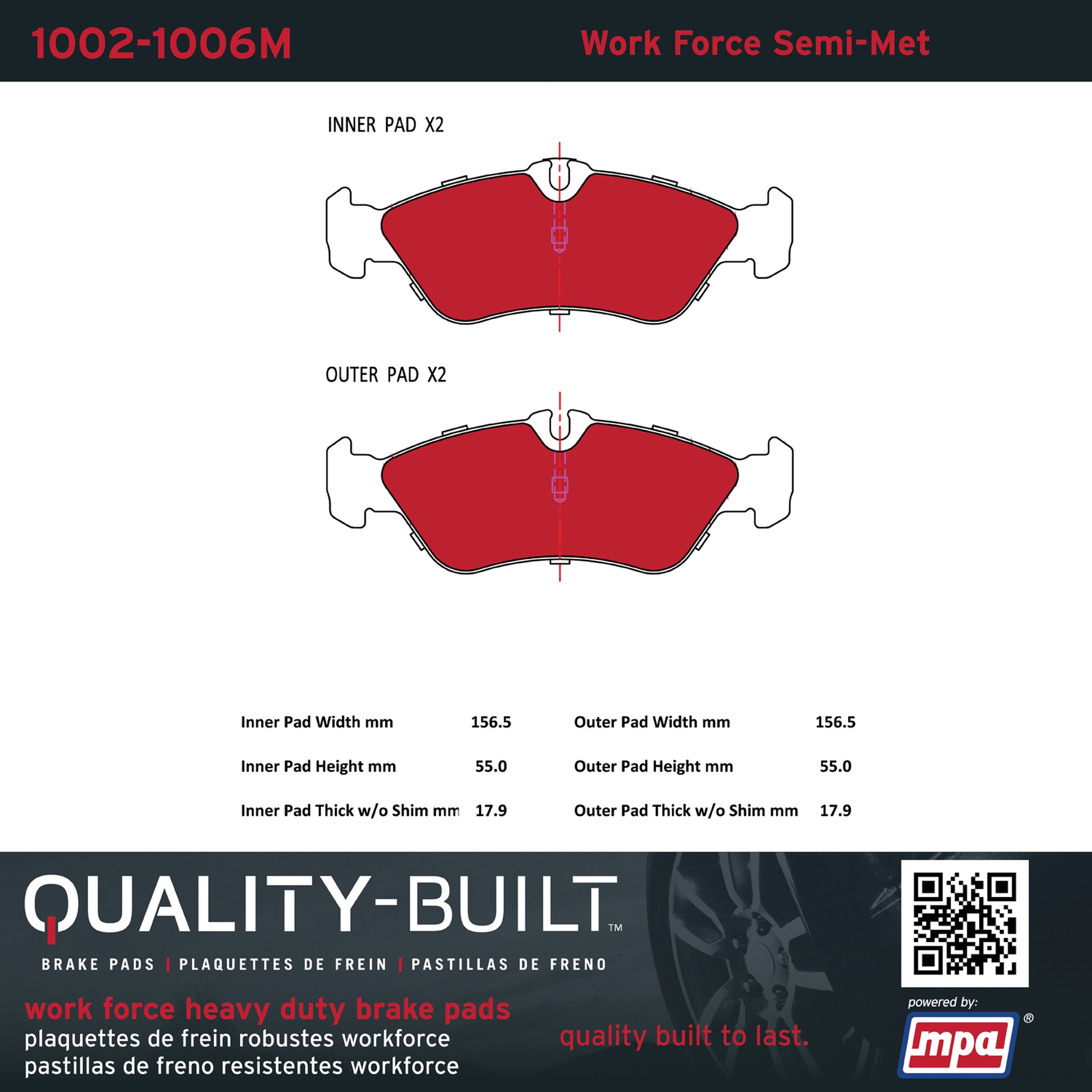 - Hardworking vehicles need hardworking brake pads, and Quality-Built Work force brake pads deliver every time. Specially formulated friction compounds are designed for high heat, heavy-duty use, where repeat stop situations, off-road driving, or towing push brake pads to the limits. Work force brake pads are an excellent choice for fleet use where extended service life and maximum durability are required.