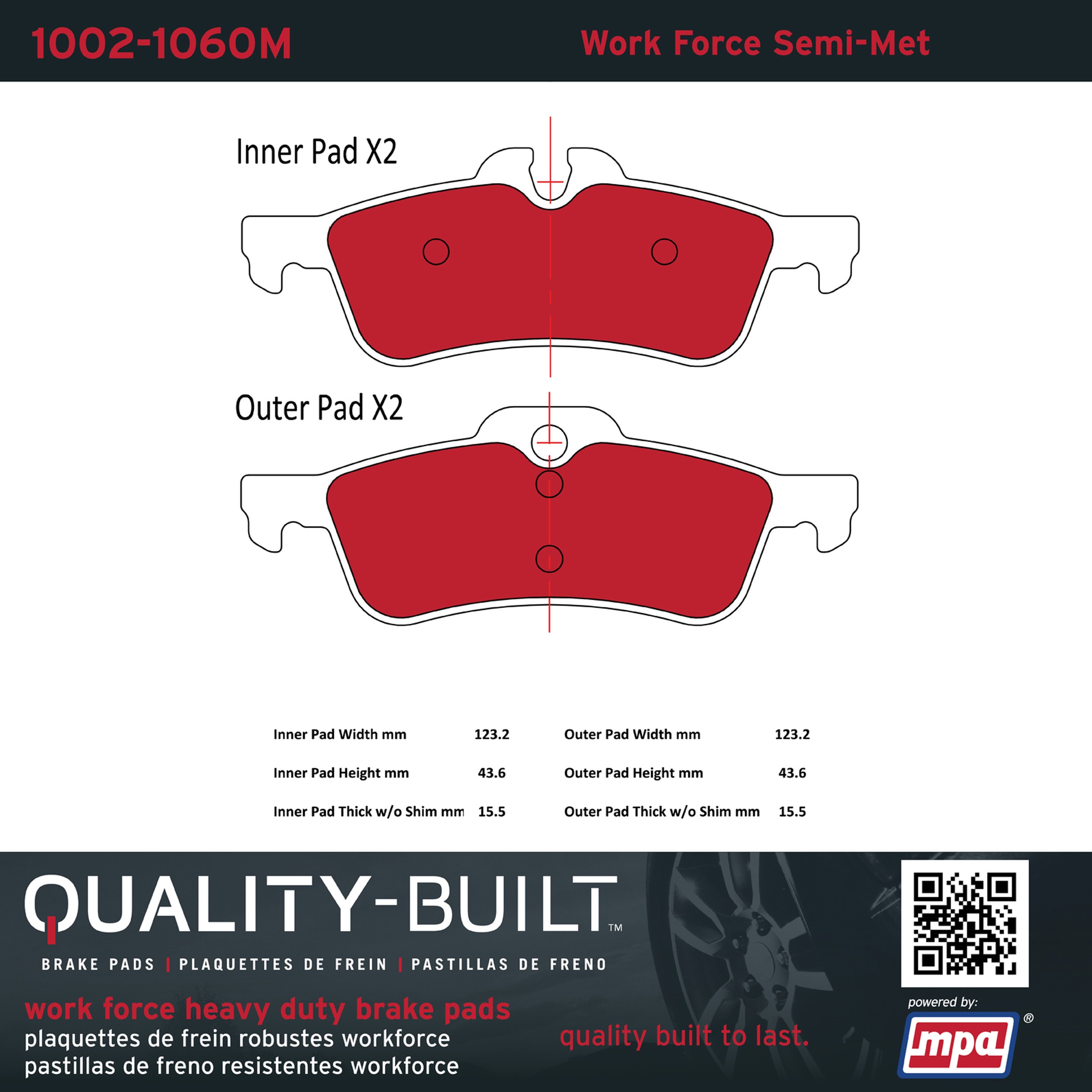 - Hardworking vehicles need hardworking brake pads, and Quality-Built Work force brake pads deliver every time. Specially formulated friction compounds are designed for high heat, heavy-duty use, where repeat stop situations, off-road driving, or towing push brake pads to the limits. Work force brake pads are an excellent choice for fleet use where extended service life and maximum durability are required.