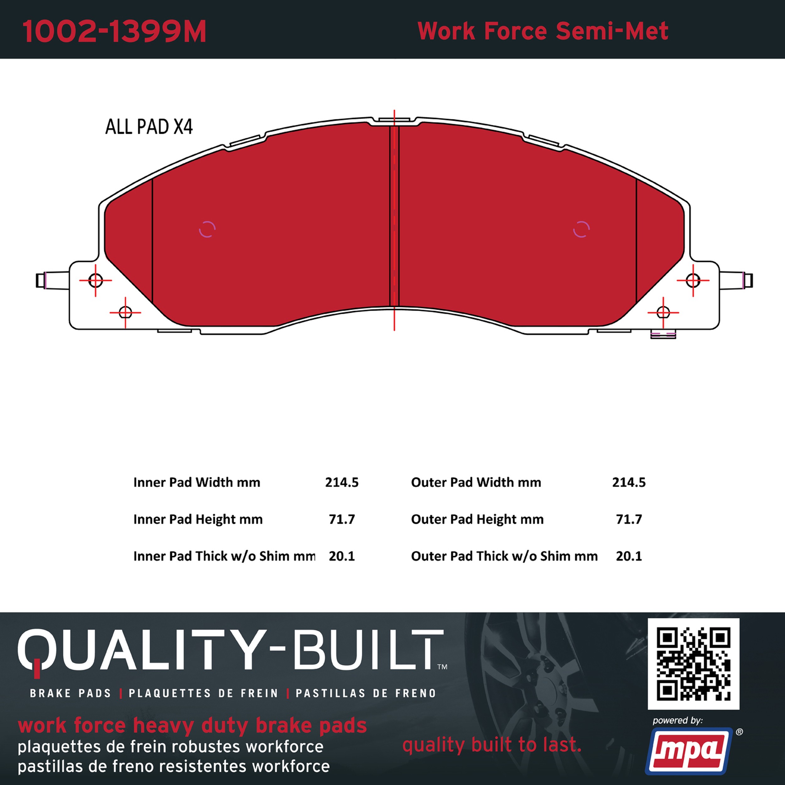 • Hardworking vehicles need hardworking brake pads, and Quality-Built Work force brake pads deliver every time. Specially formulated friction compounds are designed for high heat, heavy-duty use, where repeat stop situations, off-road driving, or towing push brake pads to the limits. Work force brake pads are an excellent choice for fleet use where extended service life and maximum durability are required.