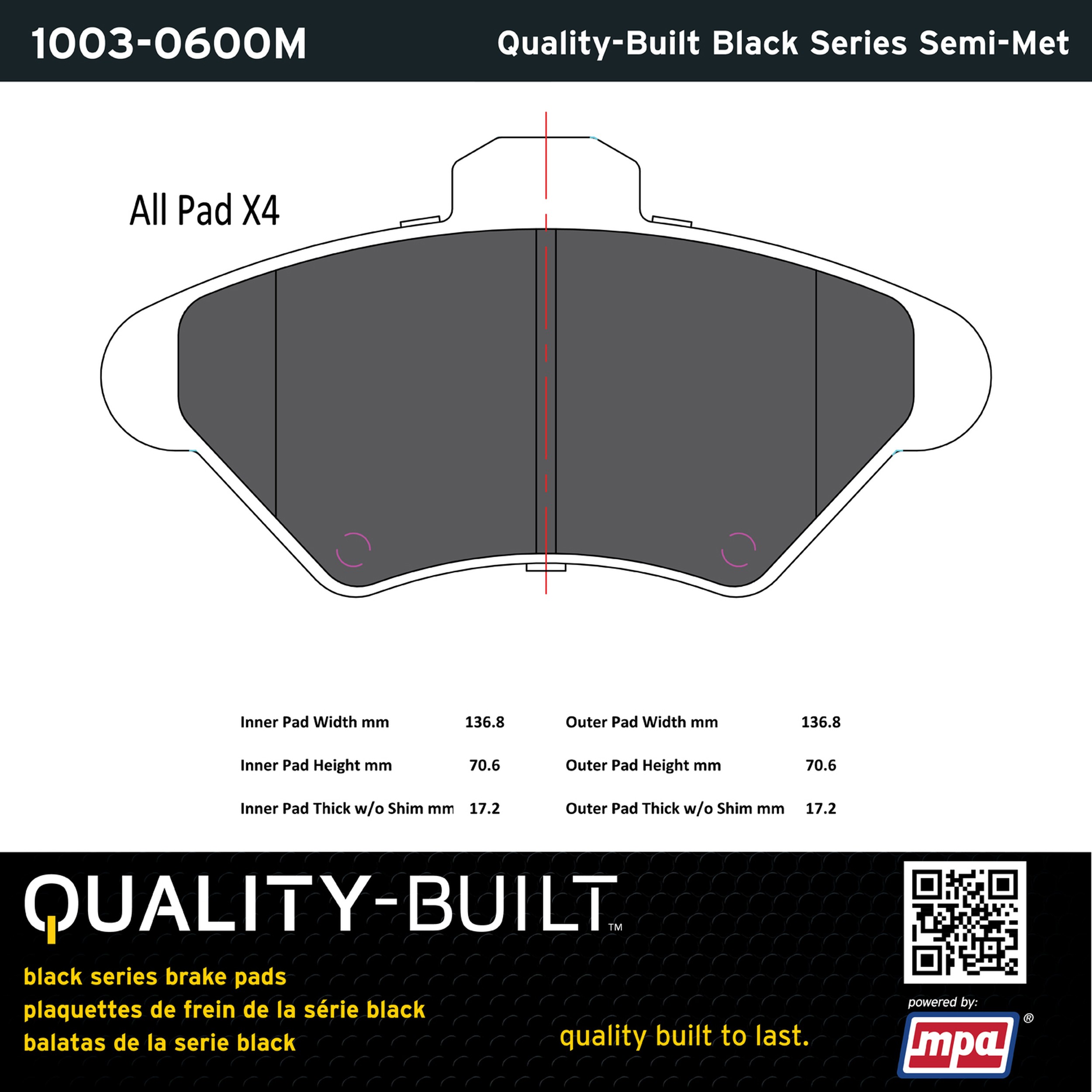 - Quality-Built Black Series Brake Pads are the ultimate in brake pad performance, delivering smooth, reliable stopping with zero noise and low dust. Application-specific friction formulas take the guesswork out of pad selection while providing even, predictable pedal feel and fade-free stopping power across a wide thermal range. Black Series friction compounds are engineered for optimized brake system performance and improved stopping power.