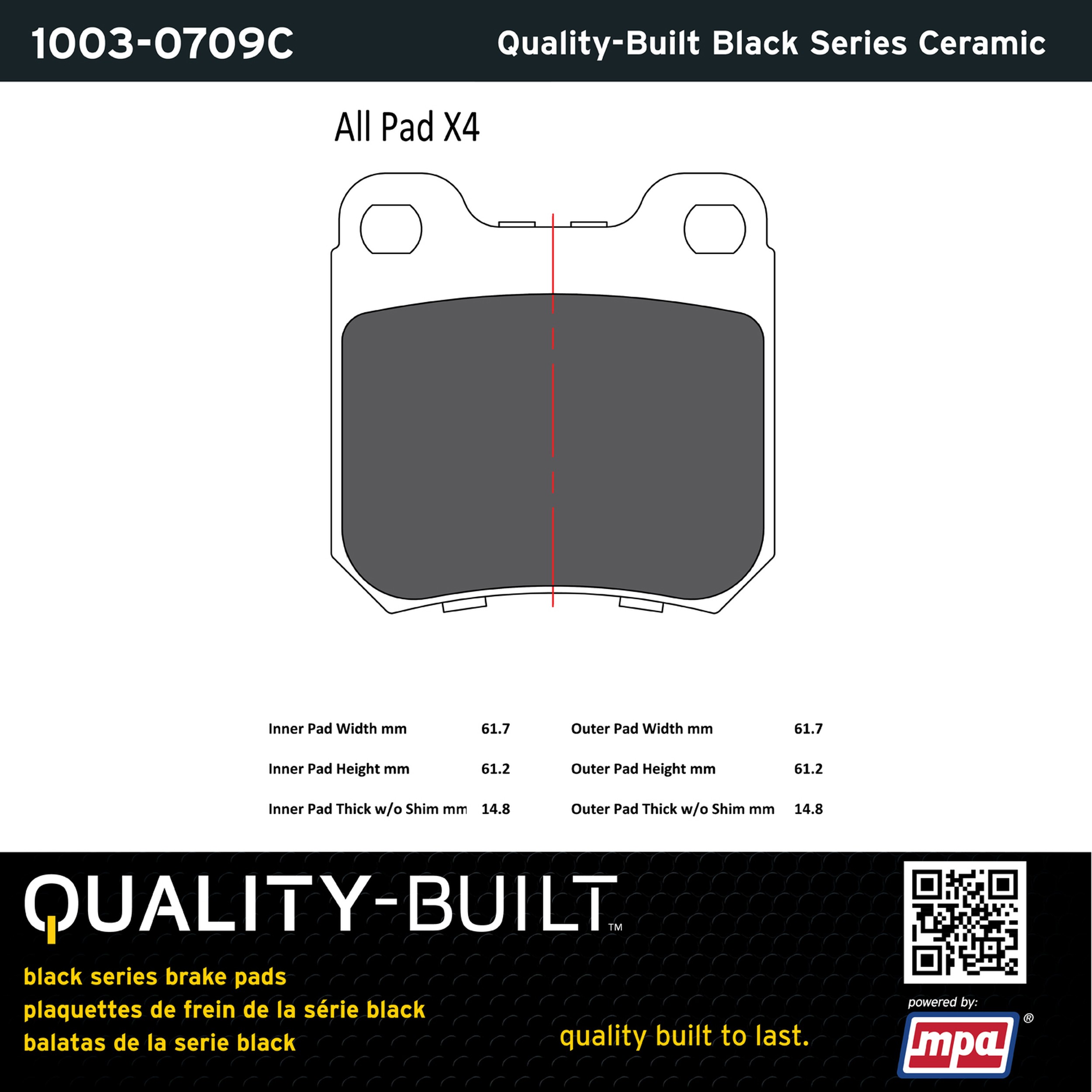 - Quality-Built Black Series Brake Pads are the ultimate in brake pad performance, delivering smooth, reliable stopping with zero noise and low dust. Application-specific friction formulas take the guesswork out of pad selection while providing even, predictable pedal feel and fade-free stopping power across a wide thermal range. Black Series friction compounds are engineered for optimized brake system performance and improved stopping power.